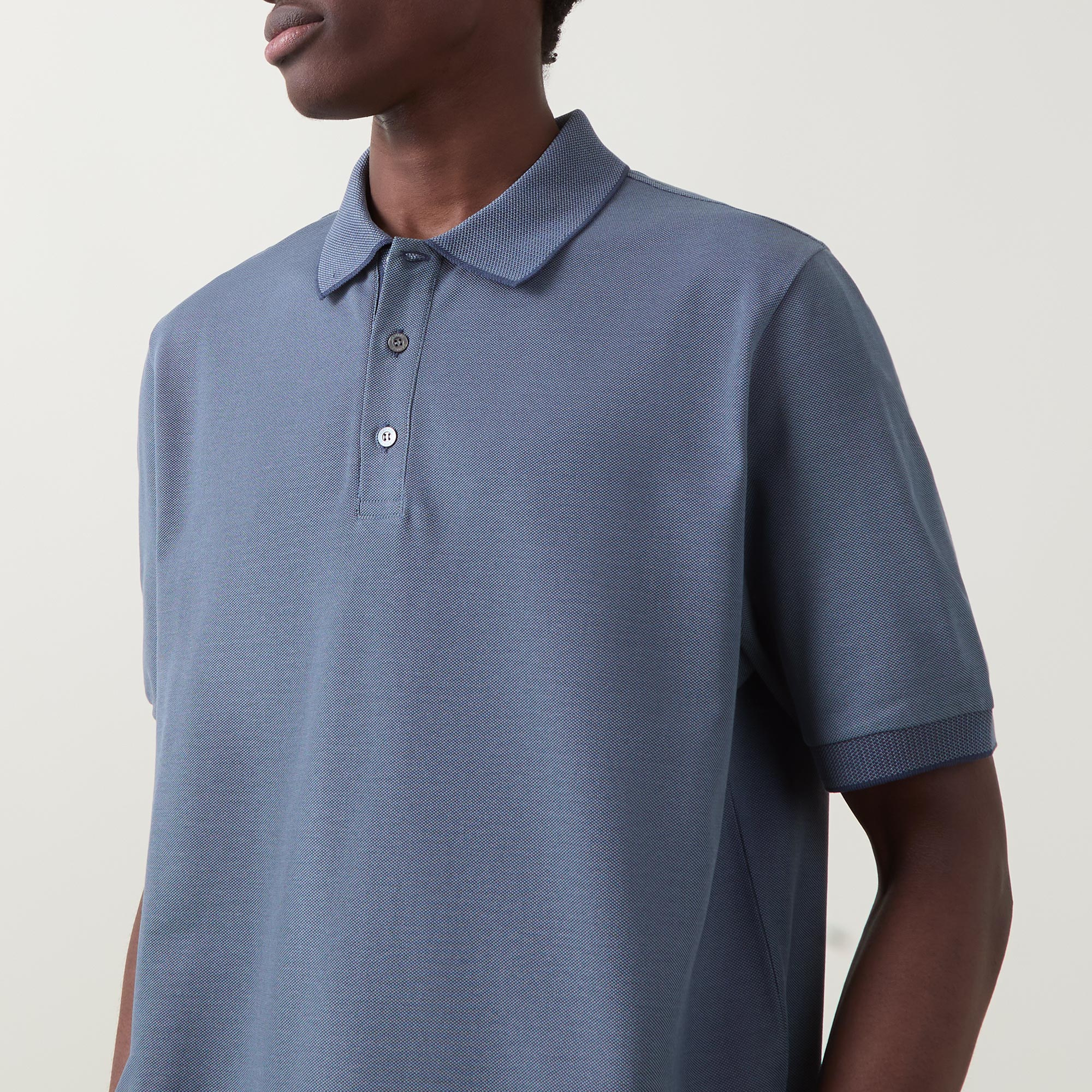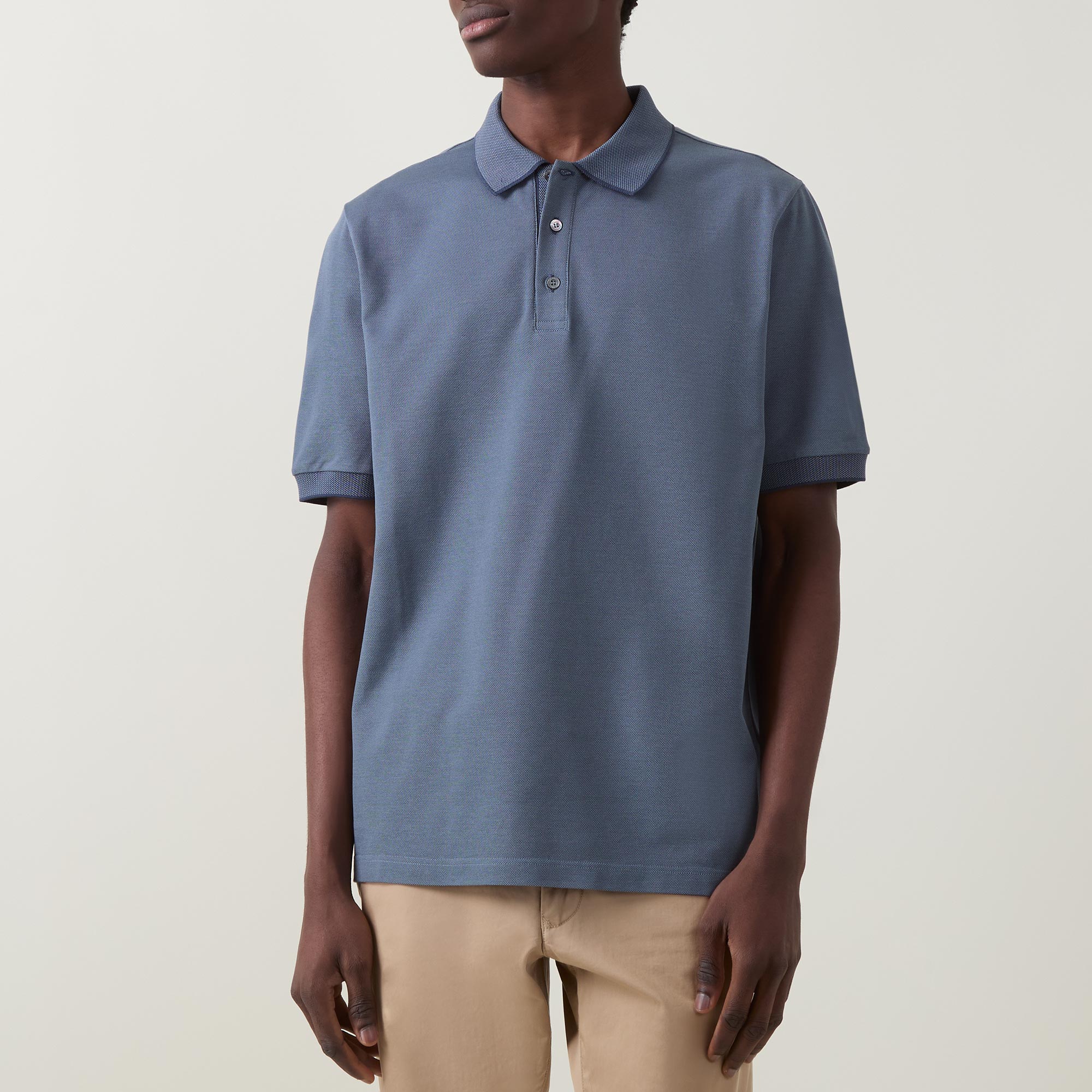 • Flat knit collar and cuffs, textured trims, button fastening, short sleeves, straight hemline, split side seams