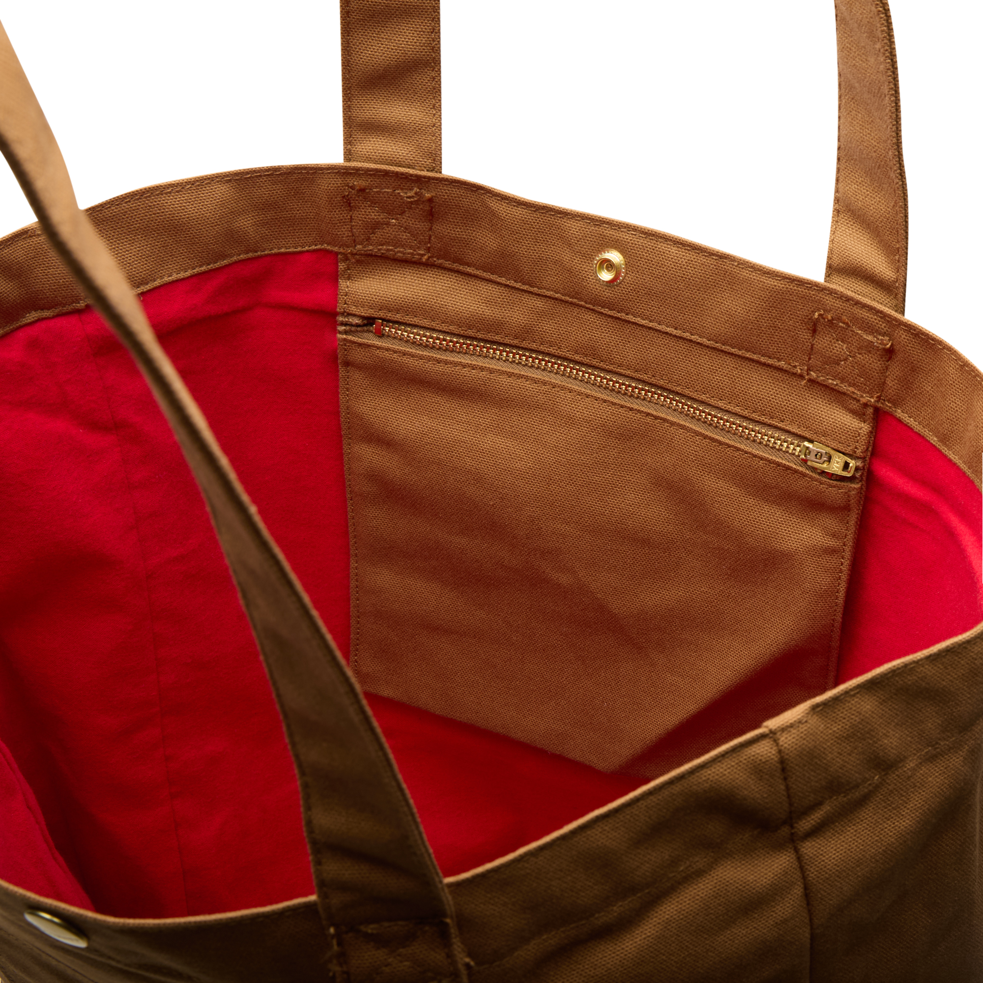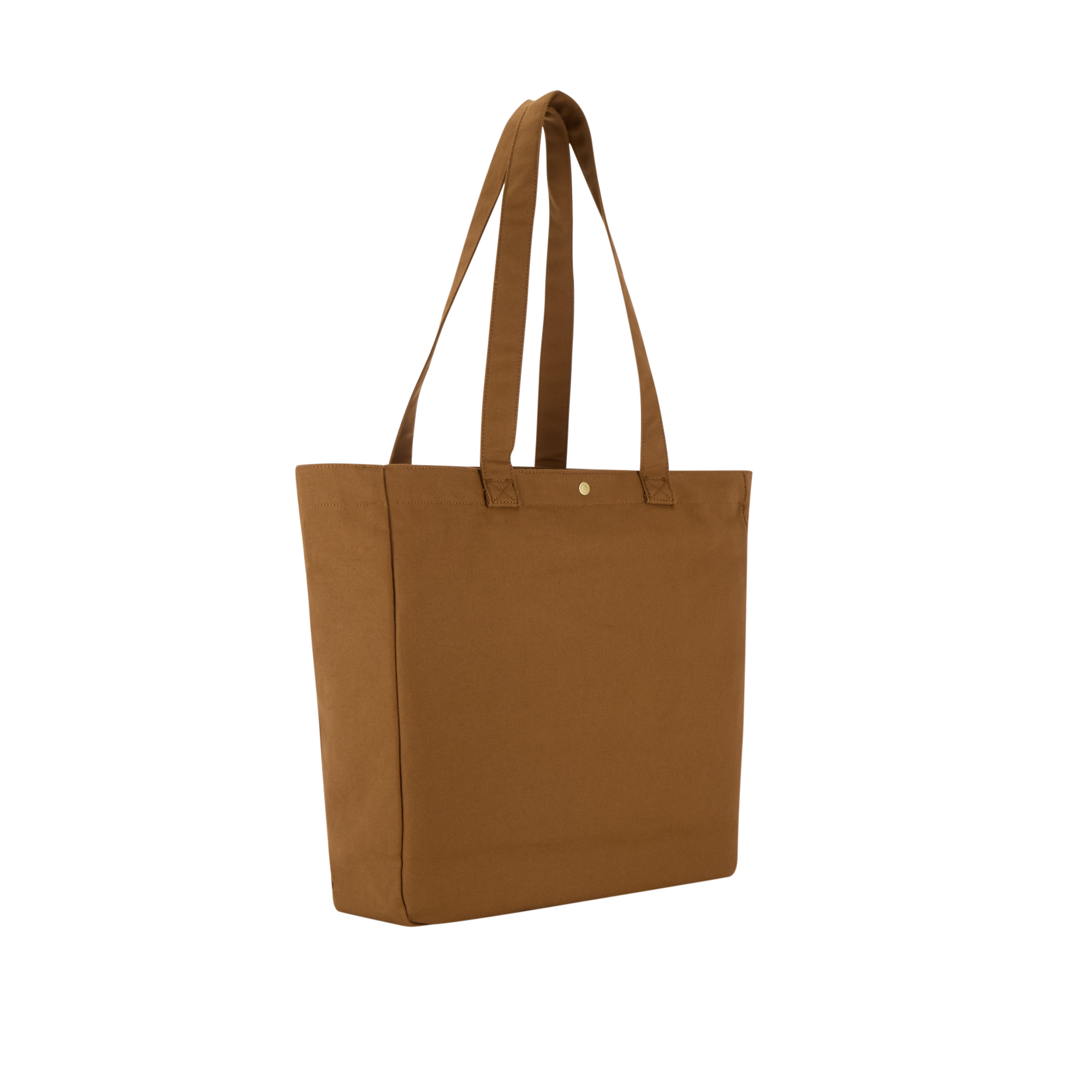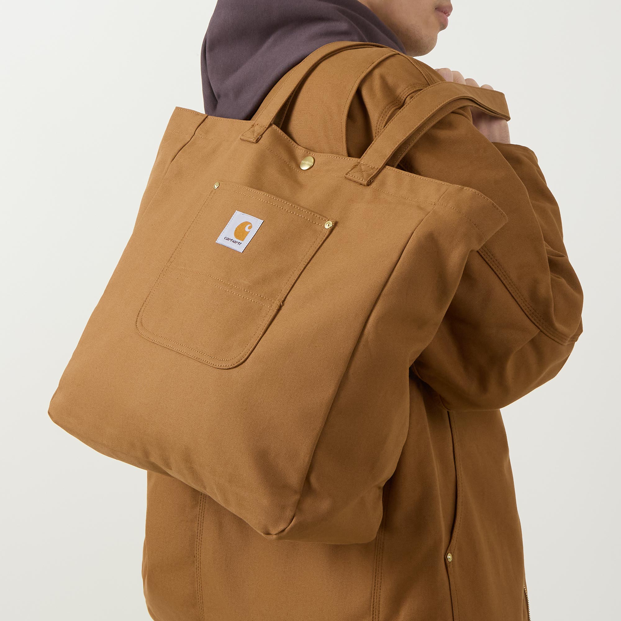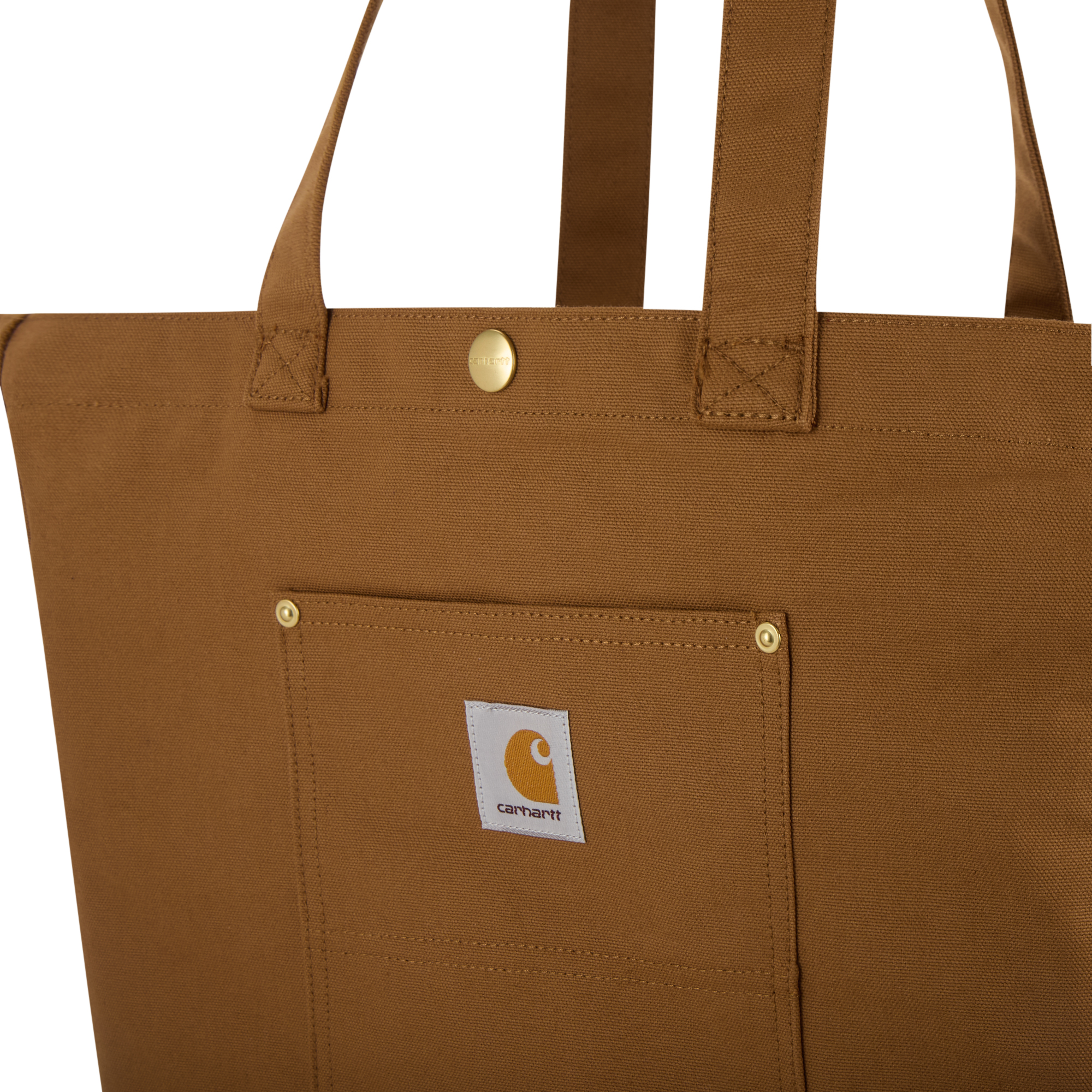 - Top carry handles, snap button fastening, gold-tone metal rivets, one exterior patch pocket, logo badge detail