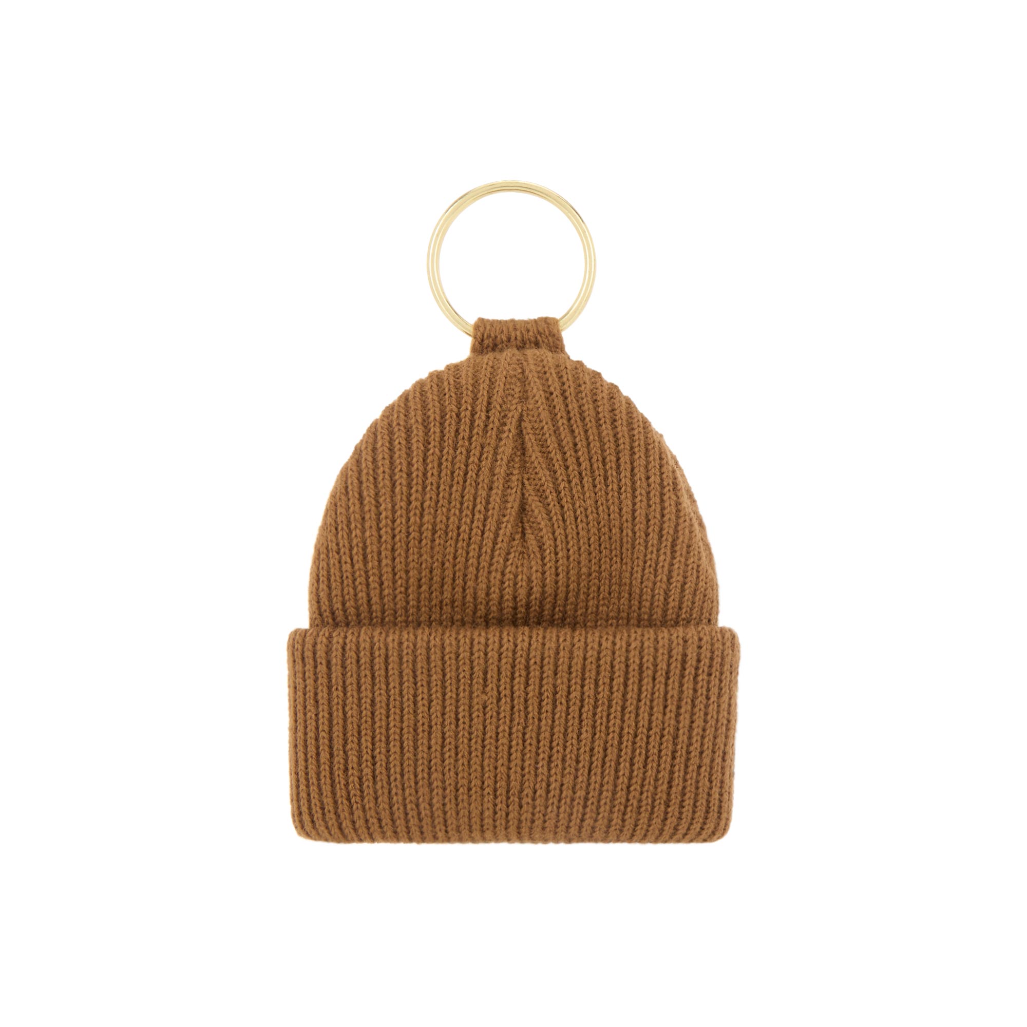 • Ring attachment, knit mini watch hat detail, square logo badge
