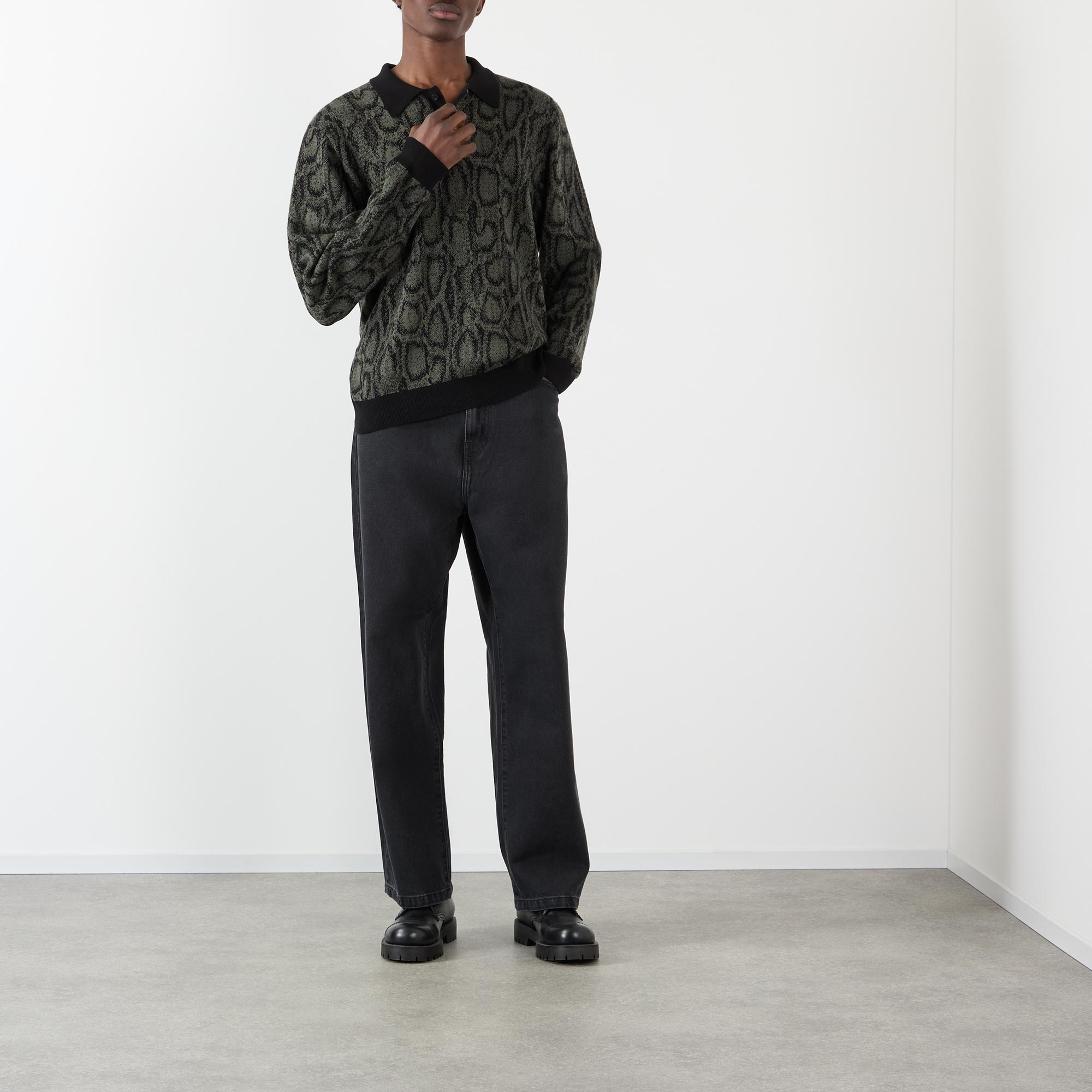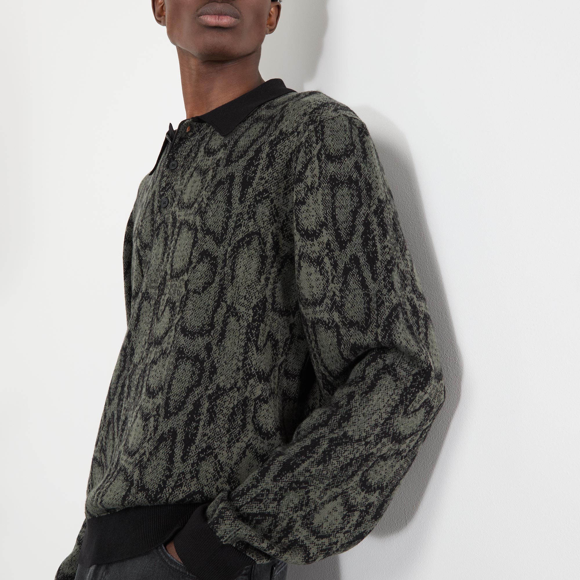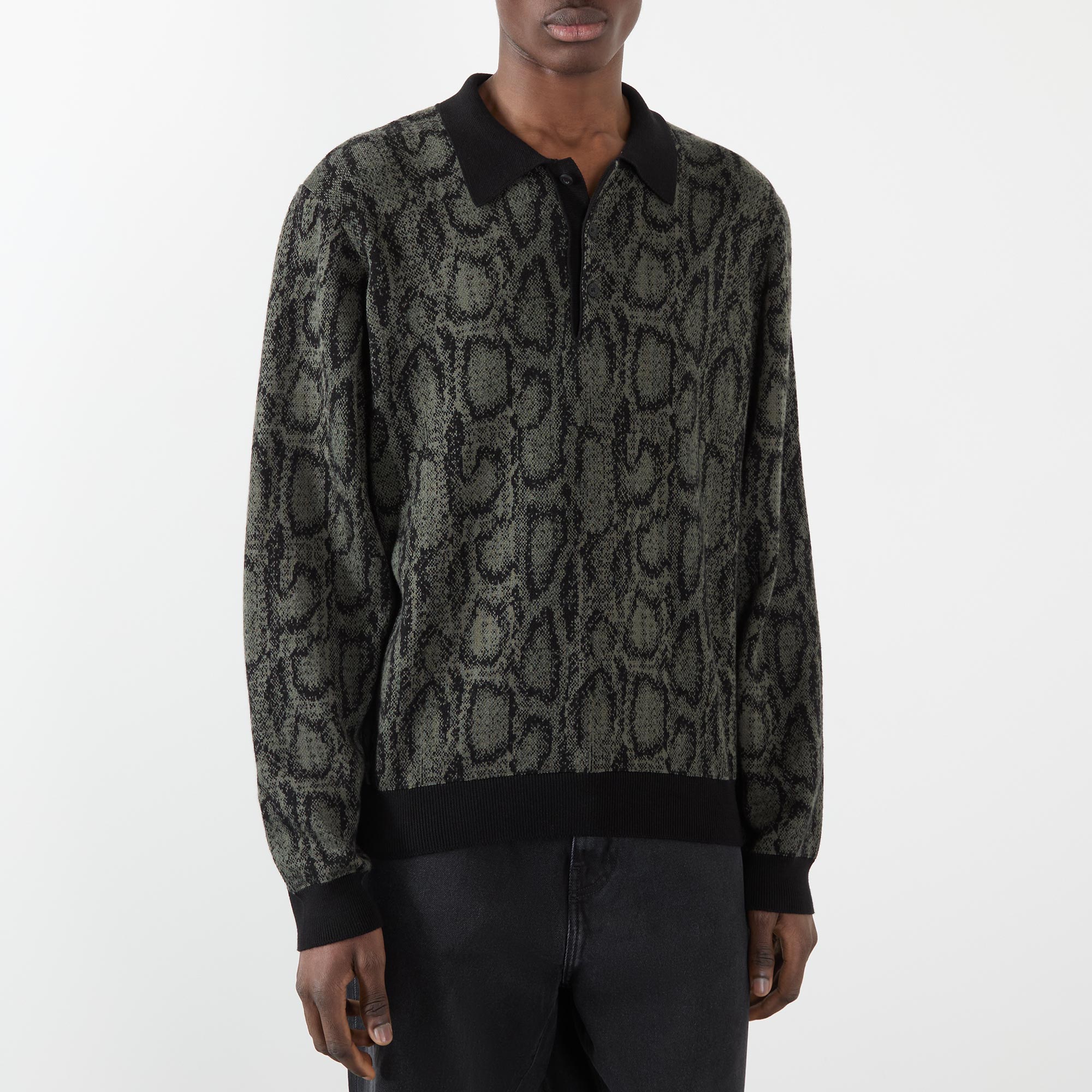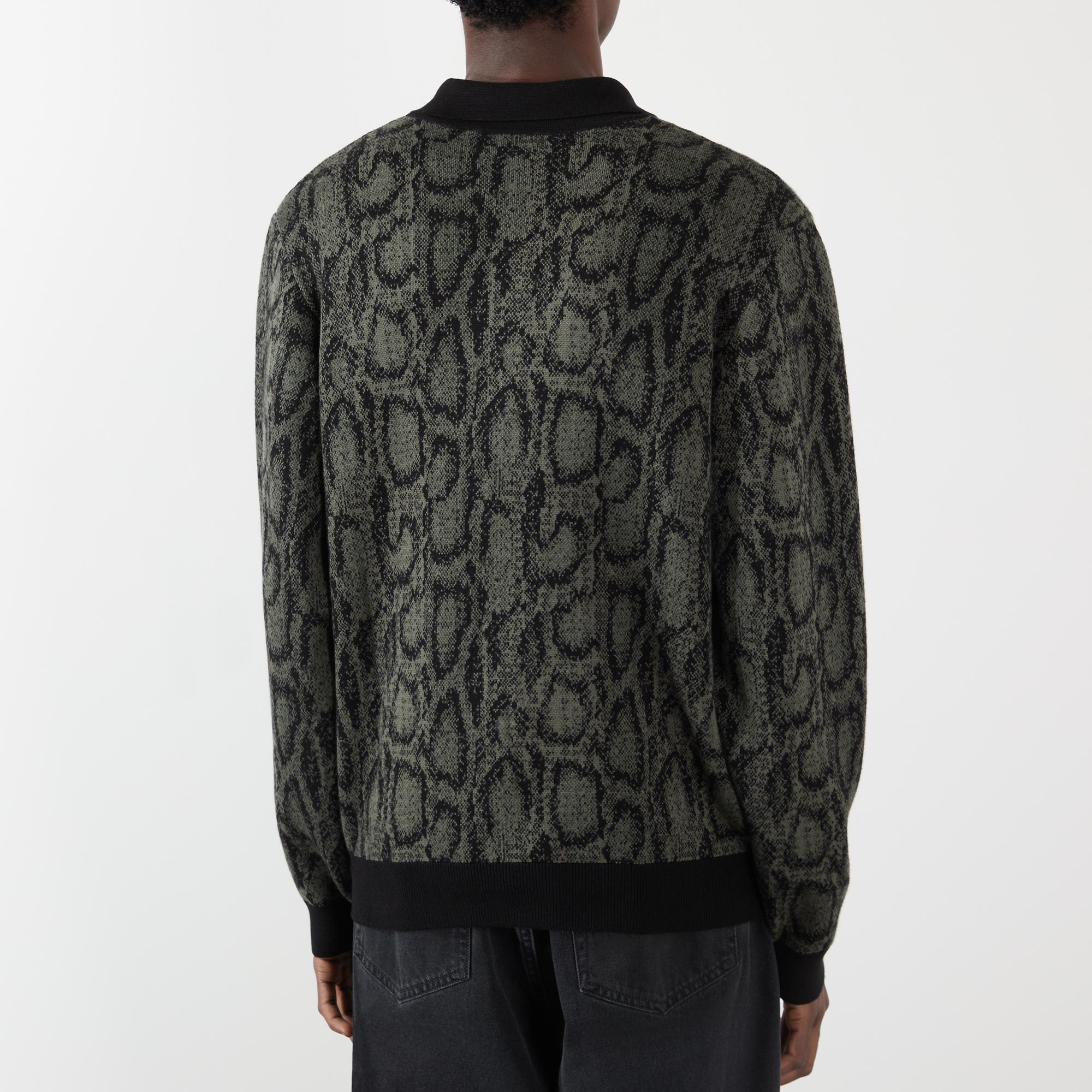 - Polo collar, three-button placket, dropped shoulders, long sleeves, straight hem, logo tag, contrast ribbed trims, snake print jacquard design, structured finish