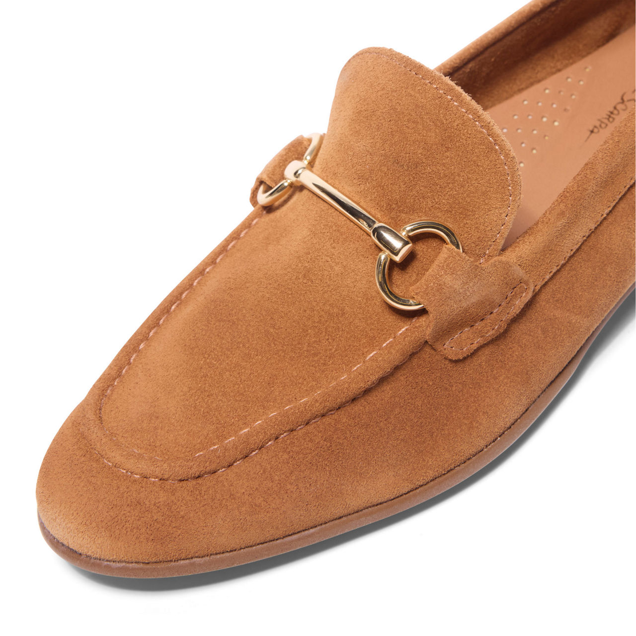 - Soft suede, almond toe, polished snaffle bar, slim heel, loafer silhouette, slip‑on style, leather lining, cushioned insole