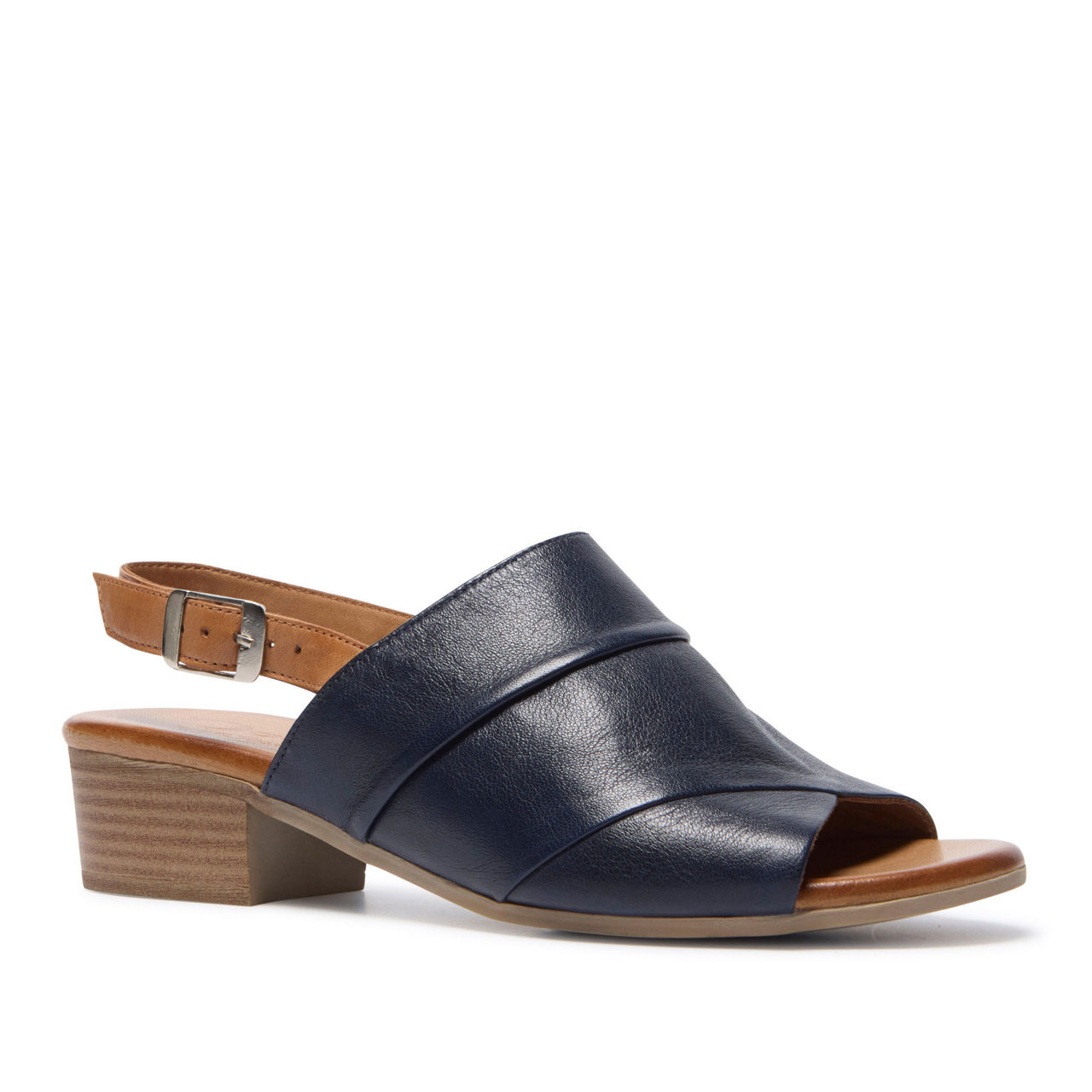 • Ruched leather vamp, peep-toe silhouette, adjustable ankle strap, slingback style, low heel, polished buckle, cushioned footbed, flexible rubber sole