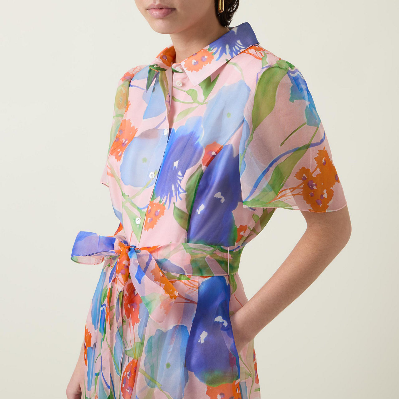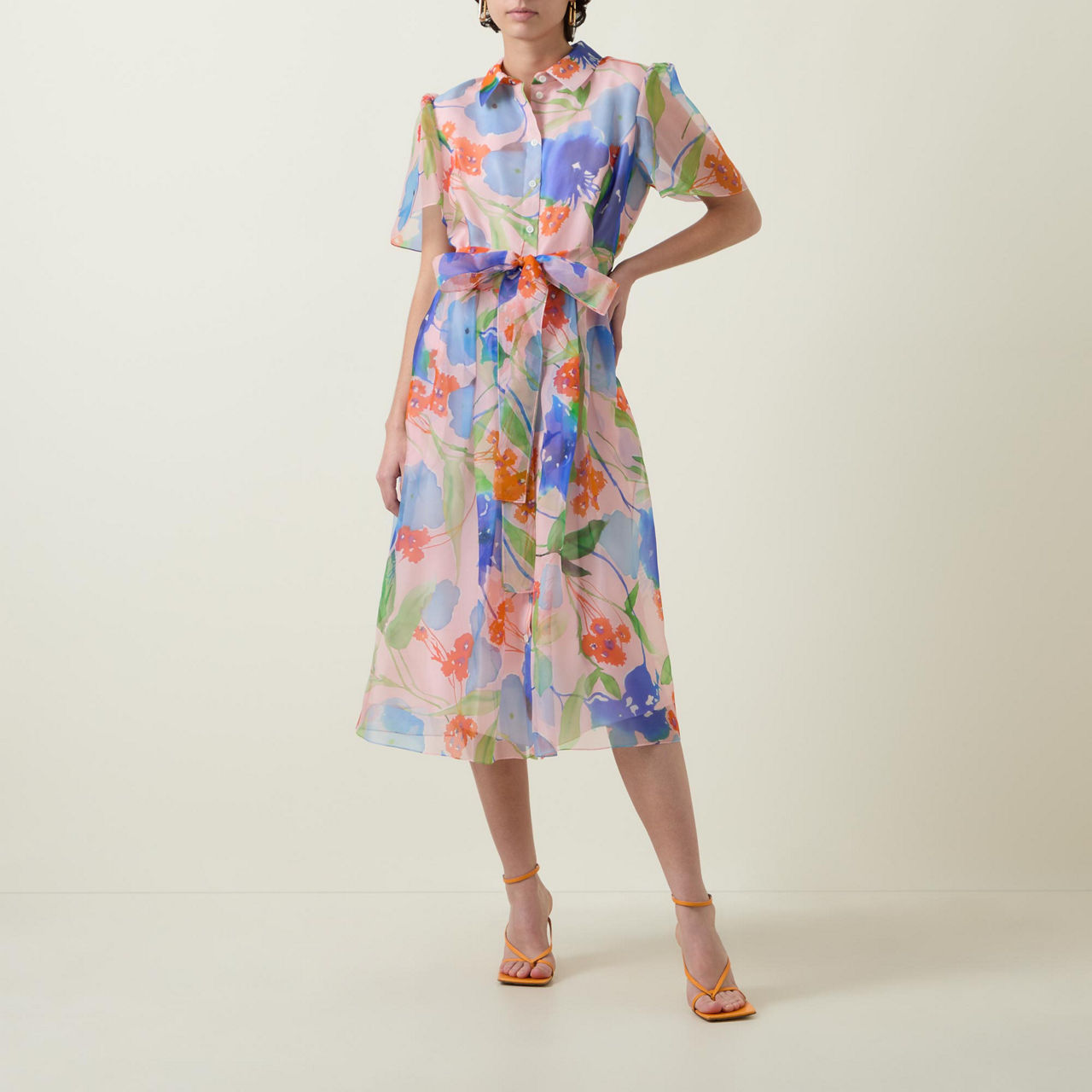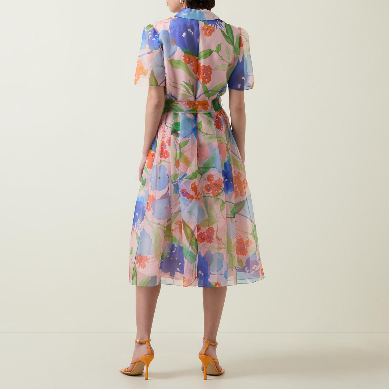 - Shirt collar, short flared sleeves, front button fastening, self-tie waist belt, pleated skirt, flared hem, all-over floral print, silk organza fabric, midi length