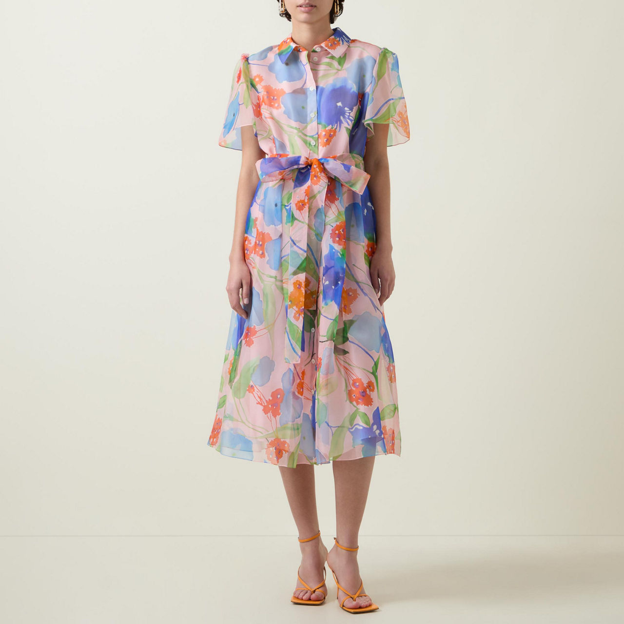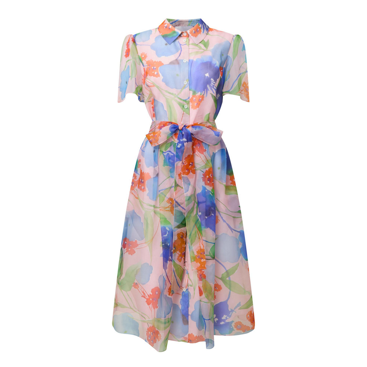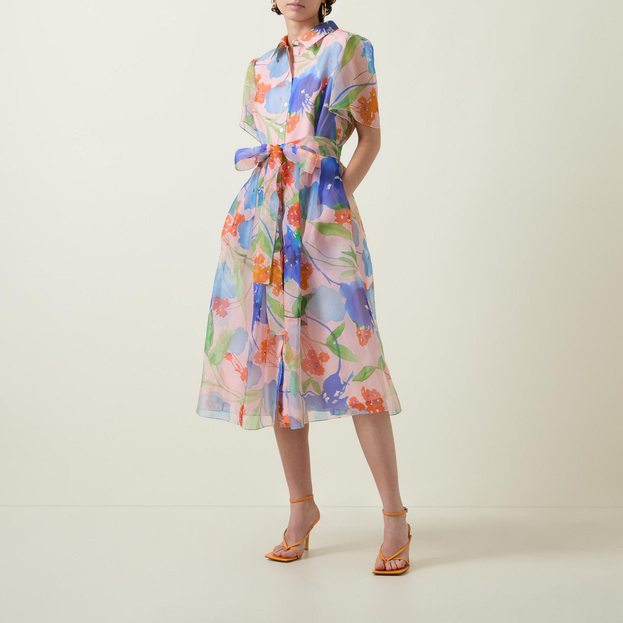 - Shirt collar, short flared sleeves, front button fastening, self-tie waist belt, pleated skirt, flared hem, all-over floral print, silk organza fabric, midi length