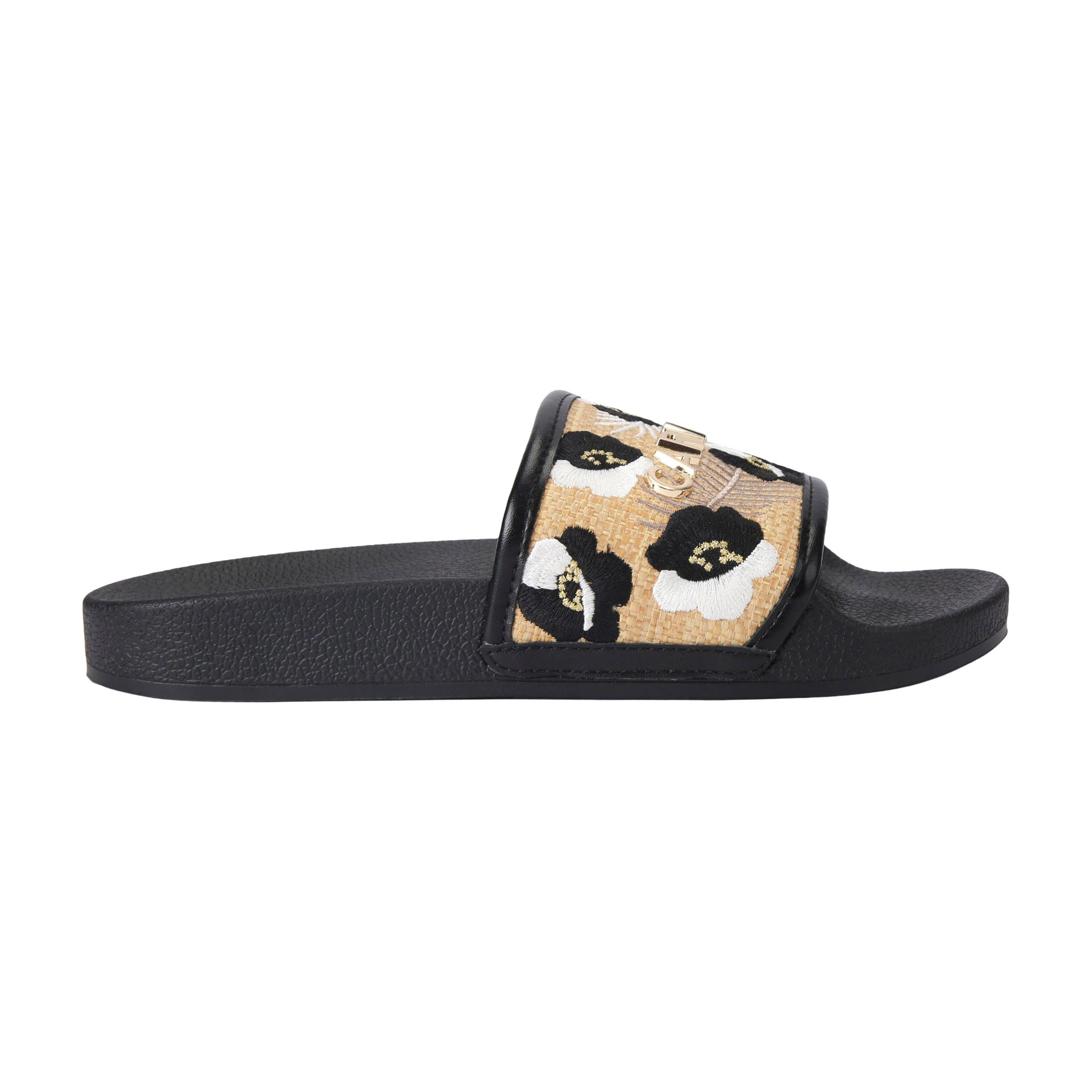 • Raffia upper, embroidered floral details, gold-tone branding, front toe strap