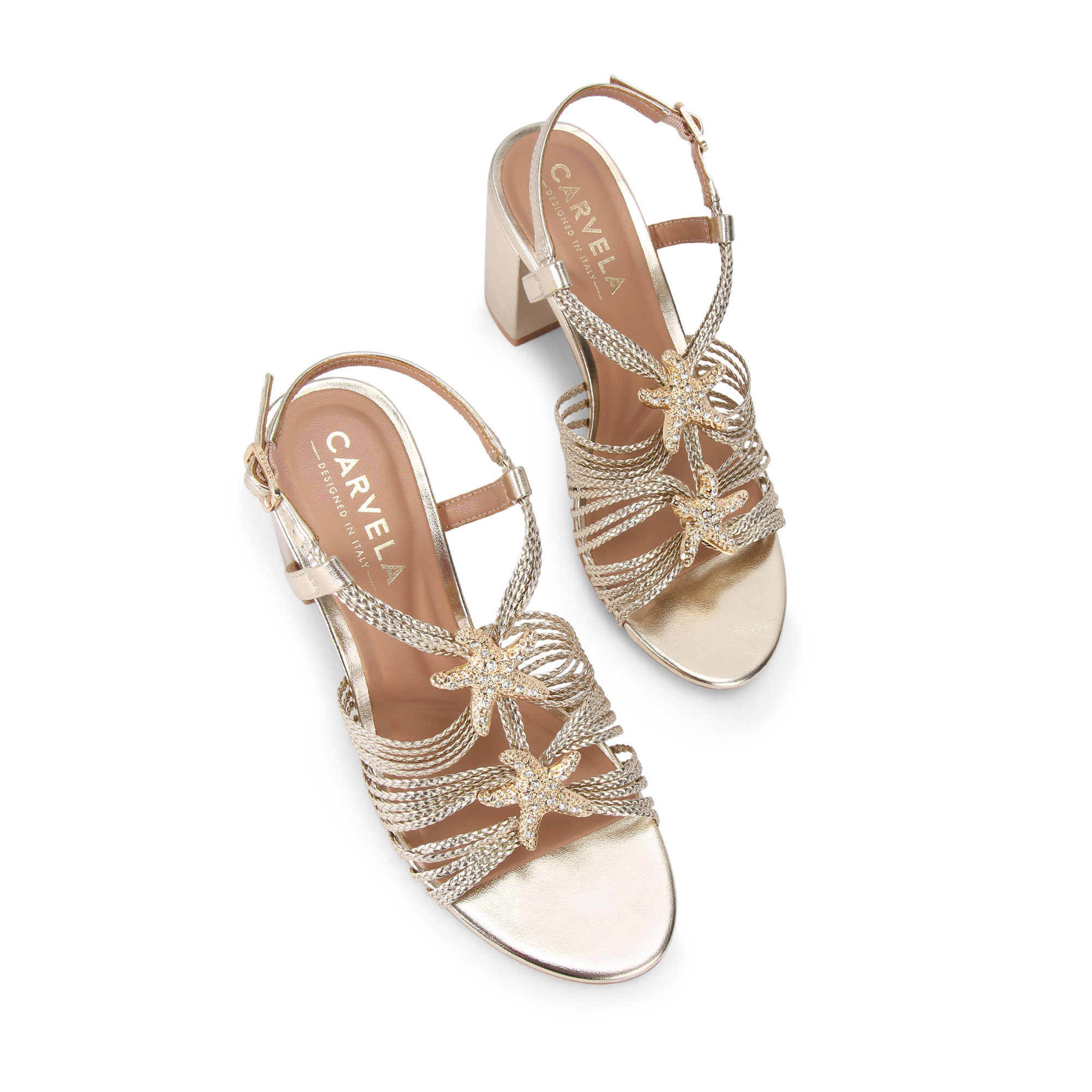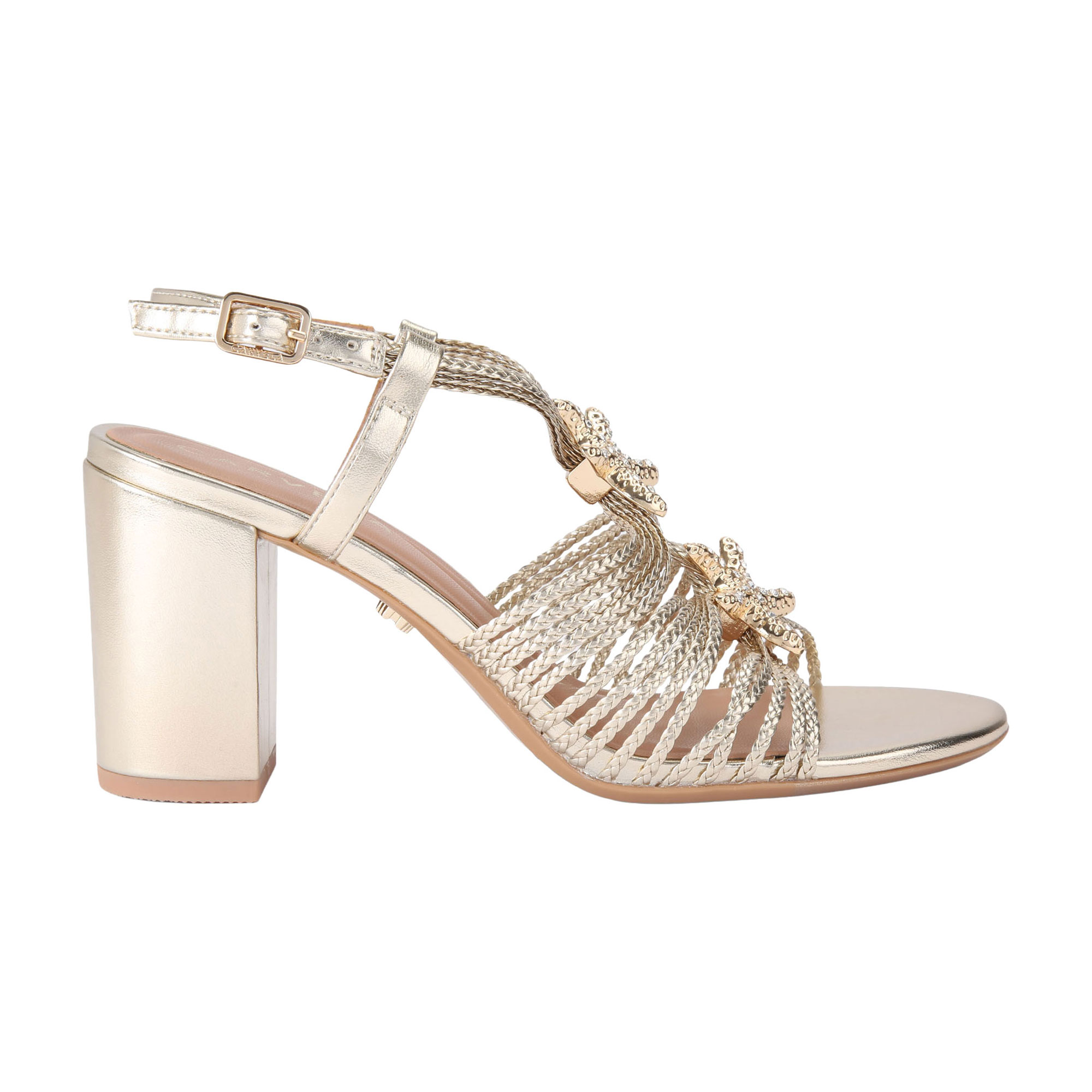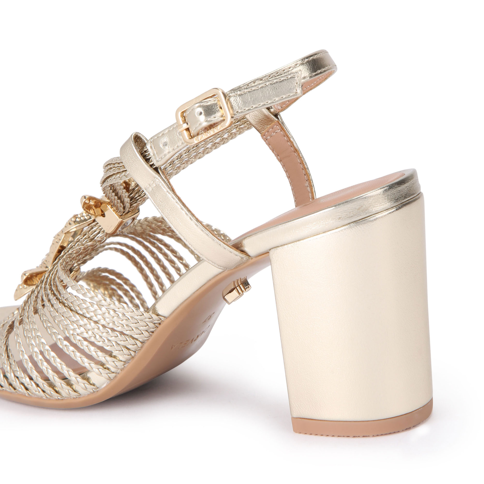 - High block heel, multiple braided foot straps, gold-tone starfish details
