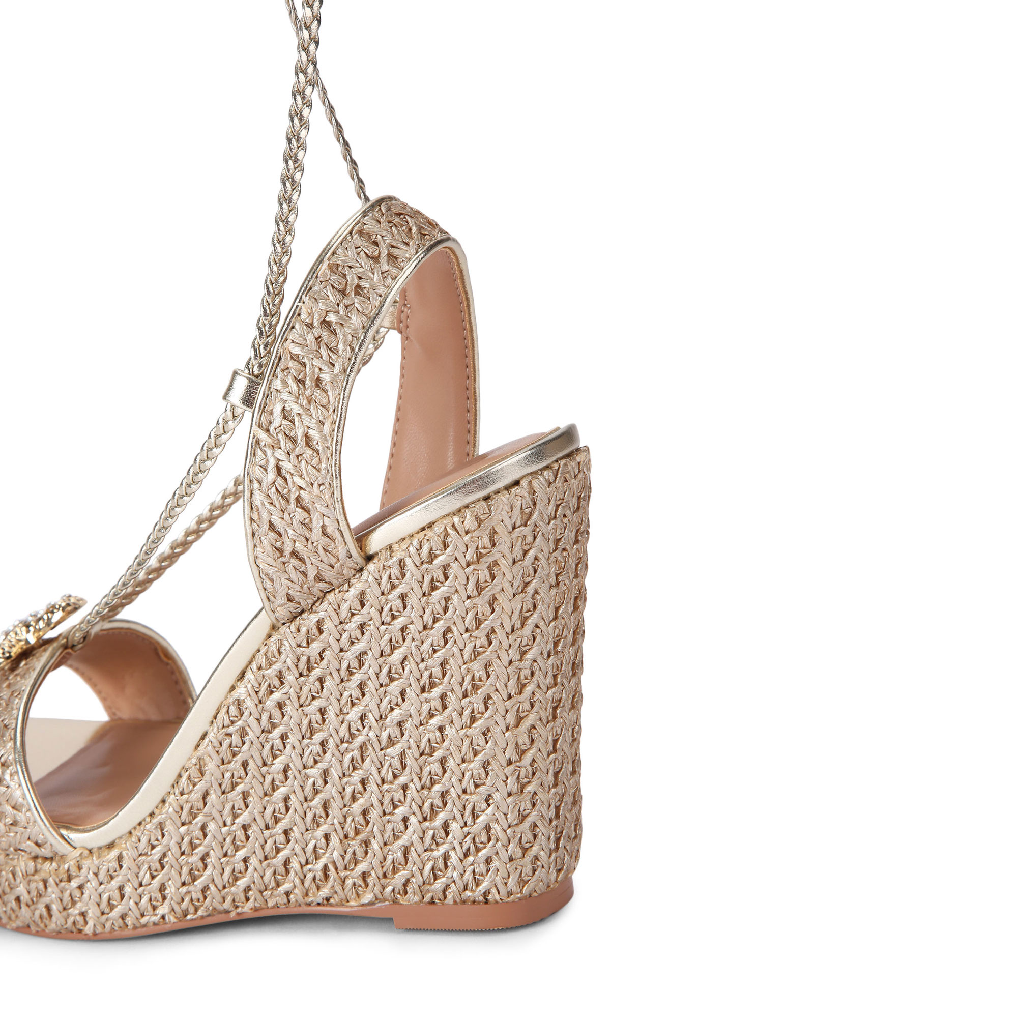 - High wedge heel, gold-tone raffia fabric, gold-tone braided lace ankle strap