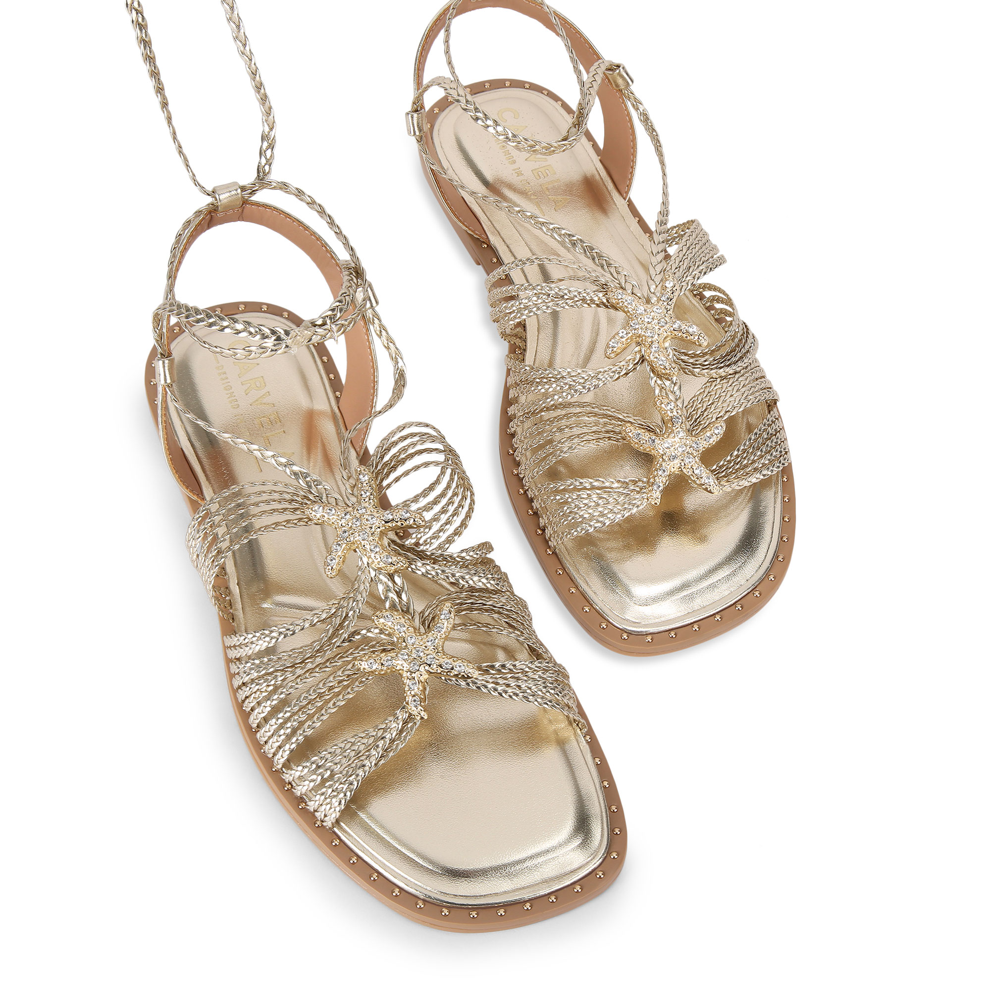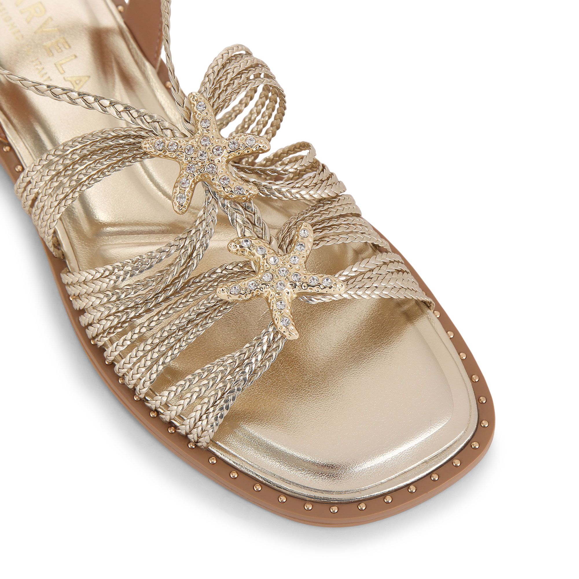 - Flat sole, multiple braided foot straps, gold-tone starfish details