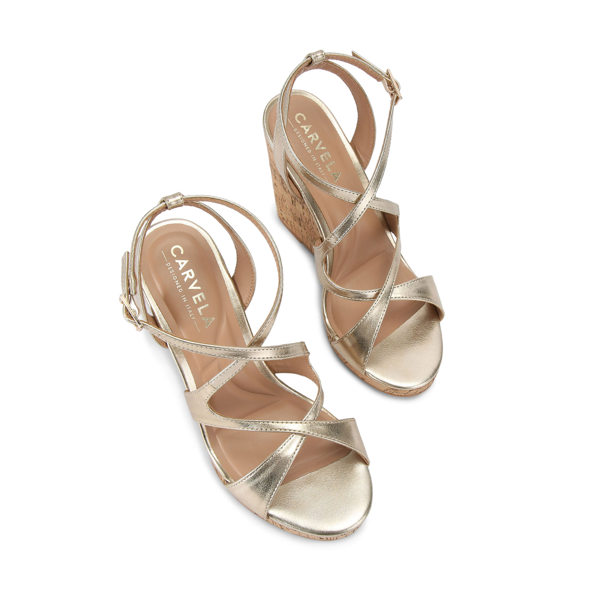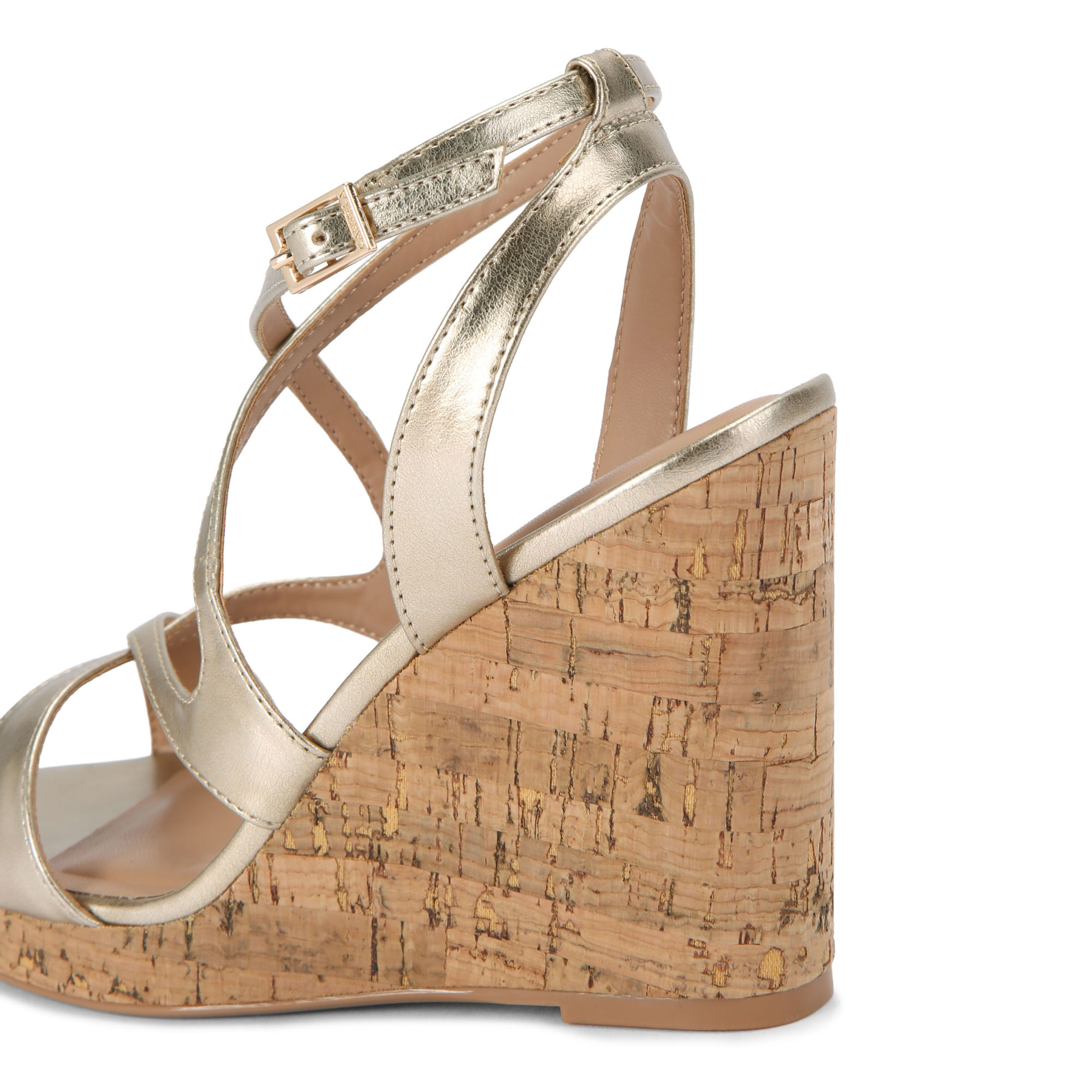 - Crossed metallic leather alternative straps, buckle fastening, gold-tone hardware, cork wedge heel