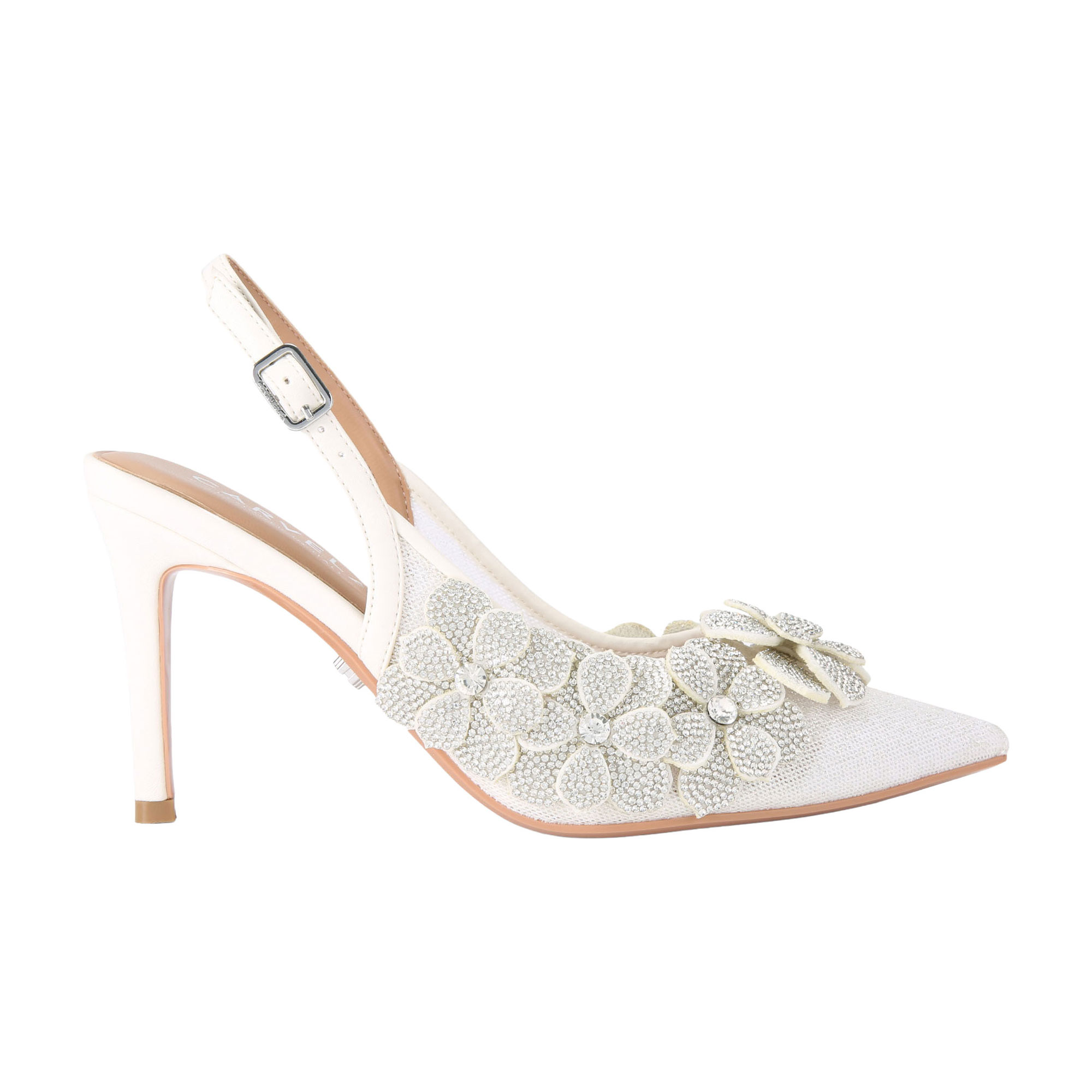 - Metallic upper, 3D flower and crystal embellishment, slingback strap, silver-tone buckle fastening