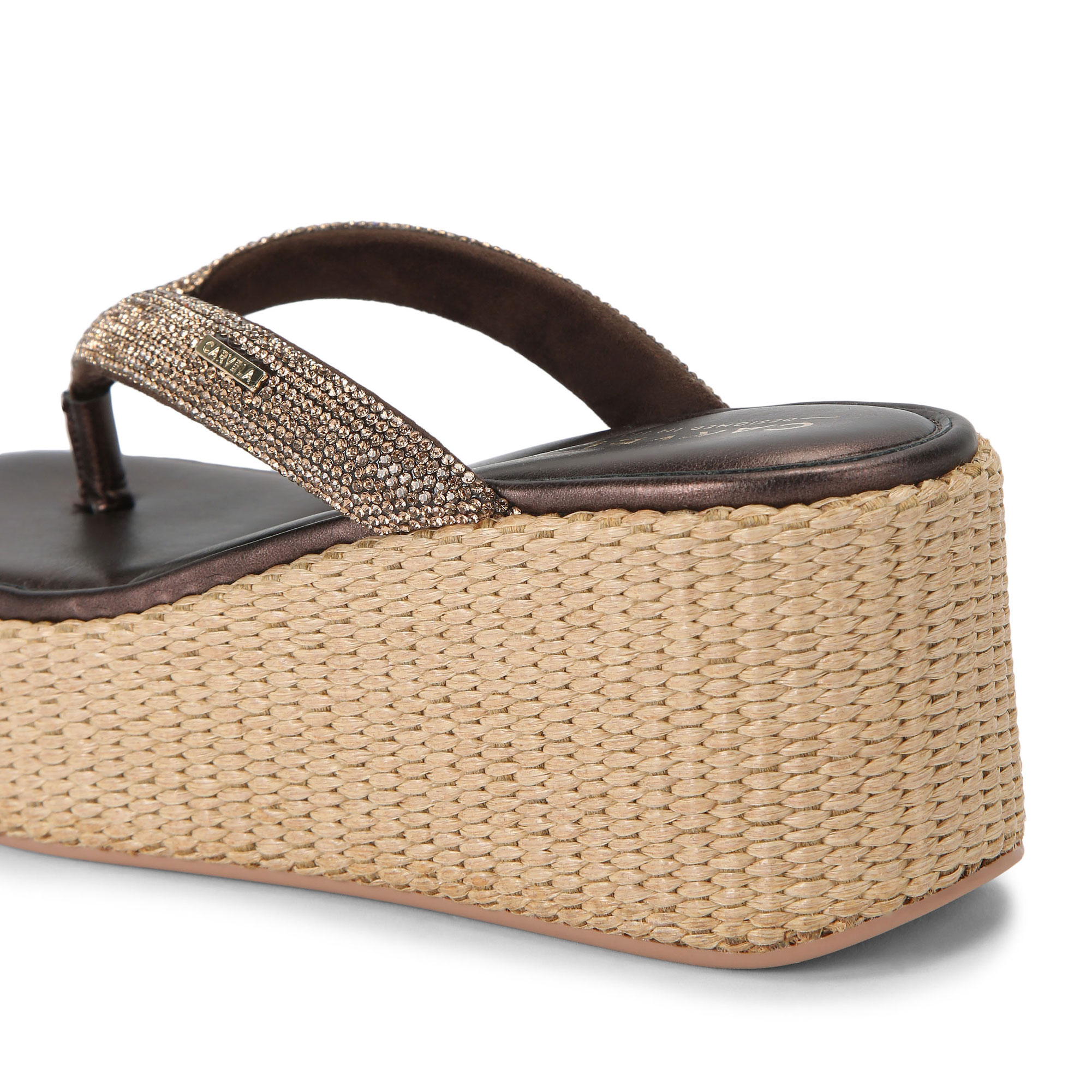 • Crystal embellished fabric, toe post strap, raffia woven chunky platform sole