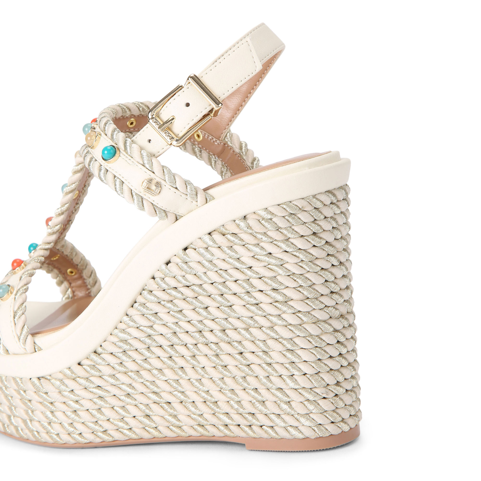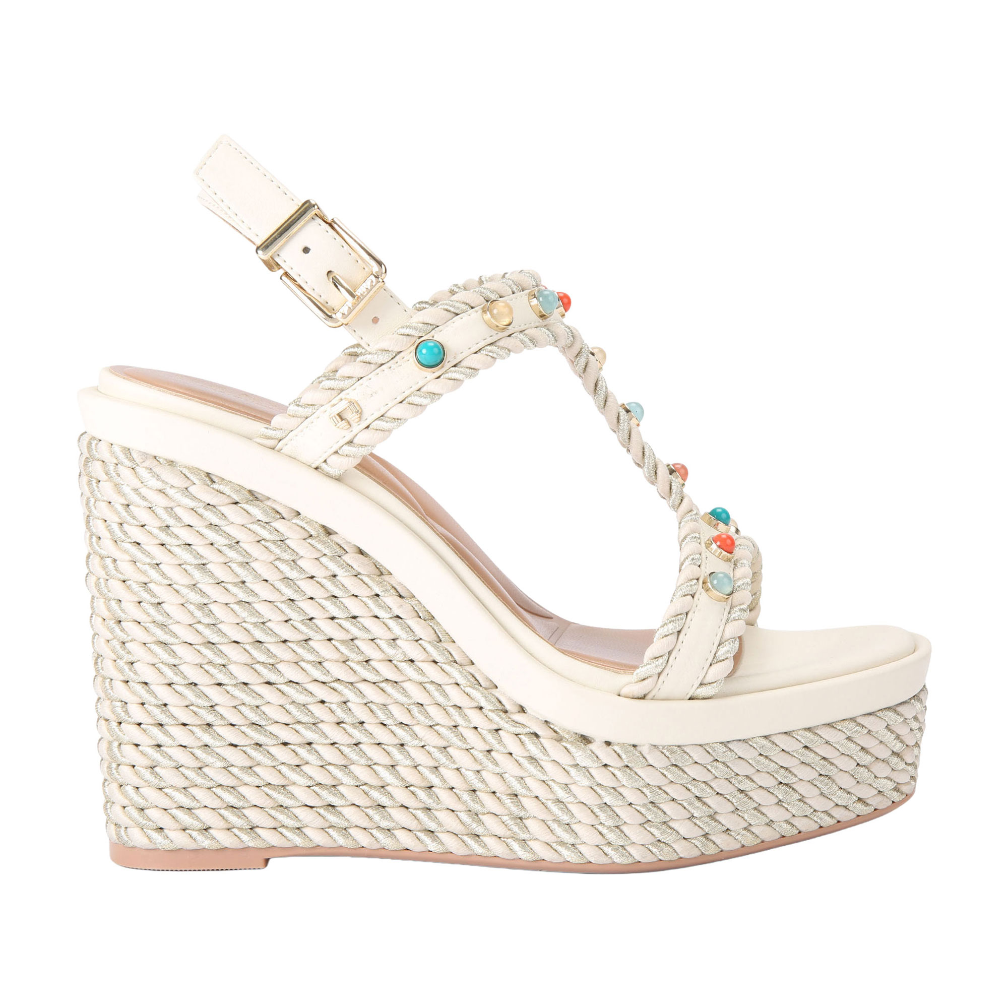 • Upper with metallic rope detail, crystal embellishments, buckle fastening, gold-tone hardware, twisted rope wedge heel