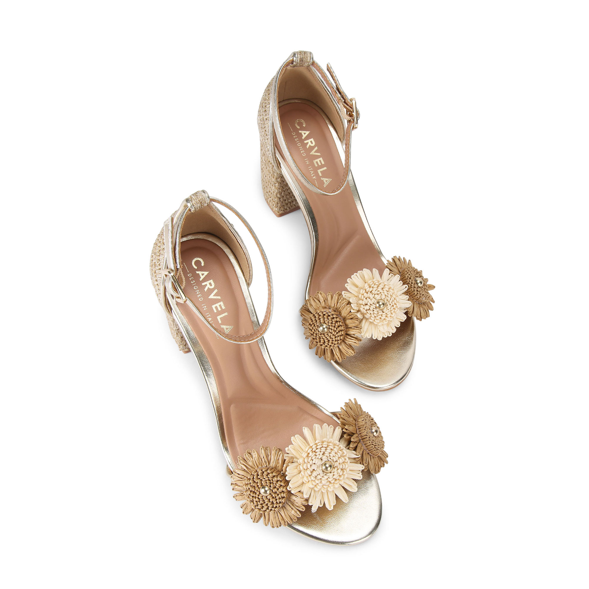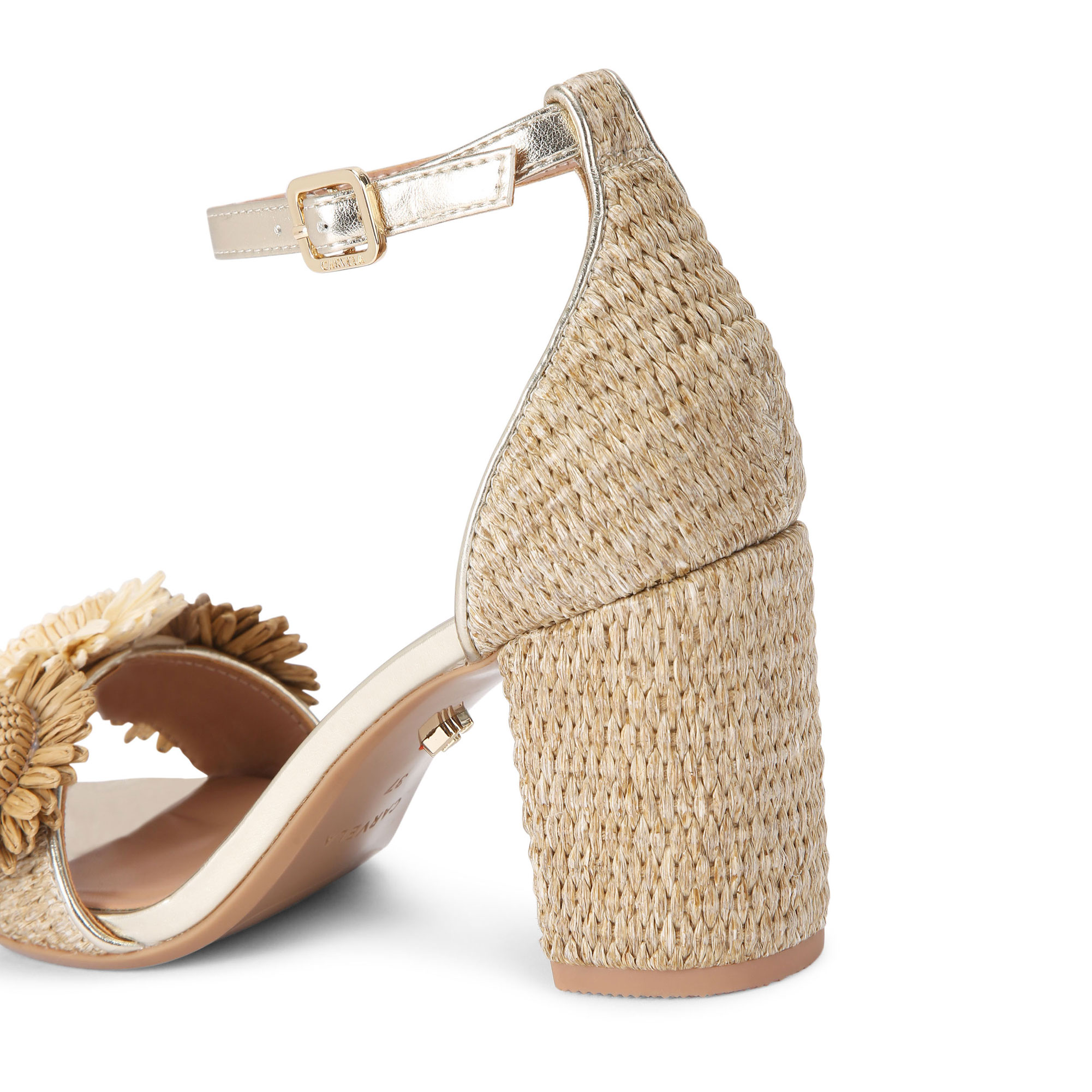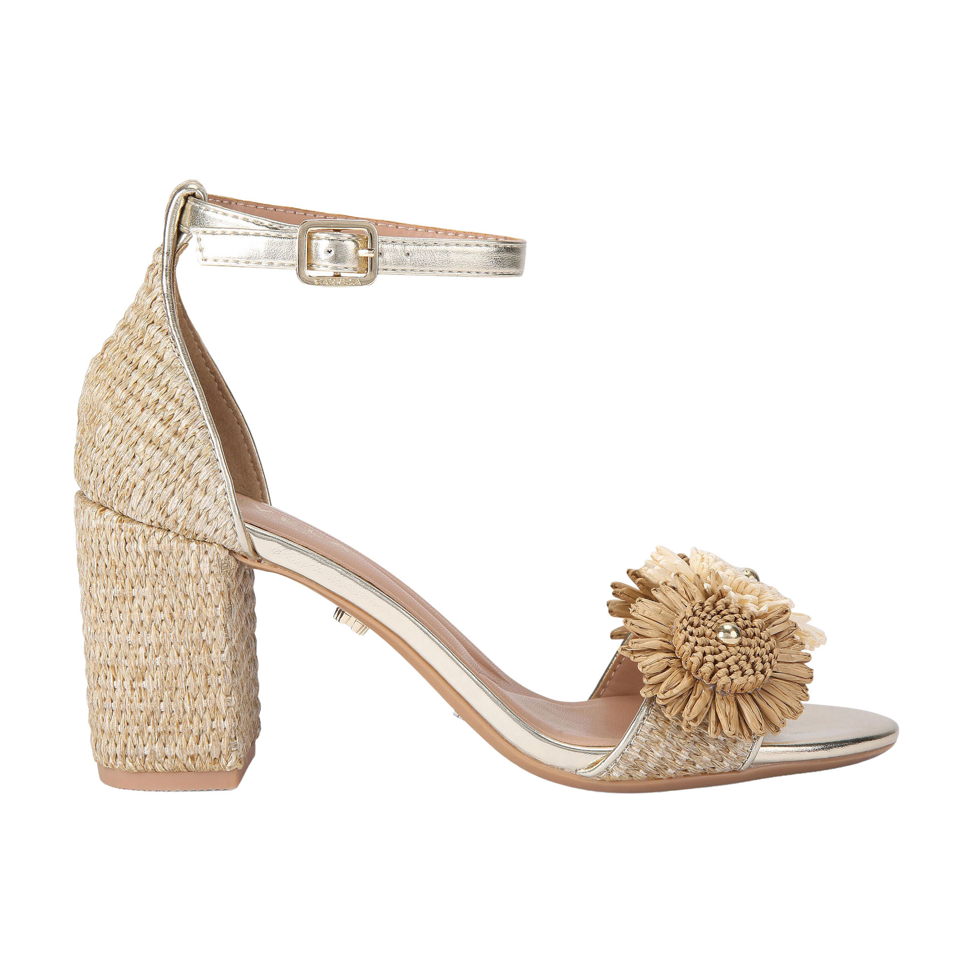 - Raffia style, 3D raffia flower detailing, ankle strap with buckle fastening, block heel with raffia design