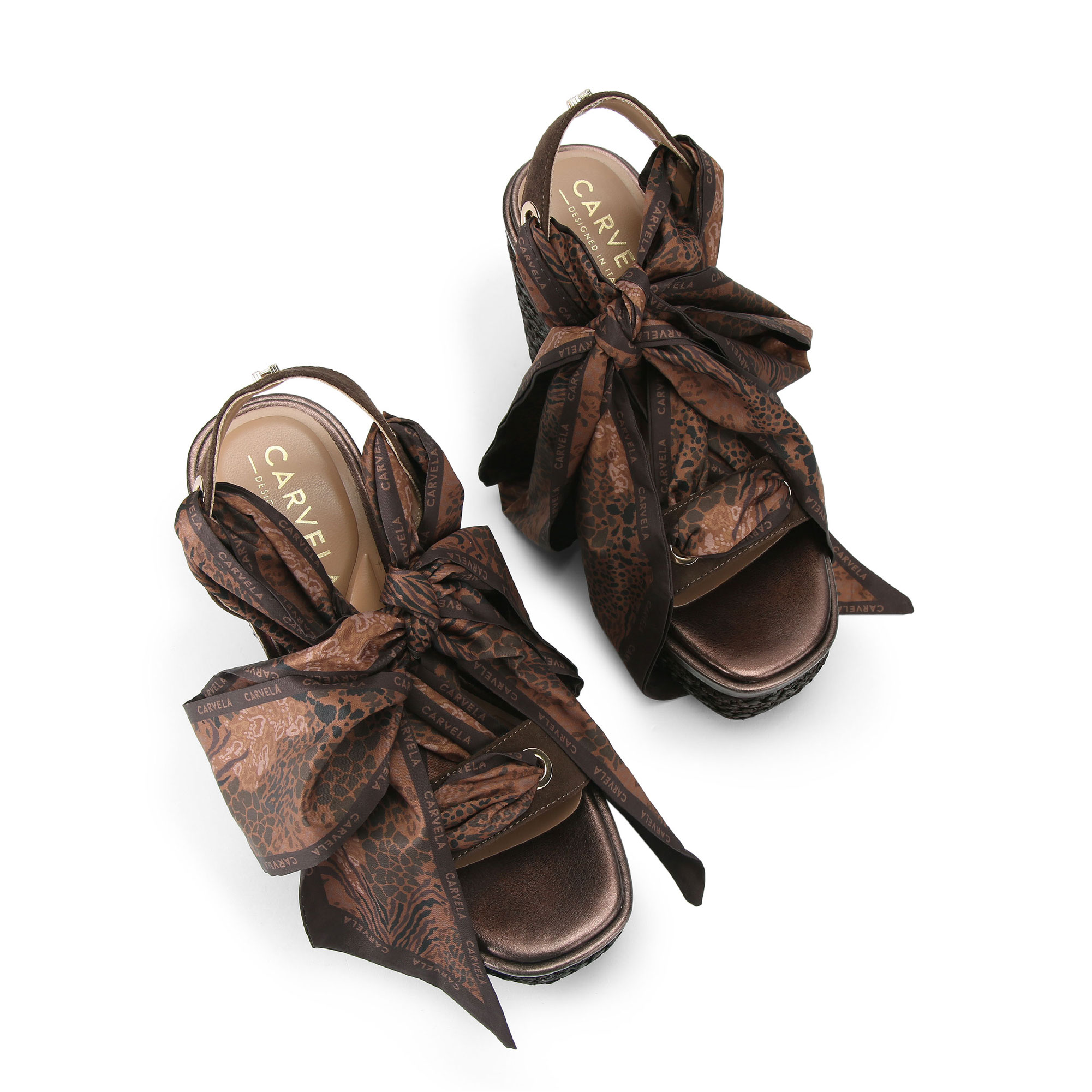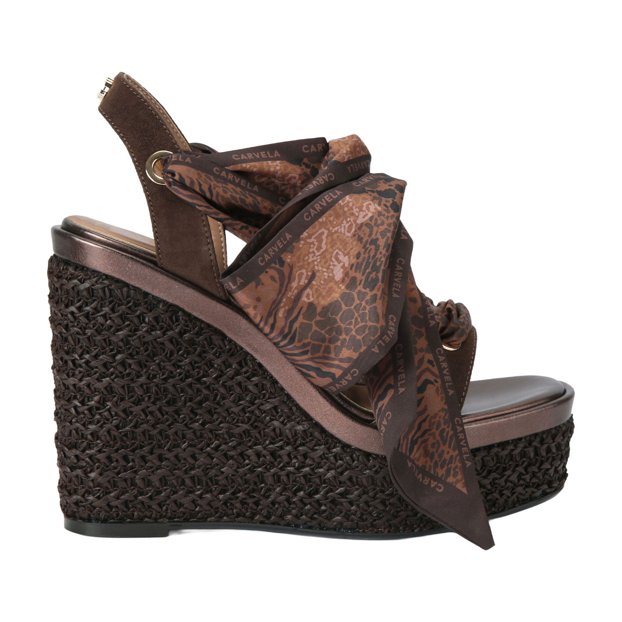 - Wedge heel, suede upper, animal print scarf detail straps, high heel, raffia style sole