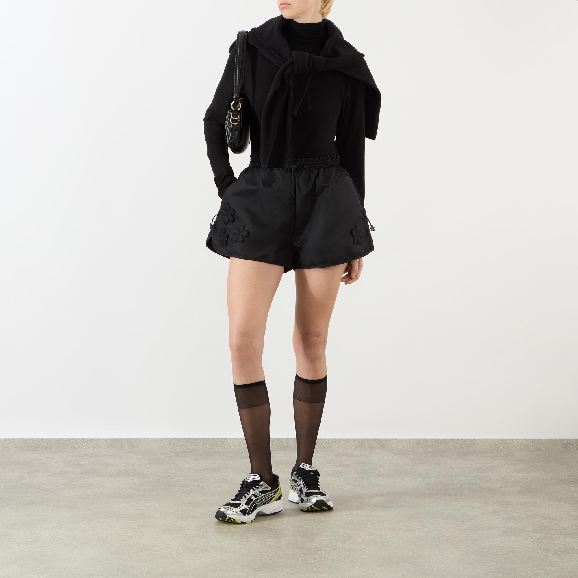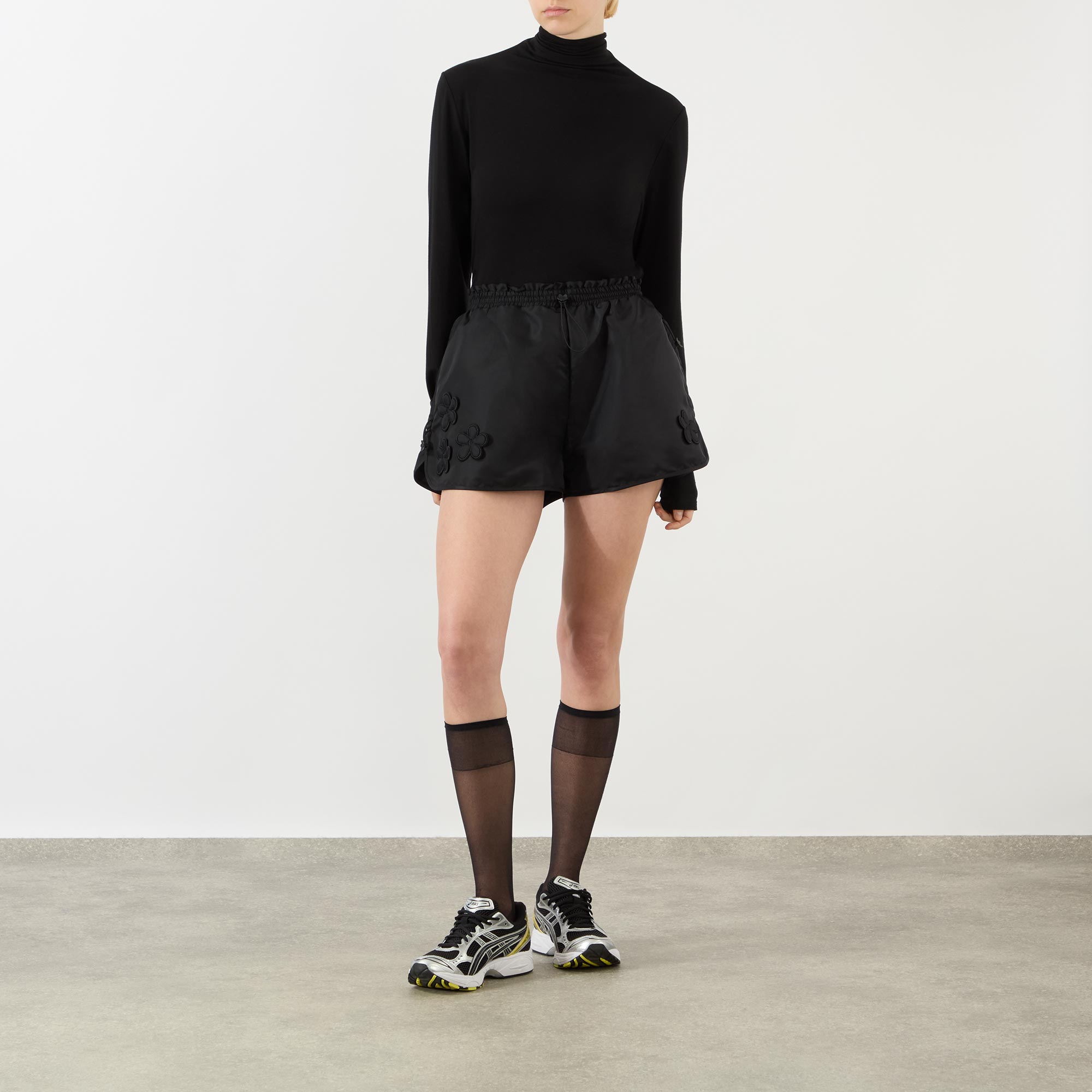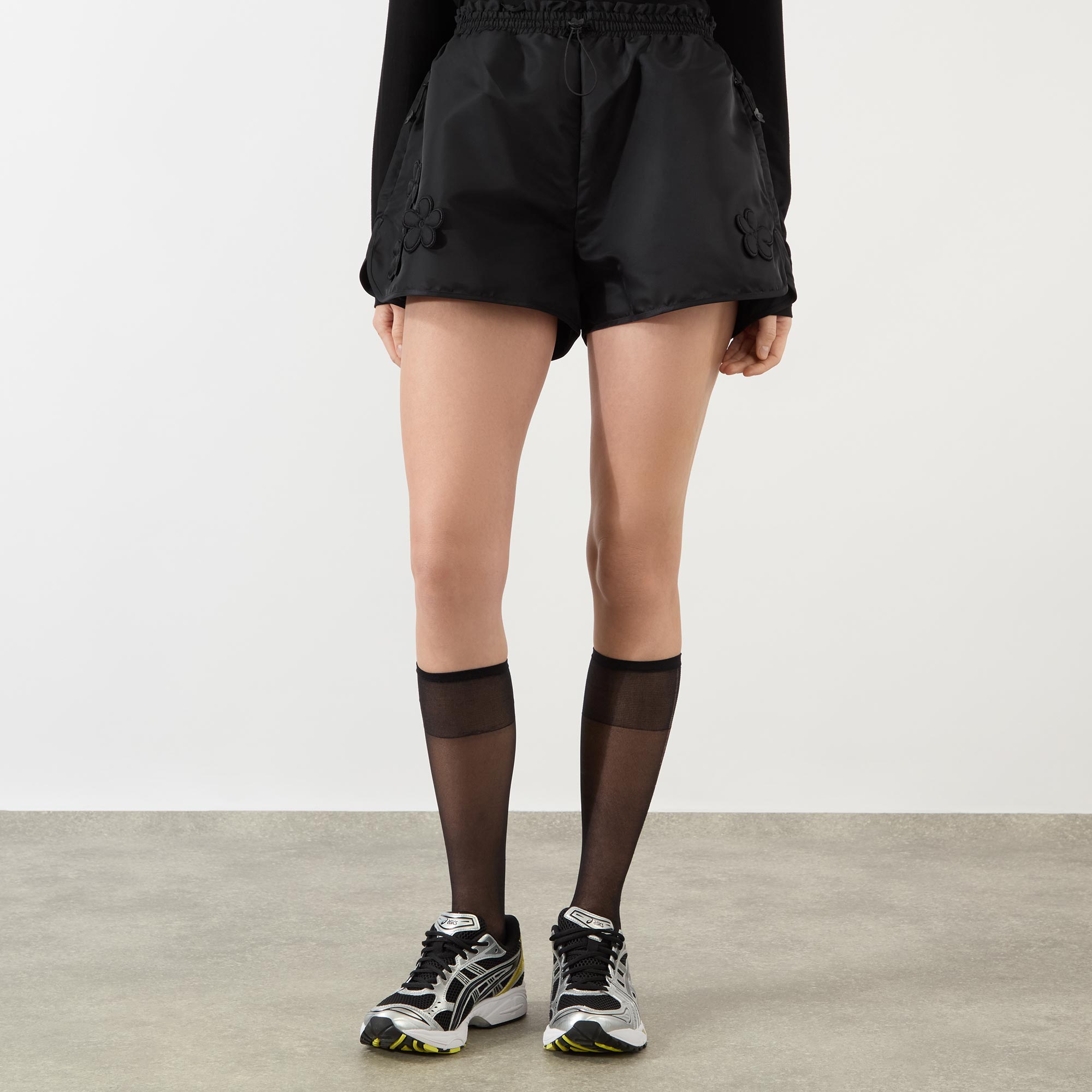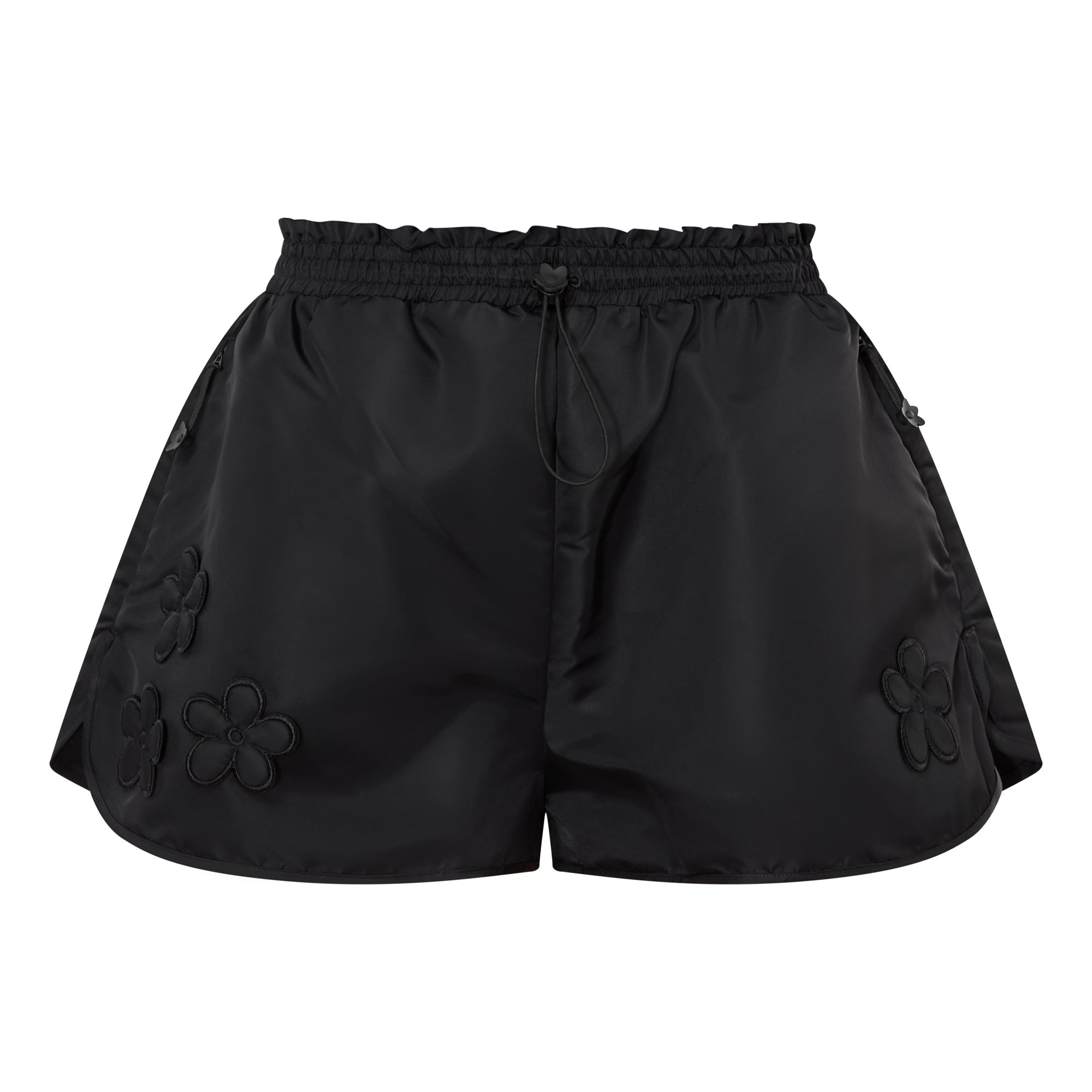 • Elasticated waistband, adjustable drawcord fastening, two side in-seam pockets, flower appliqué, nylon finish