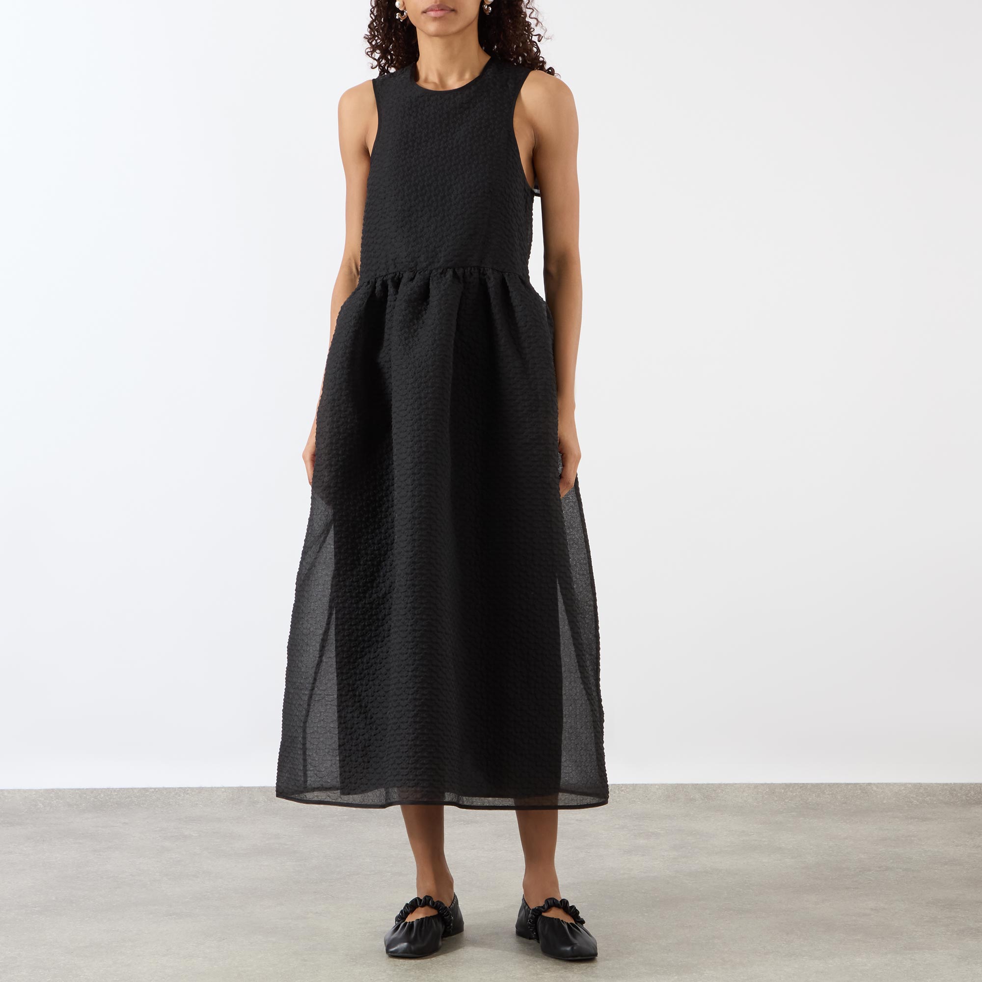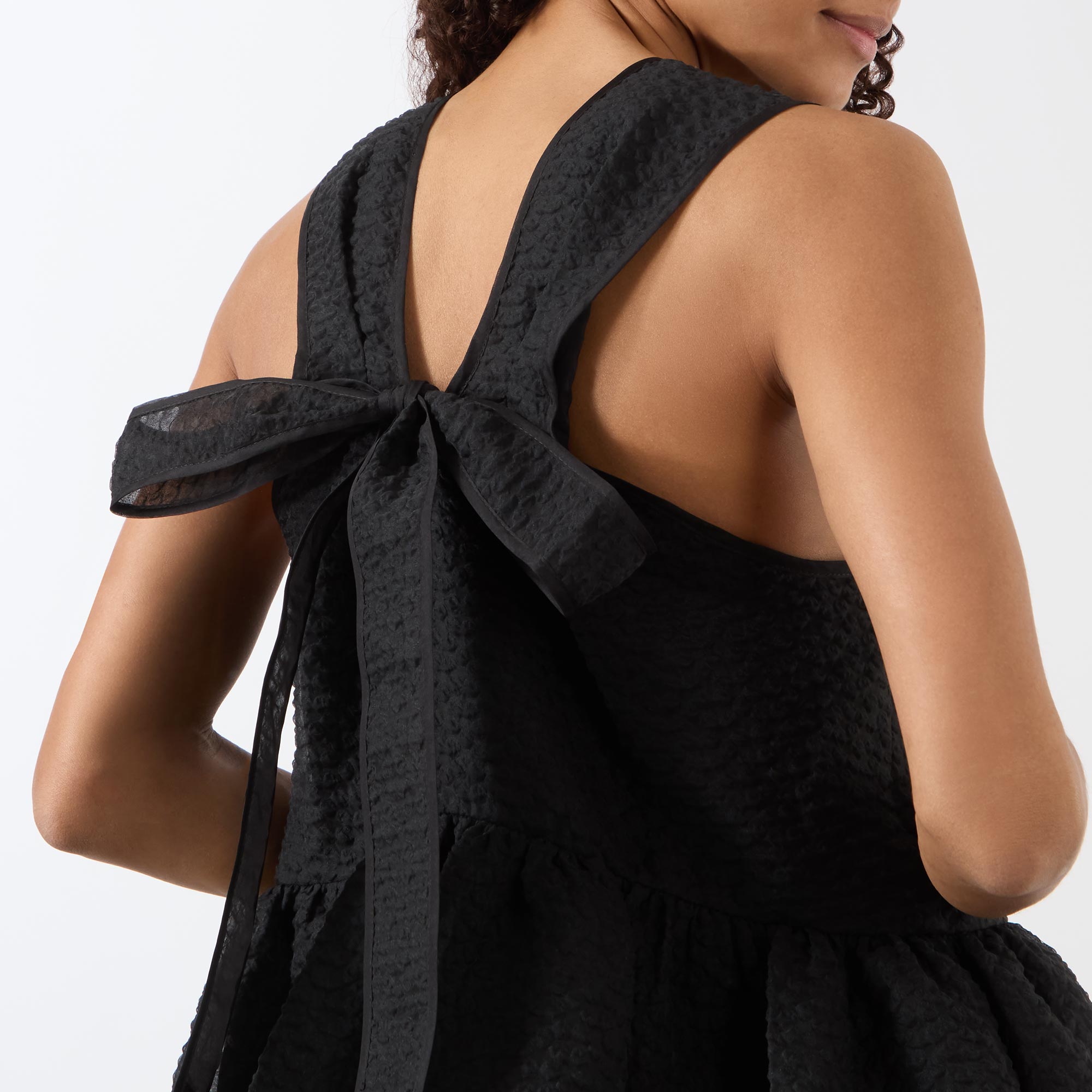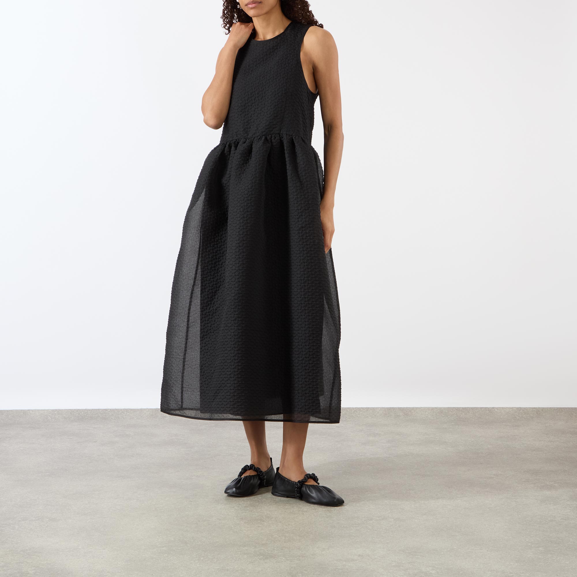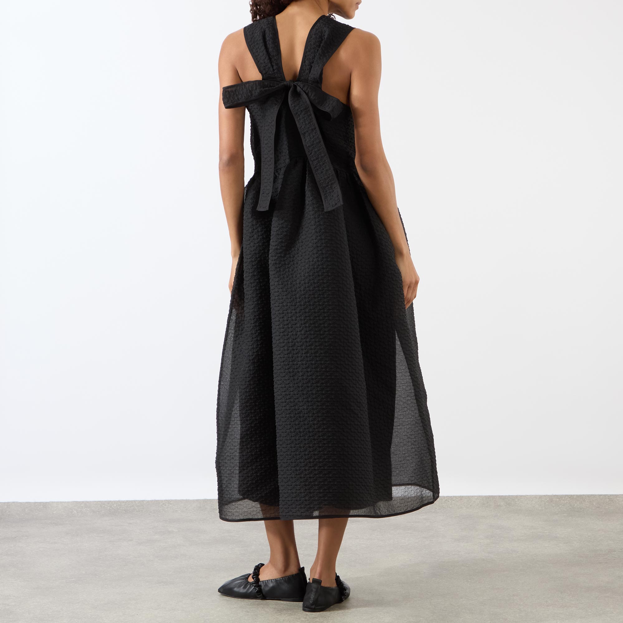 • Round neckline, sleeveless, dropped waist, midi length, bow detail to the back, plumeria petit matelassé fabric