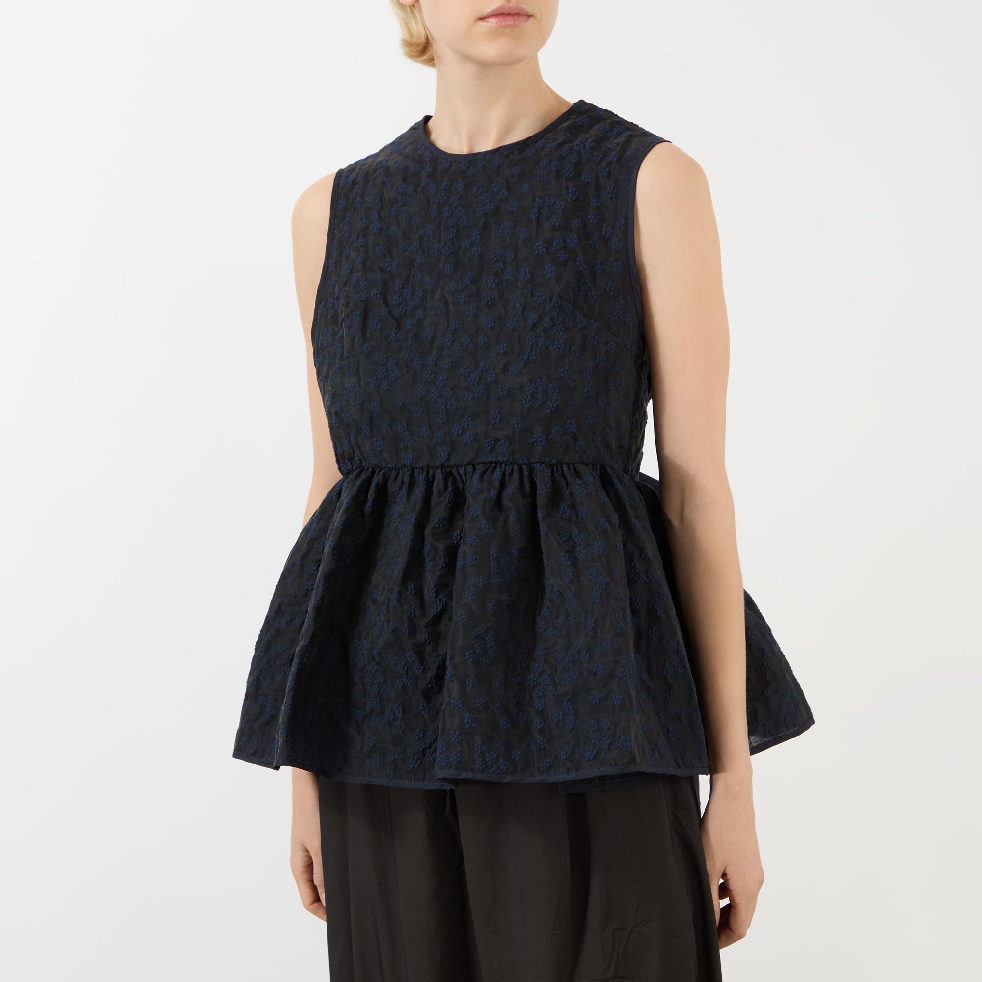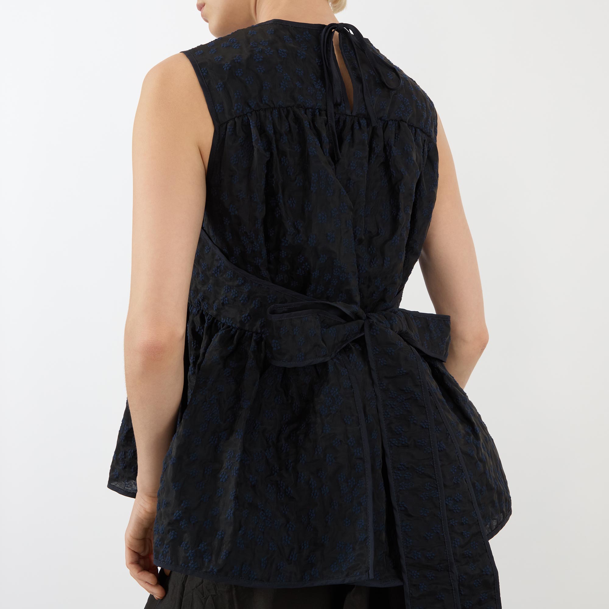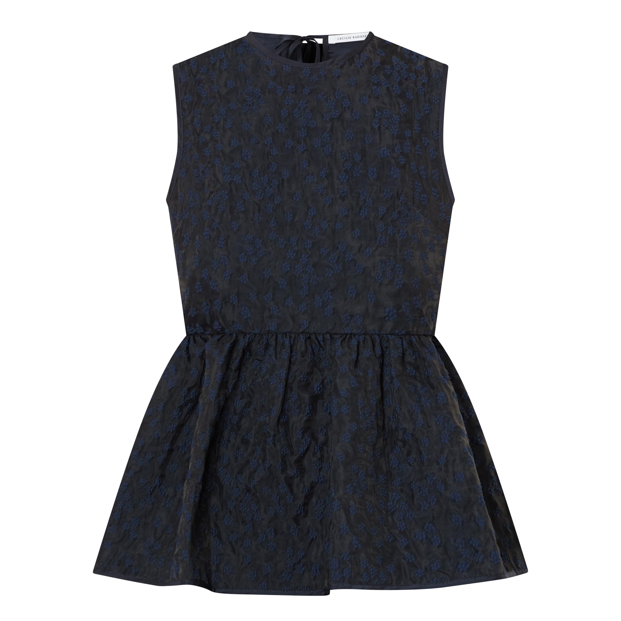 - Round neckline, sleeveless, back keyhole and tie-fastening closure, tie-fastening belt to the back, peplum hemline, textured finish