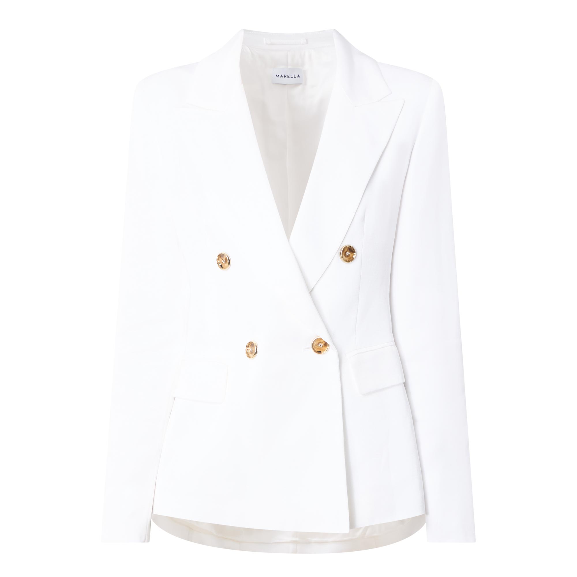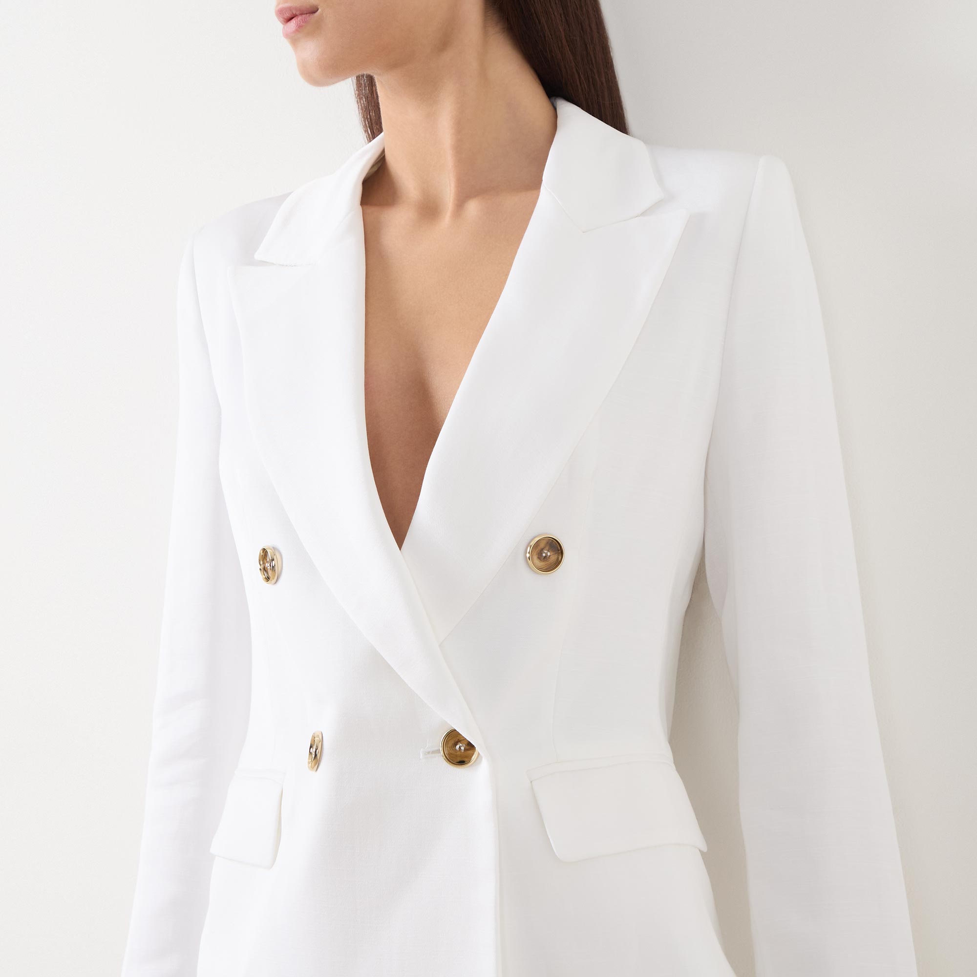 - Double-breasted, long sleeves, gold-toned hardware, lapel collar, flap pockets, fitted silhouette