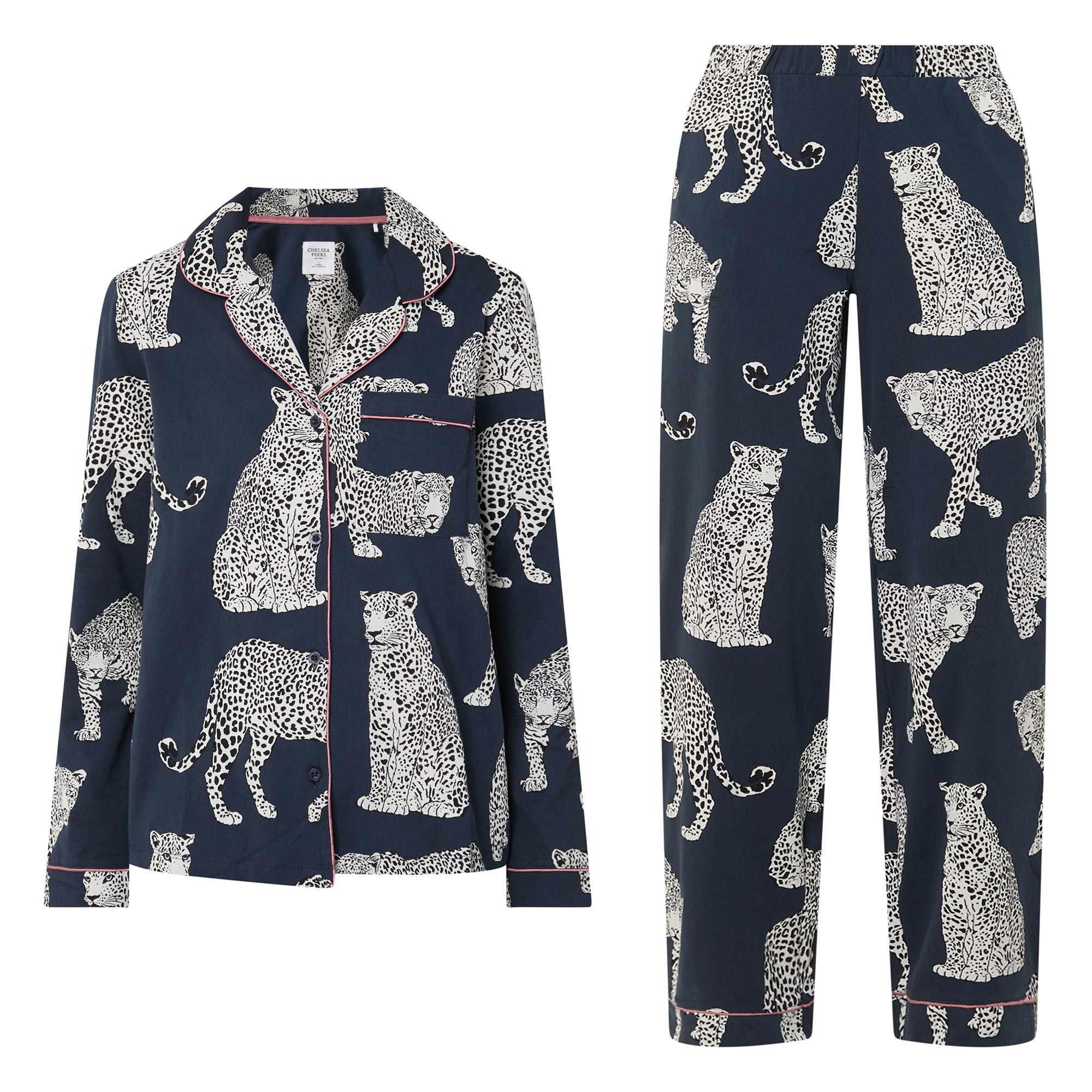 - Two-piece set, top with notch lapel collar, long sleeves, one chest patch pocket, front button fastening, straight hem, contrast piping, bottoms with covered elasticated waistband, straight leg, full length, tonal piping, Leopard figure design, soft finish