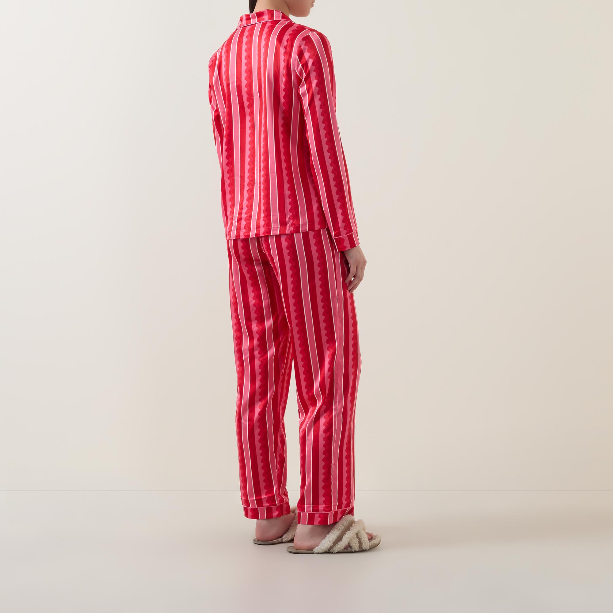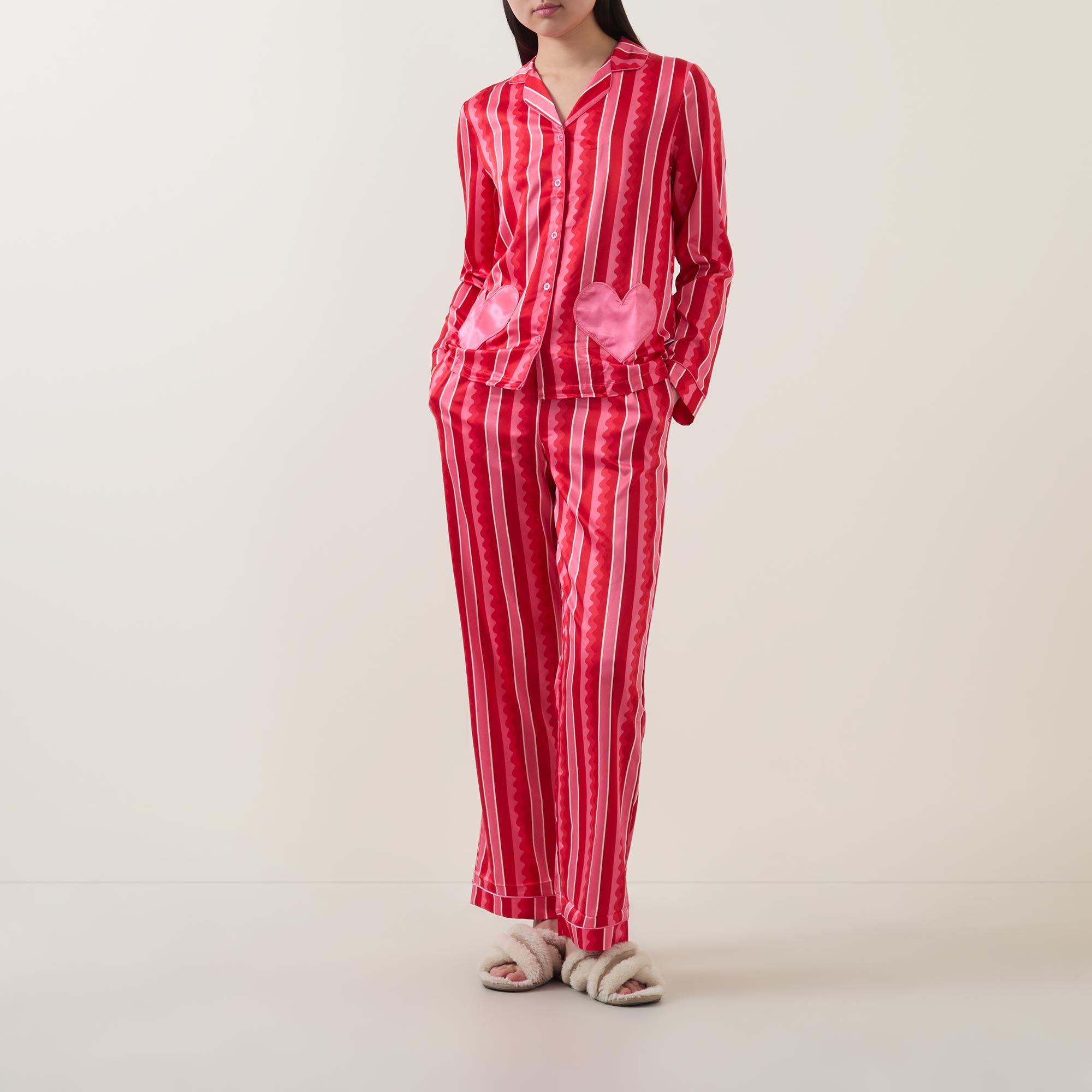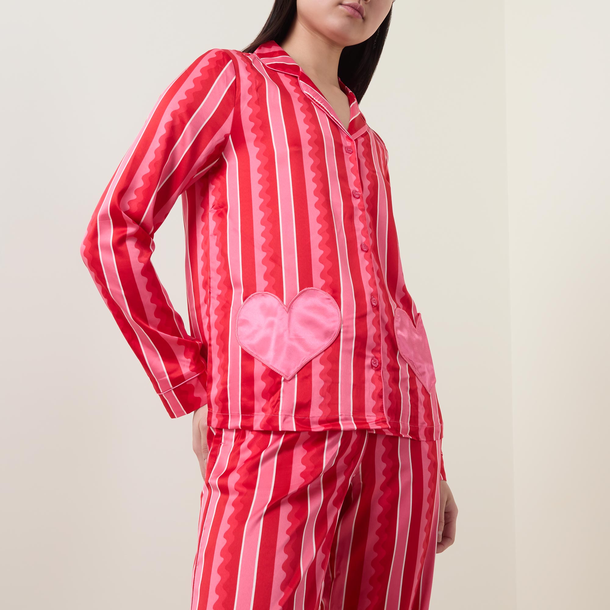• Top: Long sleeves, notched lapel collar, button fastening, contrast piping, heart embellishments, striped design, smooth fabric. Bottoms: Elasticated drawstring waistband, two side in-seam pockets, contrast piping, heart embellishments, striped design, straight-cut leg, smooth fabric