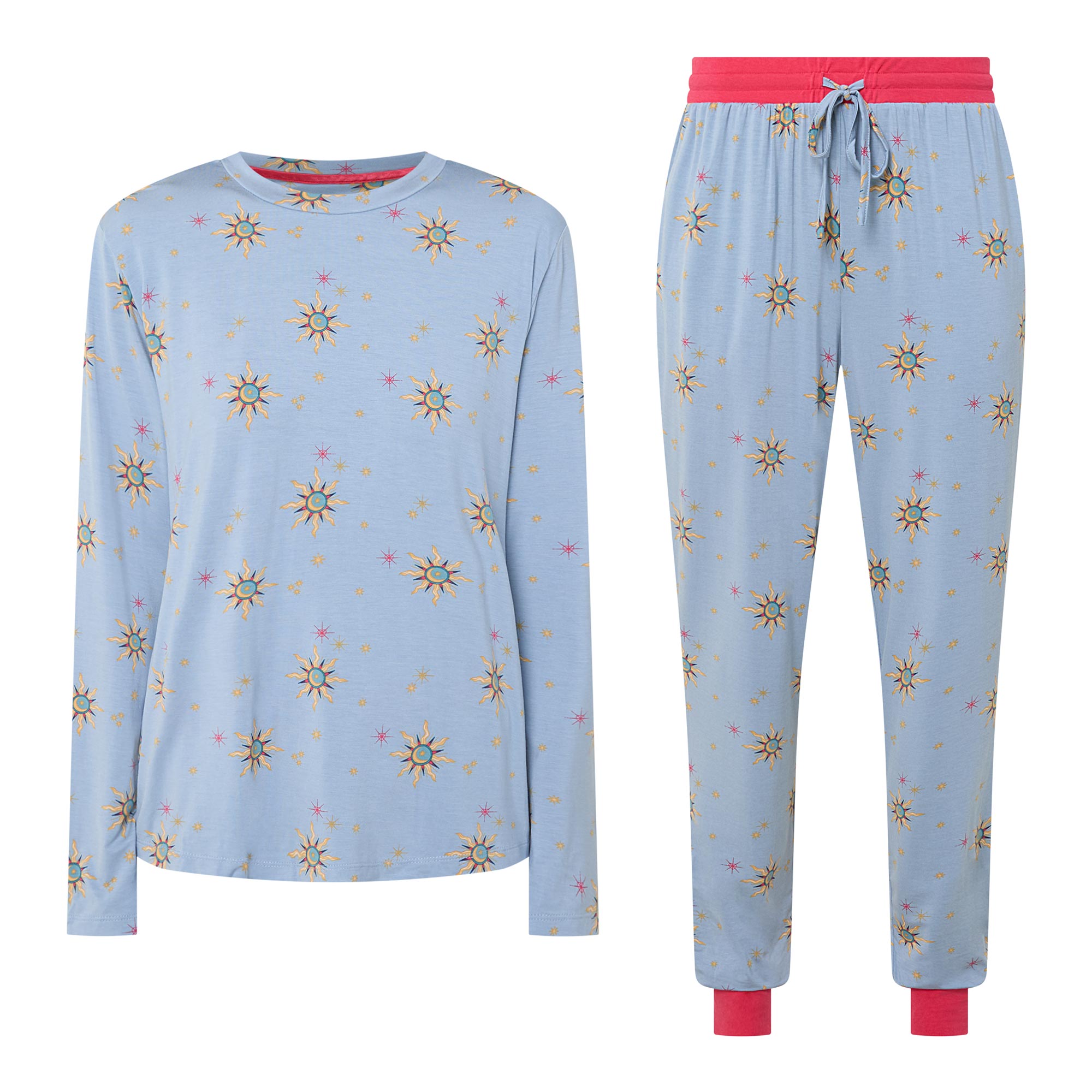 • Pyjama bottoms: Cuffed style, elasticated waistband with drawstring adjustable fit, side entry pockets, soft touch fabric, twinkling sky print