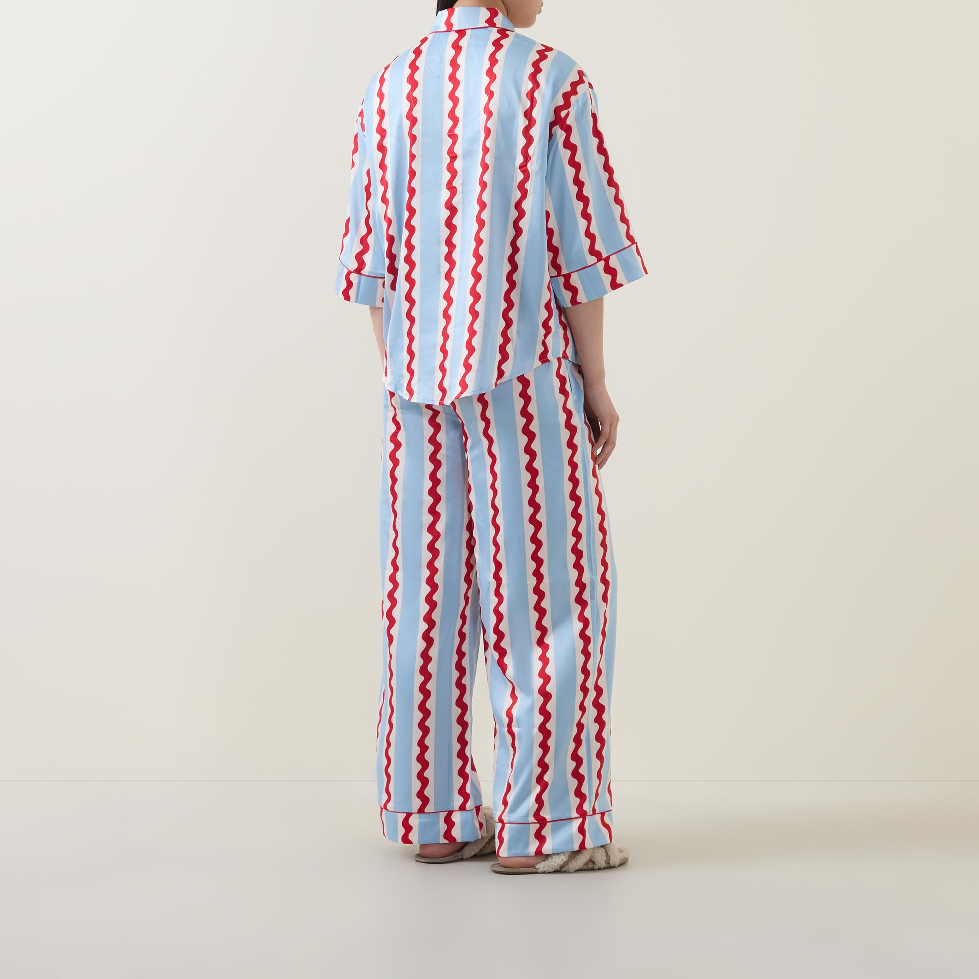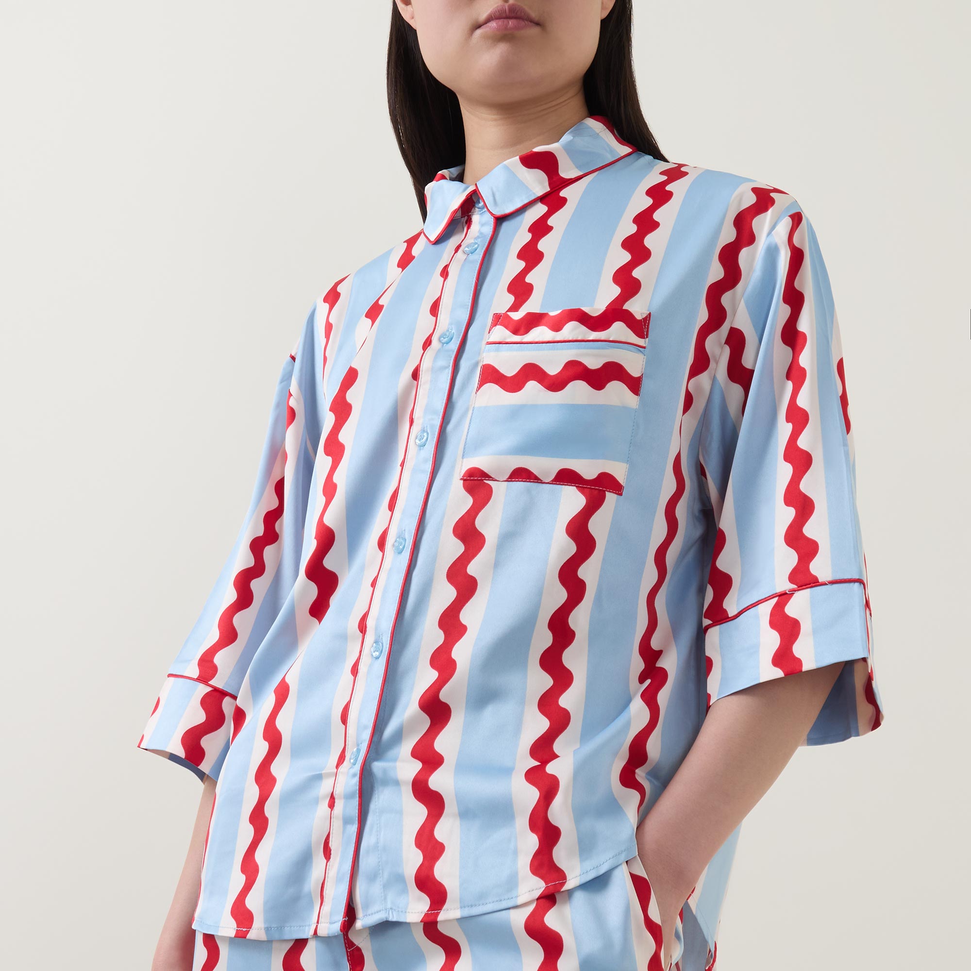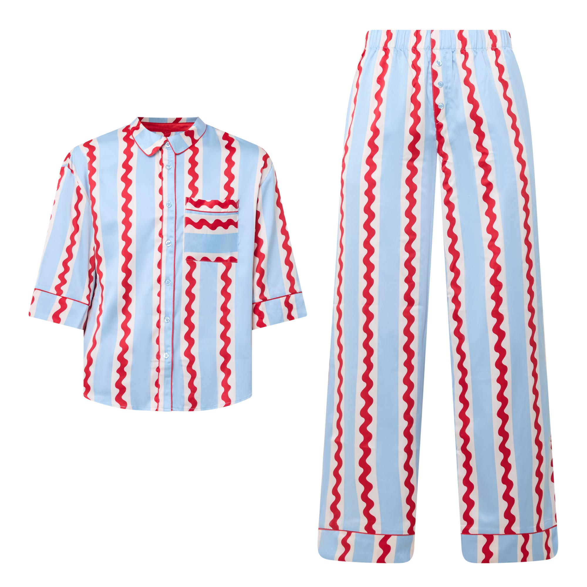 - Top: Mid-length sleeves, point collar, button placket, chest patch pocket, contrast piping, wavy stripe design, smooth fabric. Bottoms: Elasticated waistband, two side in-seam pockets, contrast piping, wavy stripe design, wide-cut leg, smooth fabric