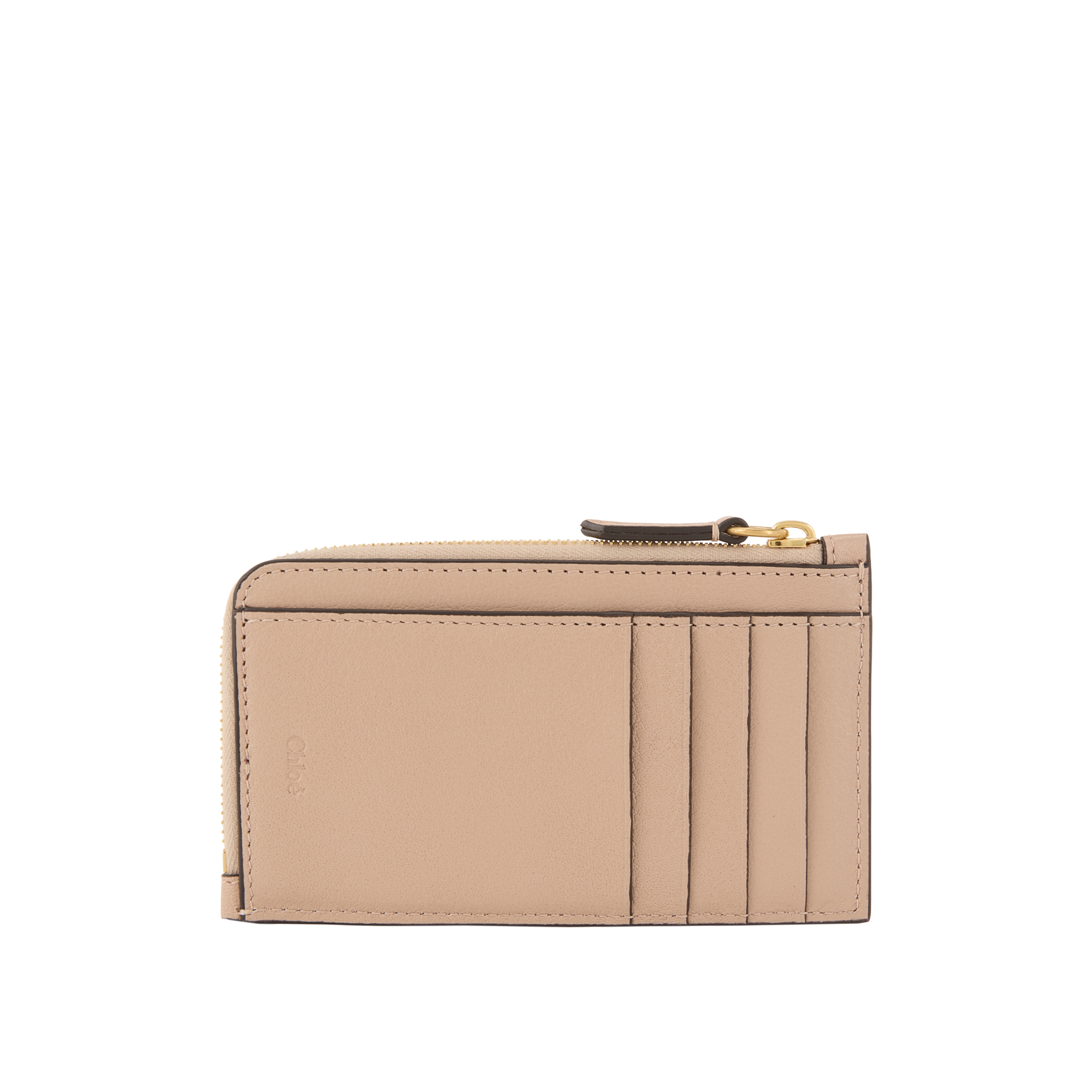 - Top zip-fastening, front and back slip pocket, four stacked card slots, stud details, gold-tone padlock charm, tonal stitching, grained leather finish
