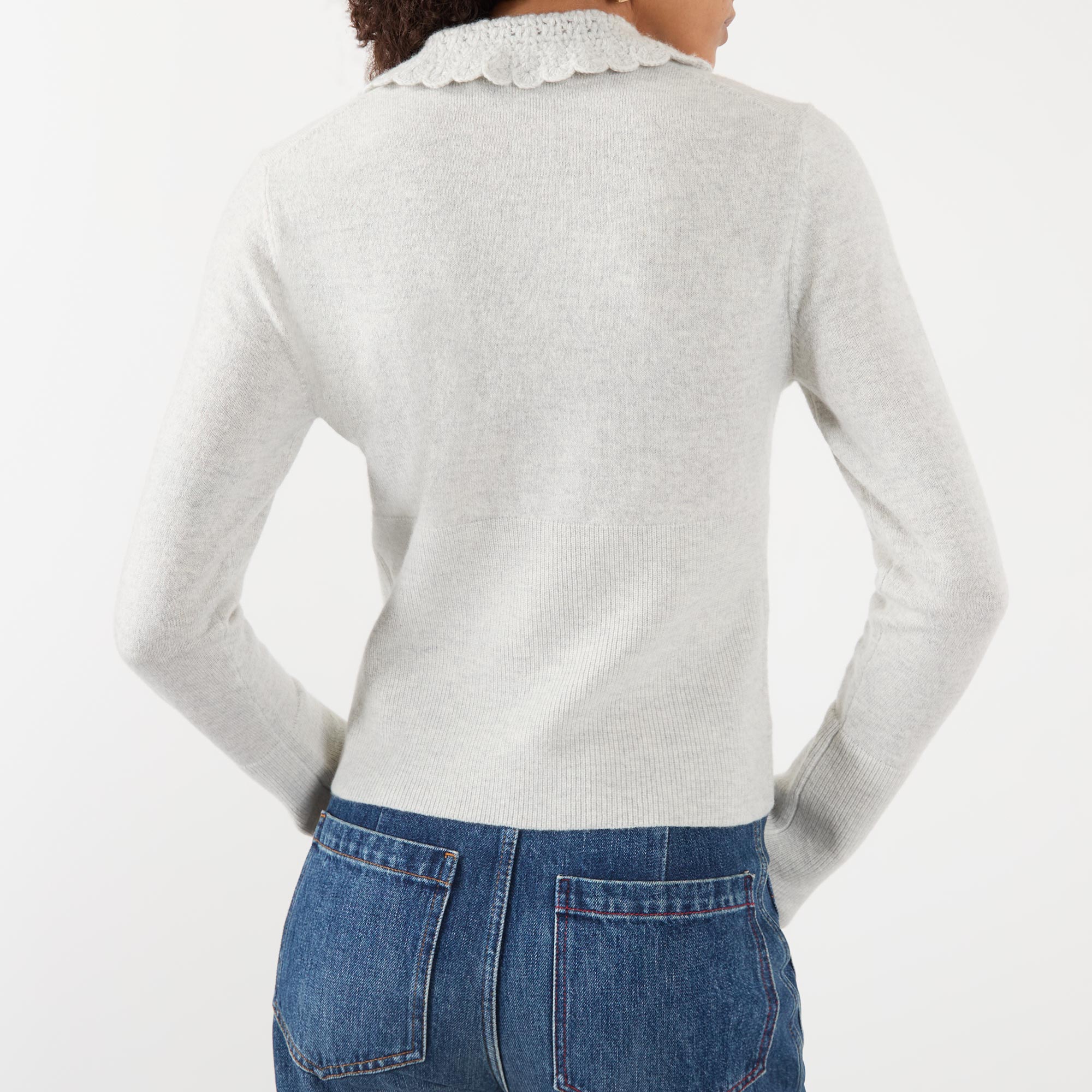 1950s-inspired details run through Chloé’s AW25 collection, exemplified in this finely knit wool cardigan. It features a scalloped, eyelet-embellished collar and contrast logo embroidery across the chest, complemented by tonal buttons and cozy ribbed trims for a modern, elegant finish.