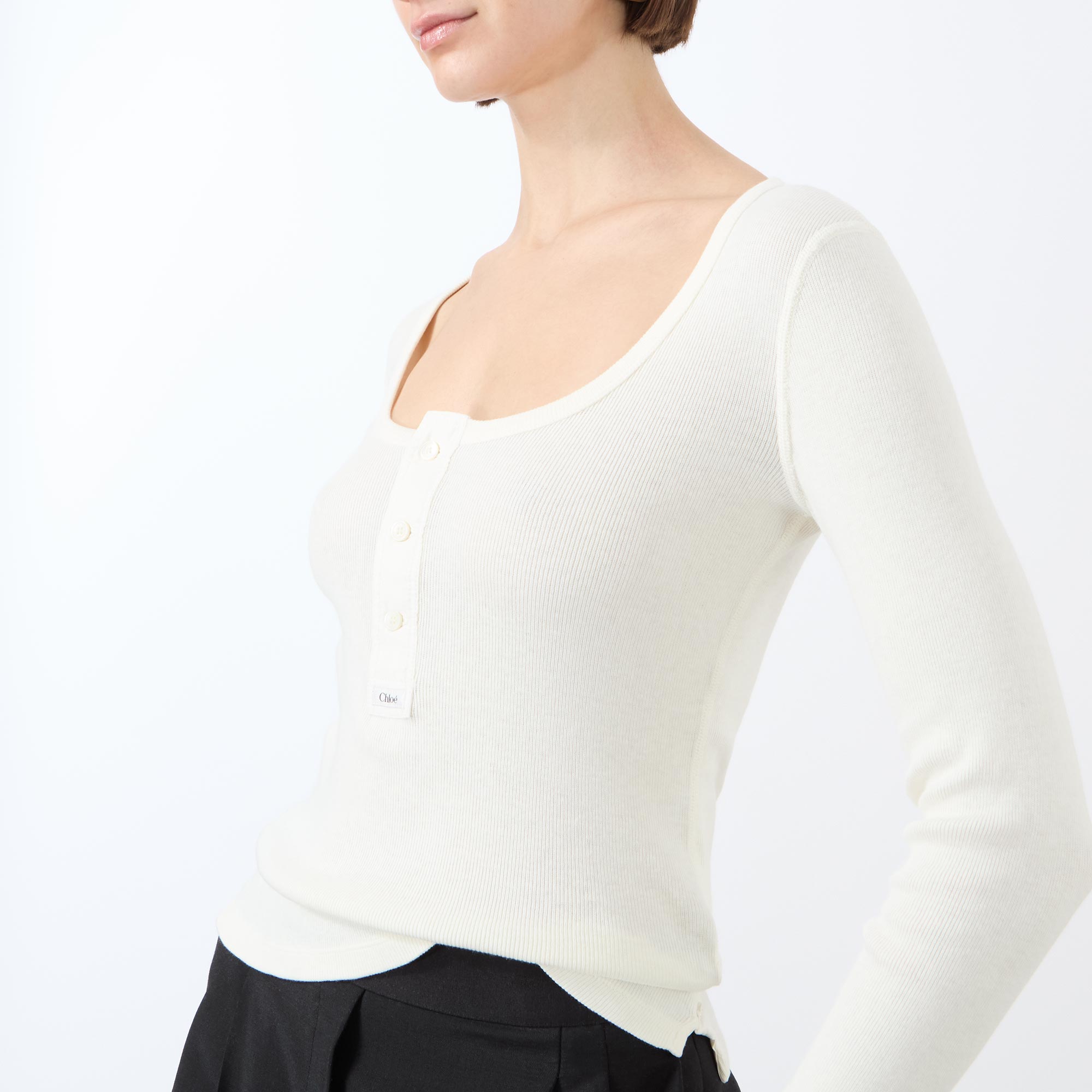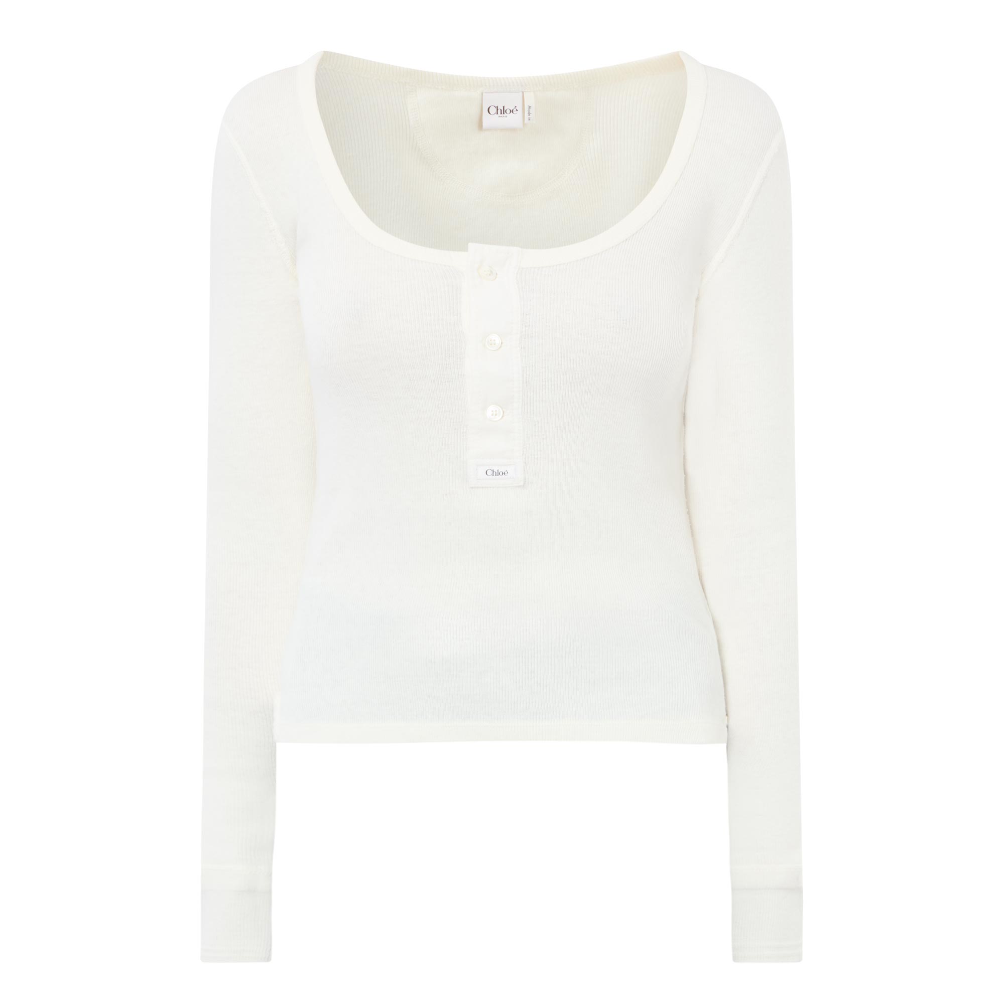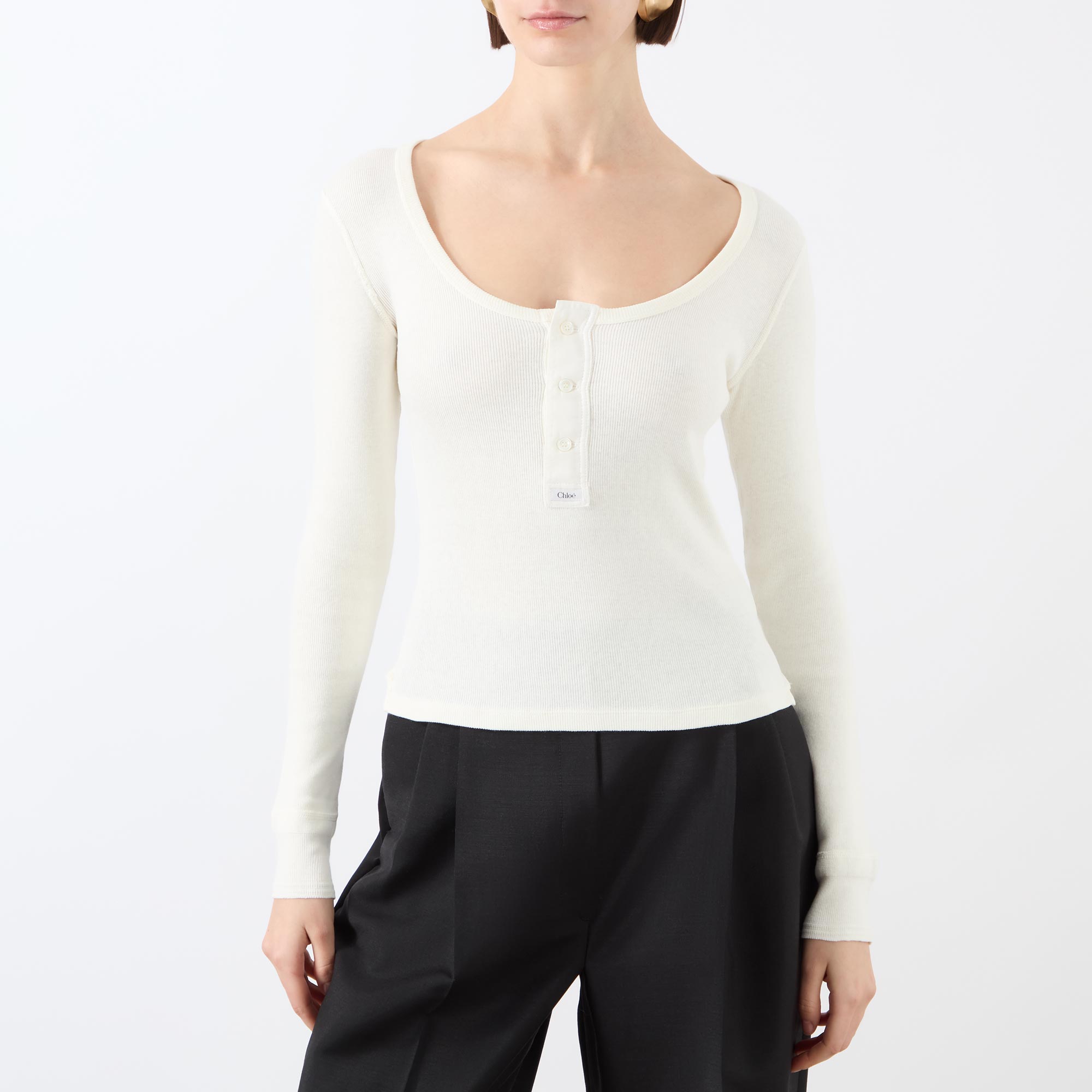 For SS26, Chloé explores the balance between intricate craftsmanship and everyday wearability. This top embodies that ethos with an understated design, featuring a classic scoop neckline, long sleeves, and a three-button placket, complemented by a subtle logo patch at the chest. Crafted from soft, breathable cotton, it’s woven with the brand’s logo lettering at the back and finished with a clean, straight hem for a sleek silhouette.