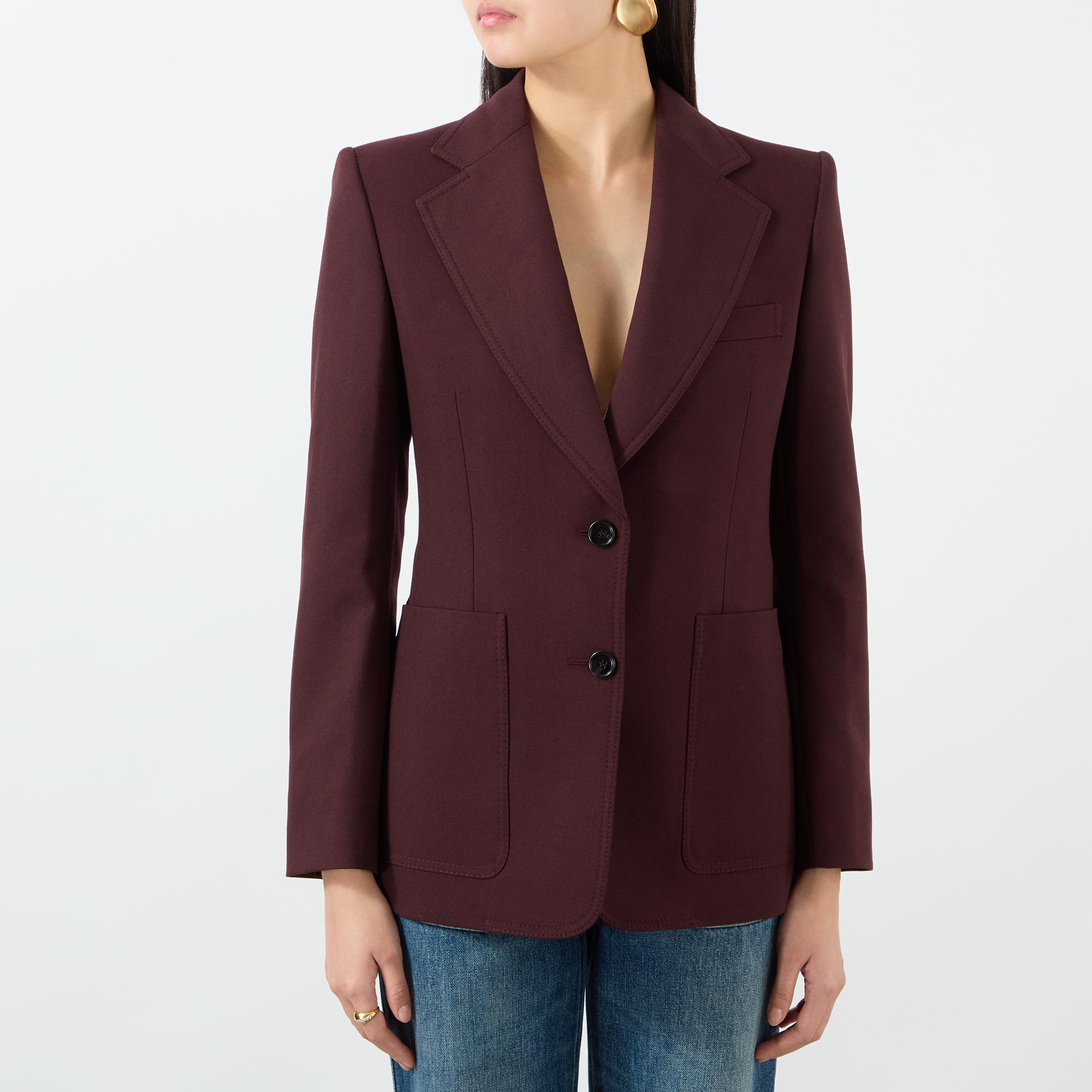Sculpted outerwear appears across the SS26 collection from Chloé, seen in the design of this blazer. Cut from a wool-gabardine fabric to a single-breasted silhouette, it features notched lapels and patch pockets, finished with engraved horn buttons.