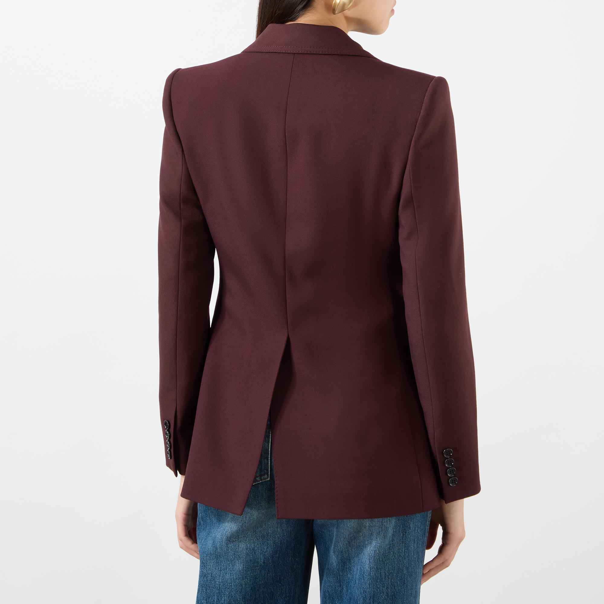 - Peaked lapels, single-breasted, button fastening, patch pockets, chest pocket, buttoned cuffs, vent to the back, wool gabardine fabric