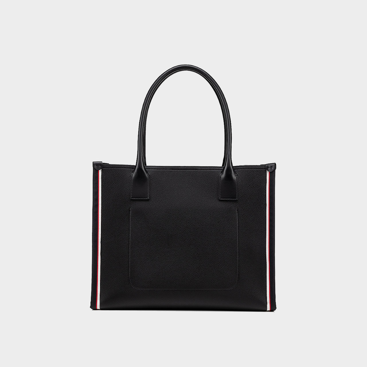 - Textured leather design, two top handles, one main compartment, one flat pocket, signature three-colour band fastening, logo design, can be carried by hand or worn on the shoulder