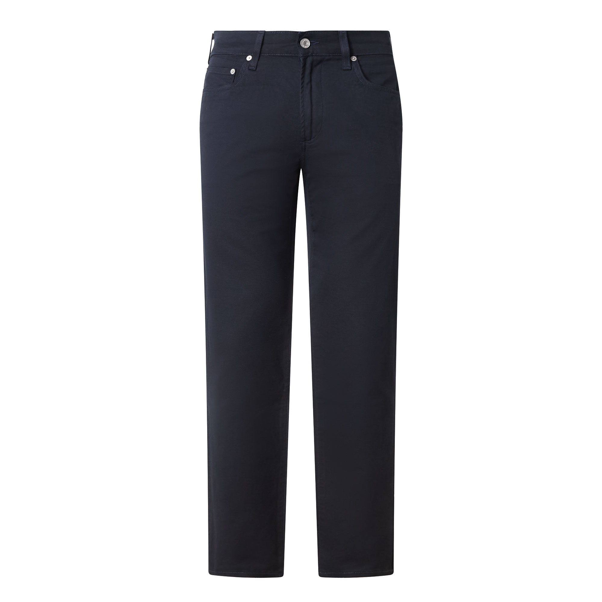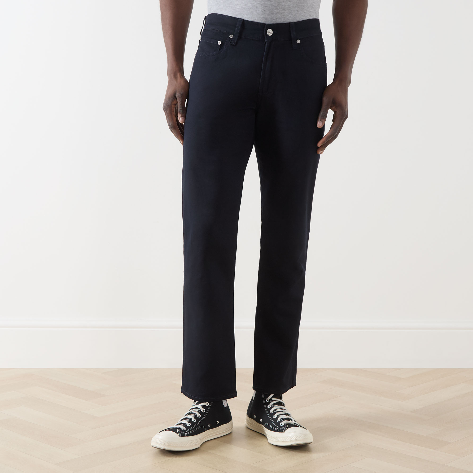 • Mid-rise, straight leg, belt loops, concealed zip fly and button fastening, five-pocket styling, rear logo patch, clean hems, tonal stitching
