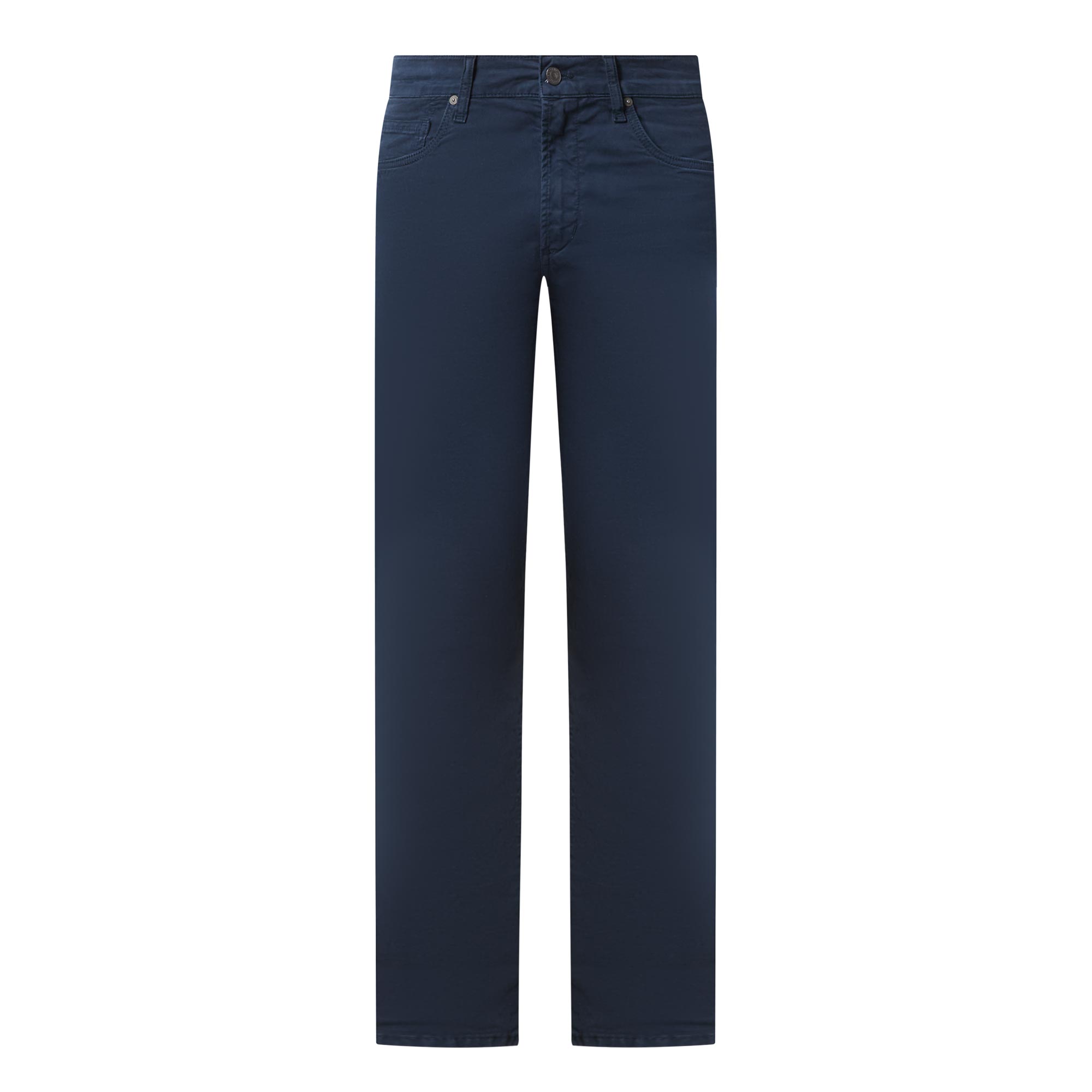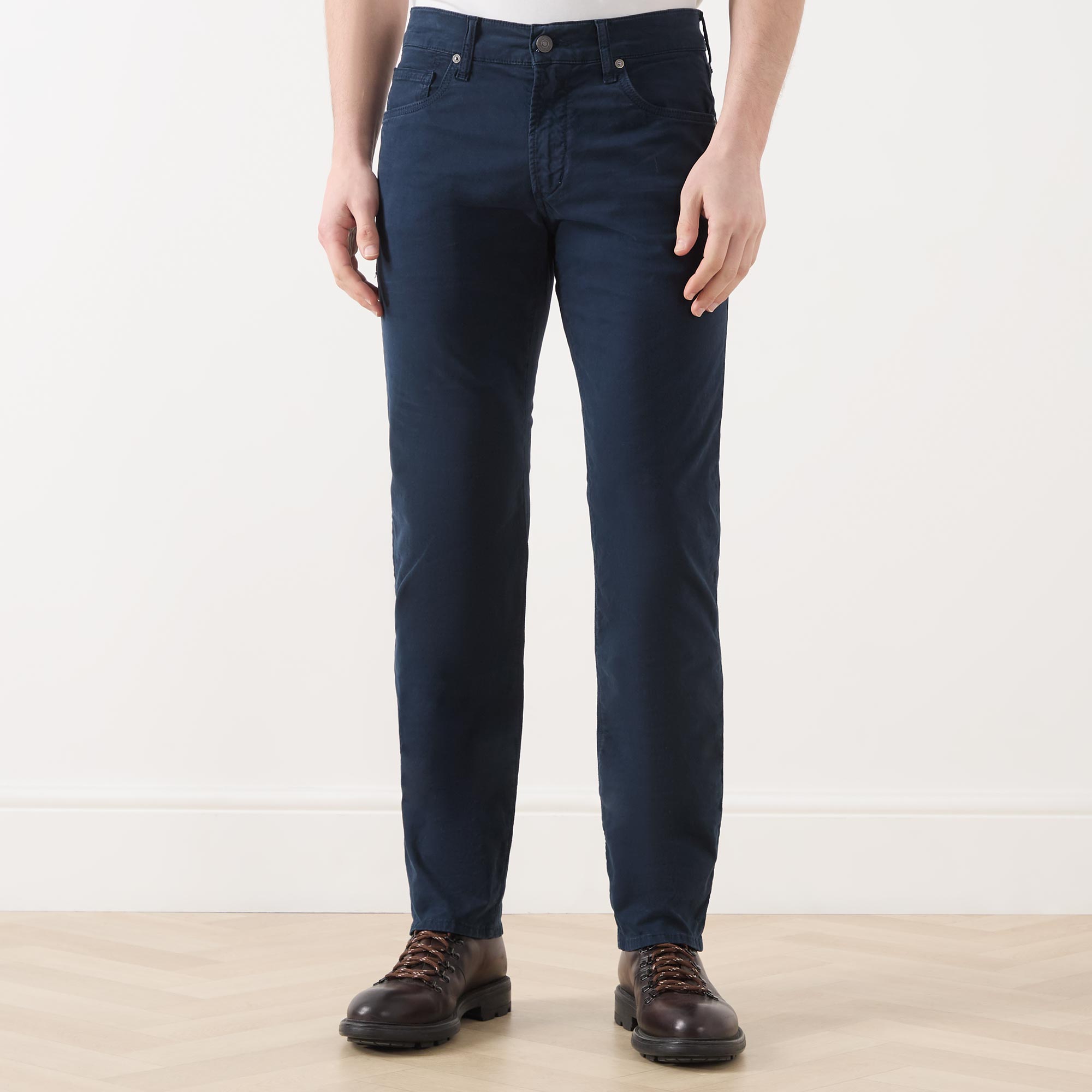 - Zip-fly and button fastening, belt loops, five-pocket design, tonal stitching, rear logo patch, mid-rise, slim-cut leg, smooth fabric