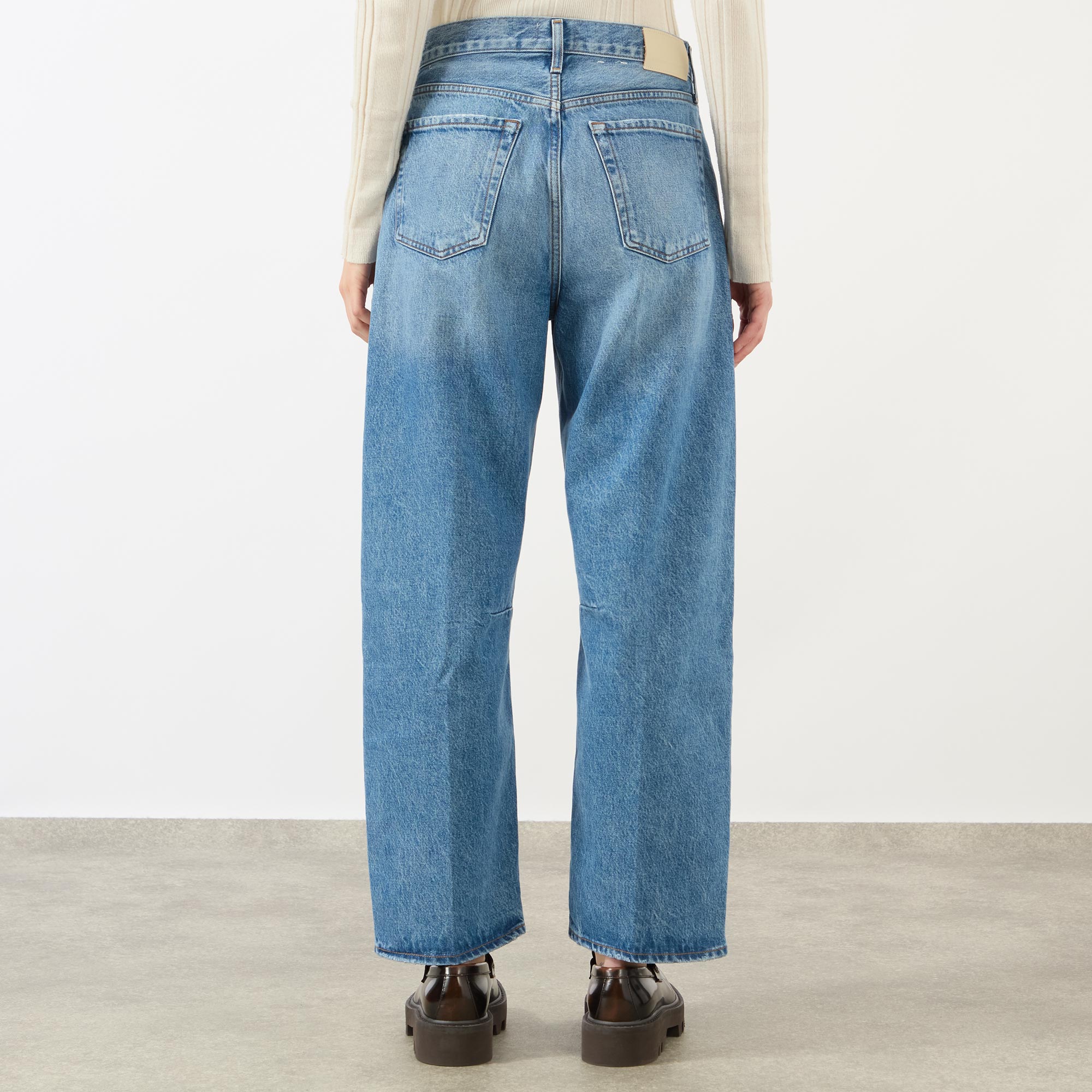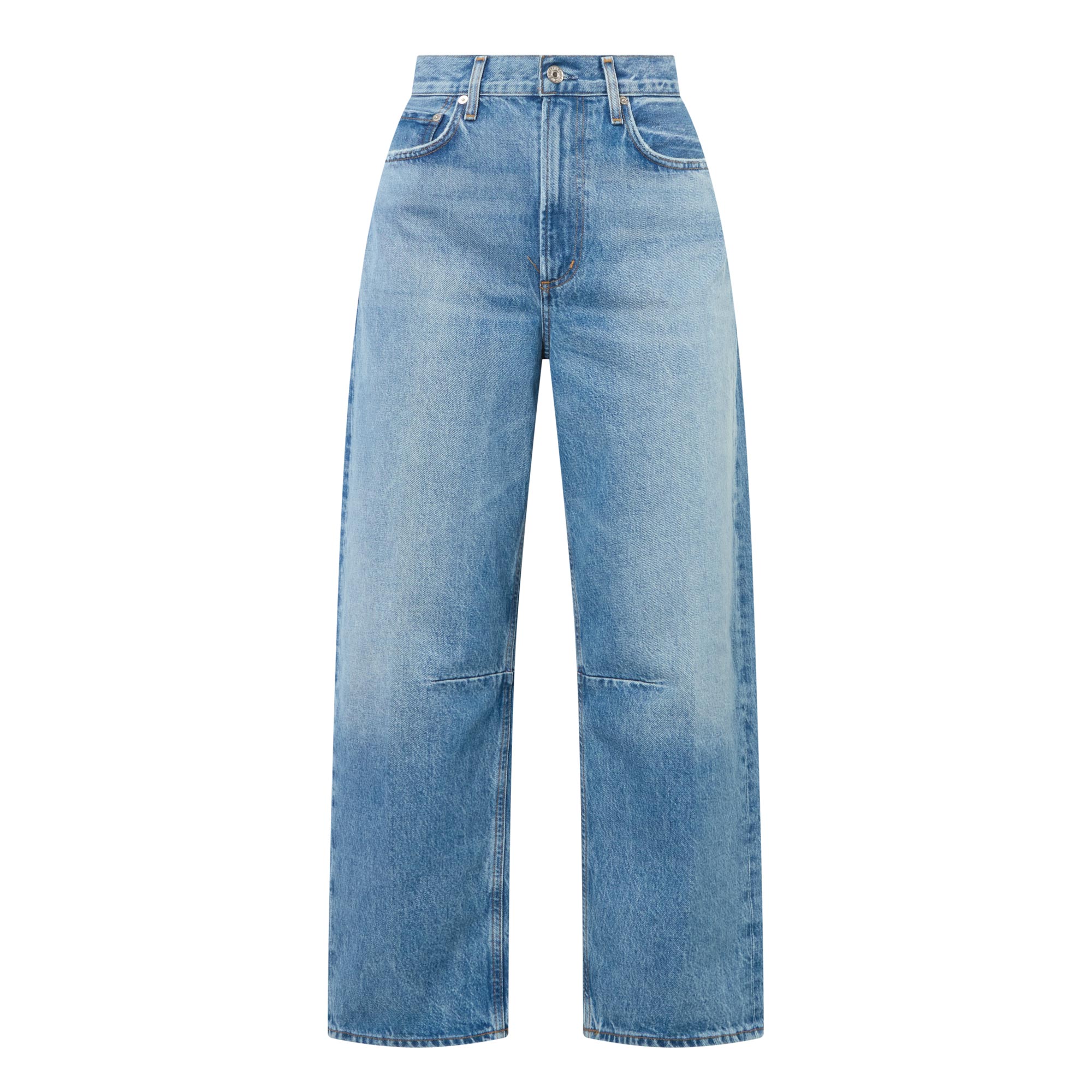 • High rise, wide leg, belt loops, concealed fly and button fastening, five pocket styling, darts at knees, clean hems, branded hardware, faded wash, tobacco stitching, brand patch at back waistband, mid wash finish
