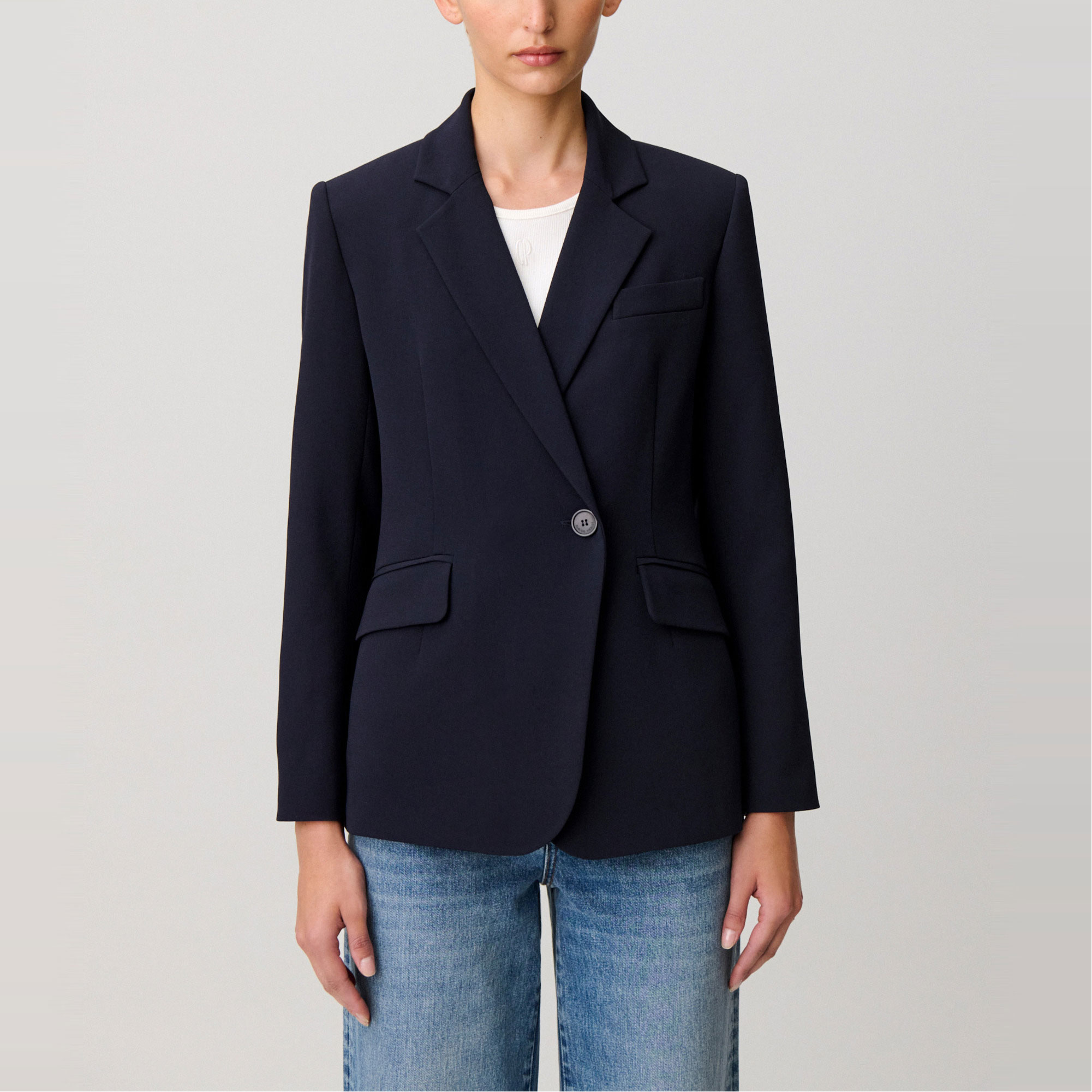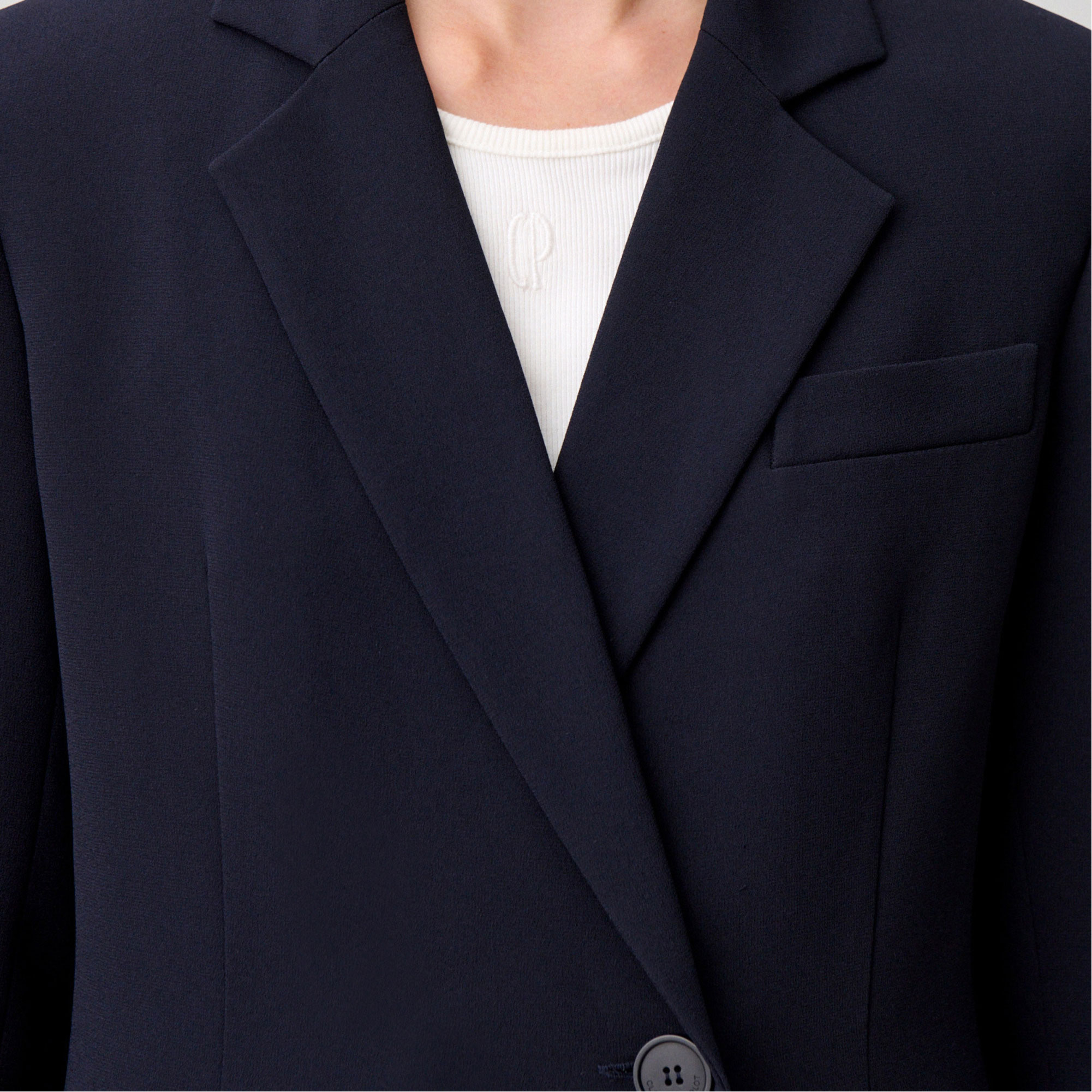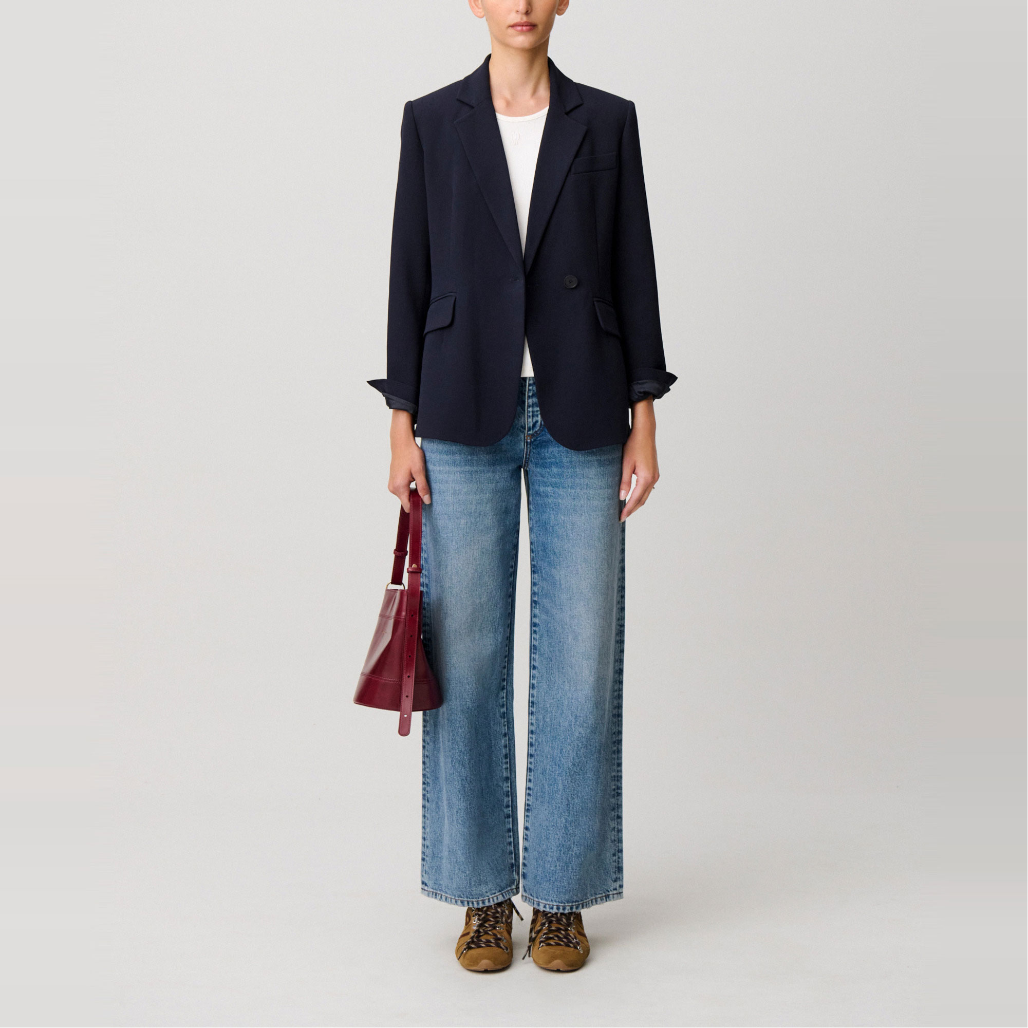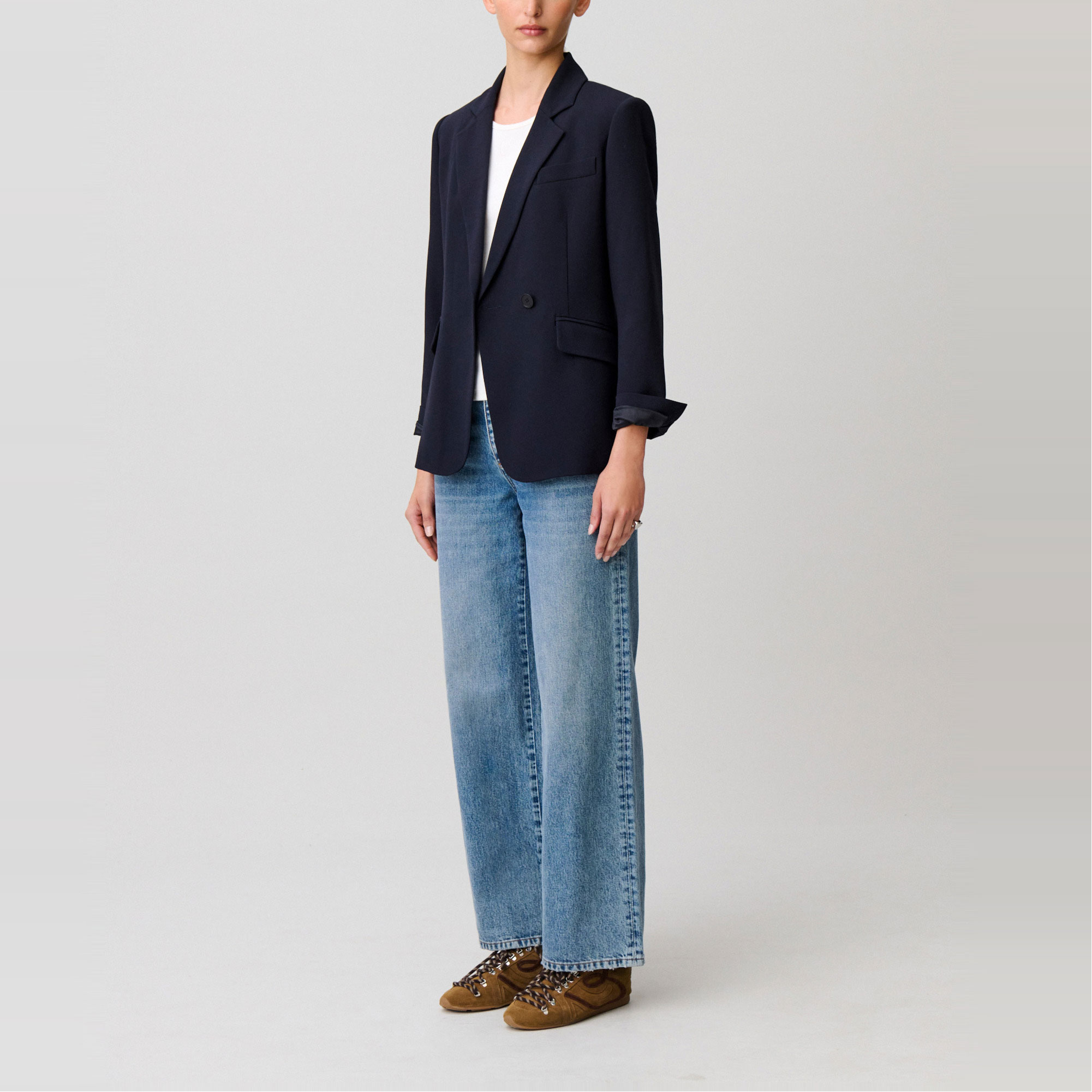 - Double-breasted, tailored style, two front double-welt flap pockets, contrasting cuff buttons, back vent
