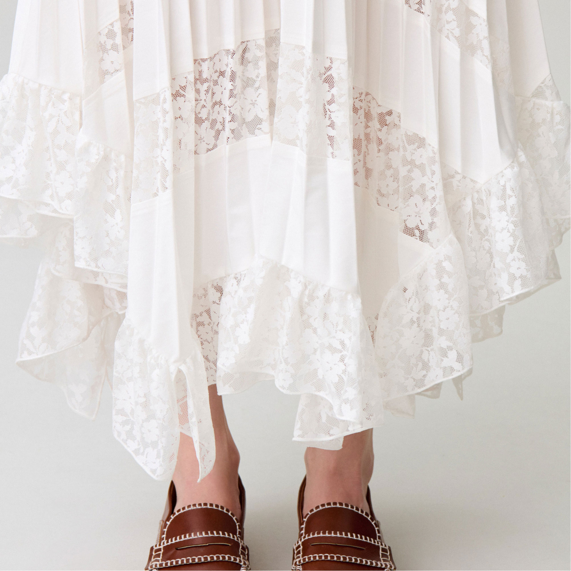 • Asymmetric, pleated, midi length, floral pattern, openwork lace panels, waist ties, lace ruffles at hem