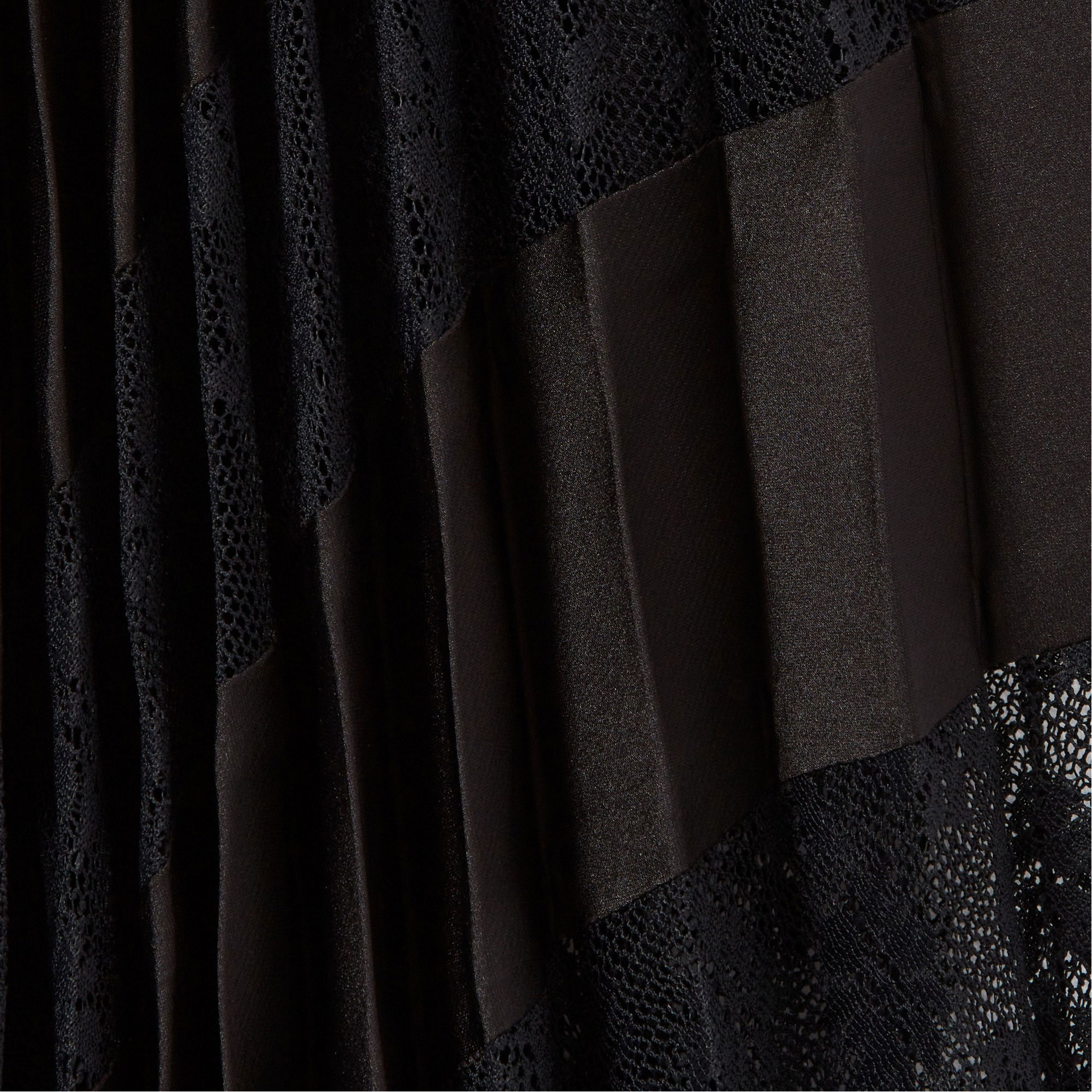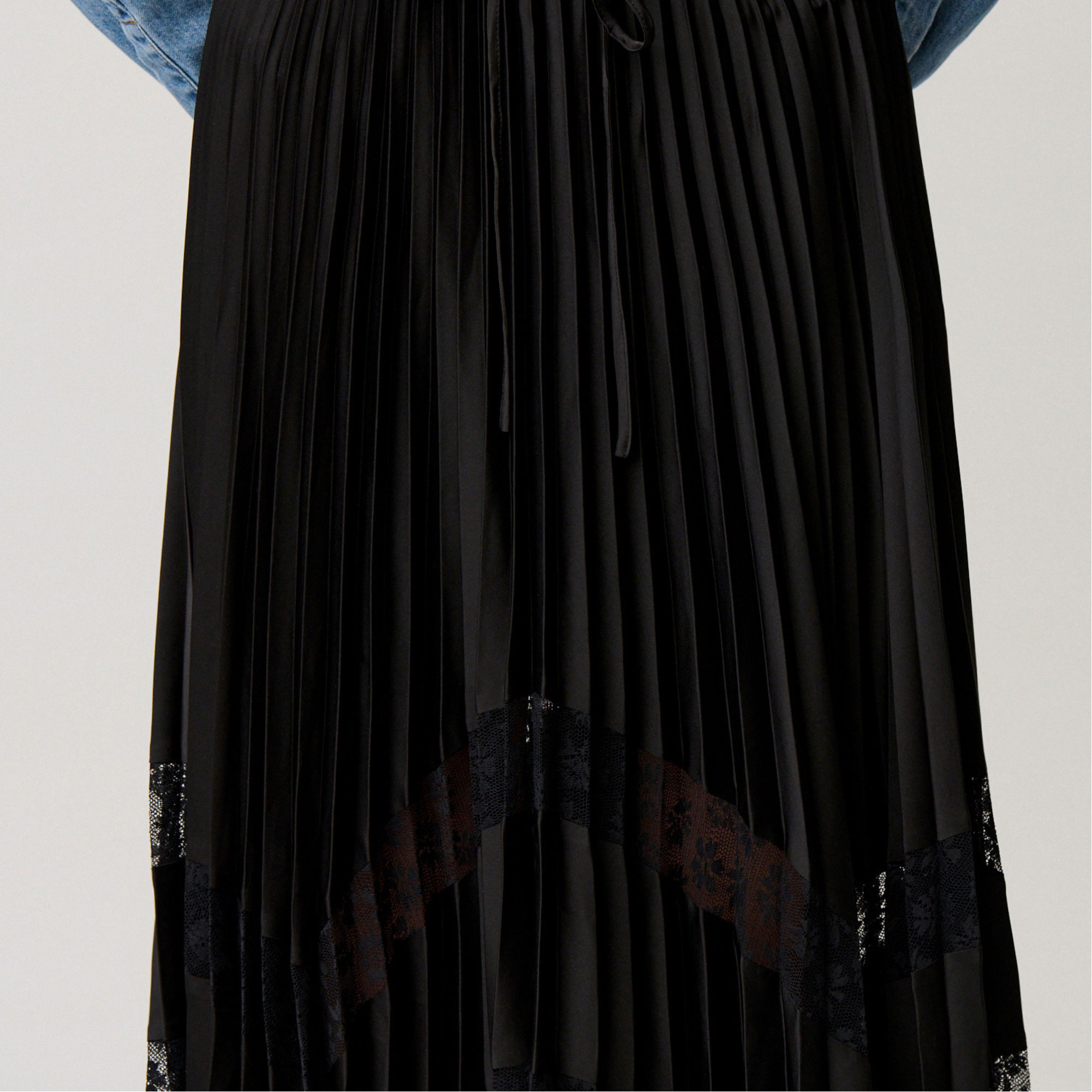 - Asymmetric hem, pleated, midi length, satin-finish fabric, sheer openwork lace inserts, waist tie-fastening