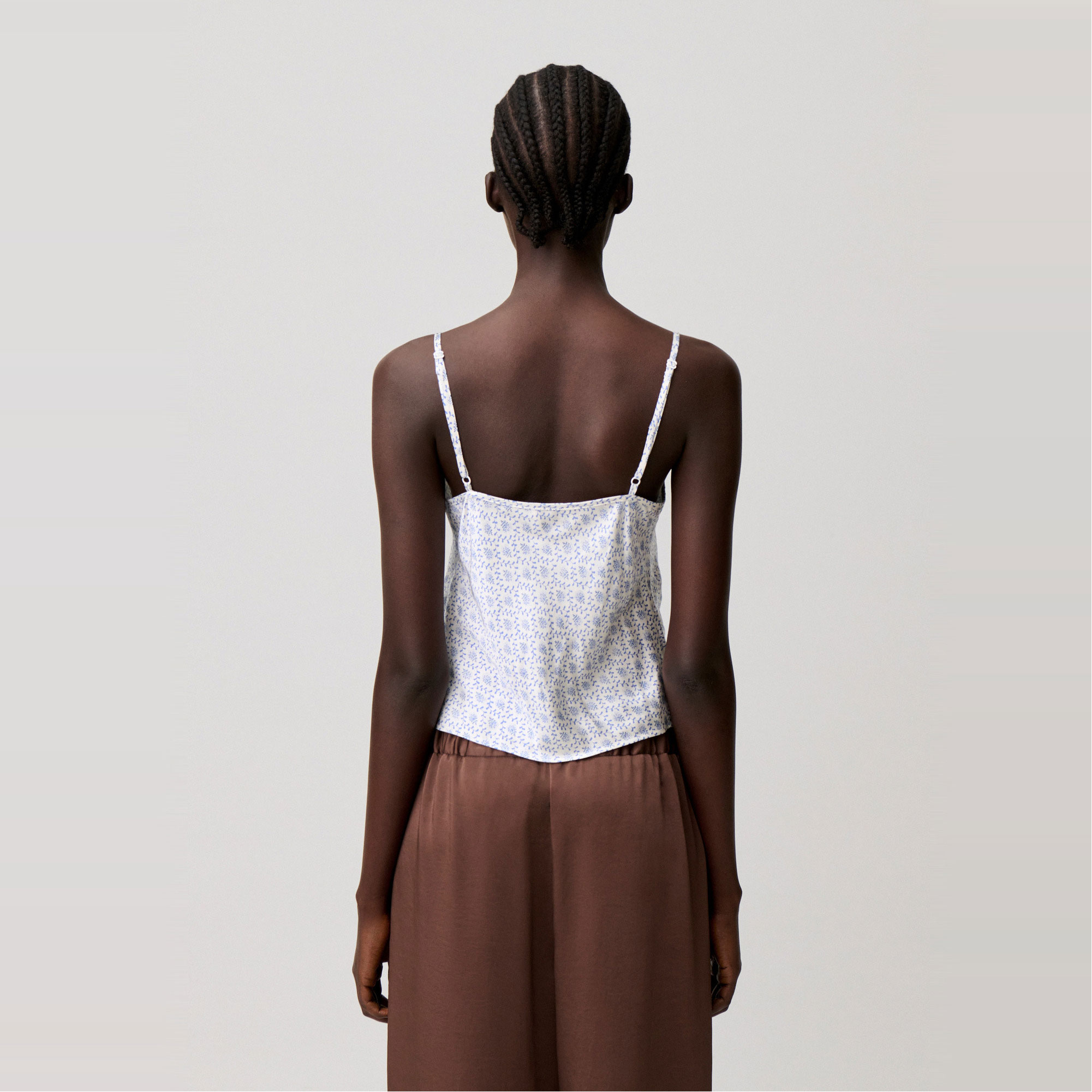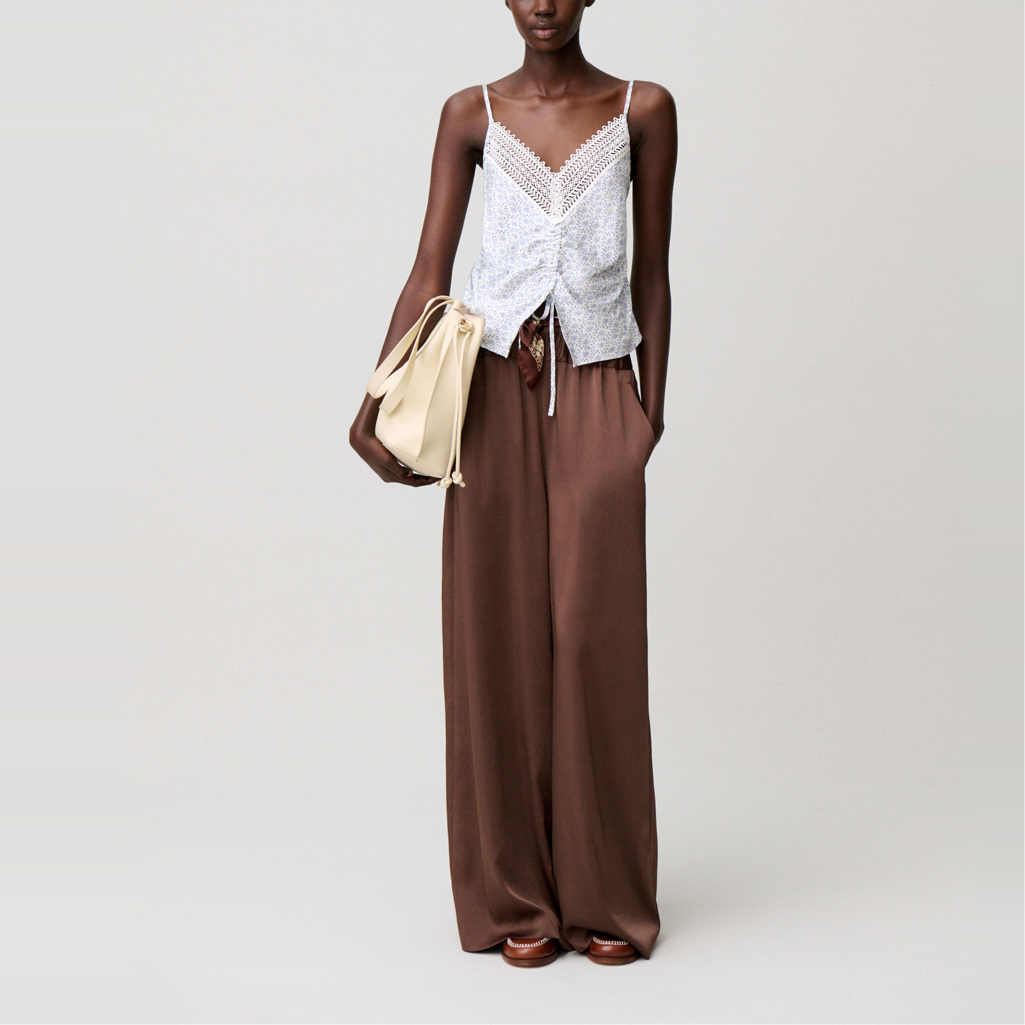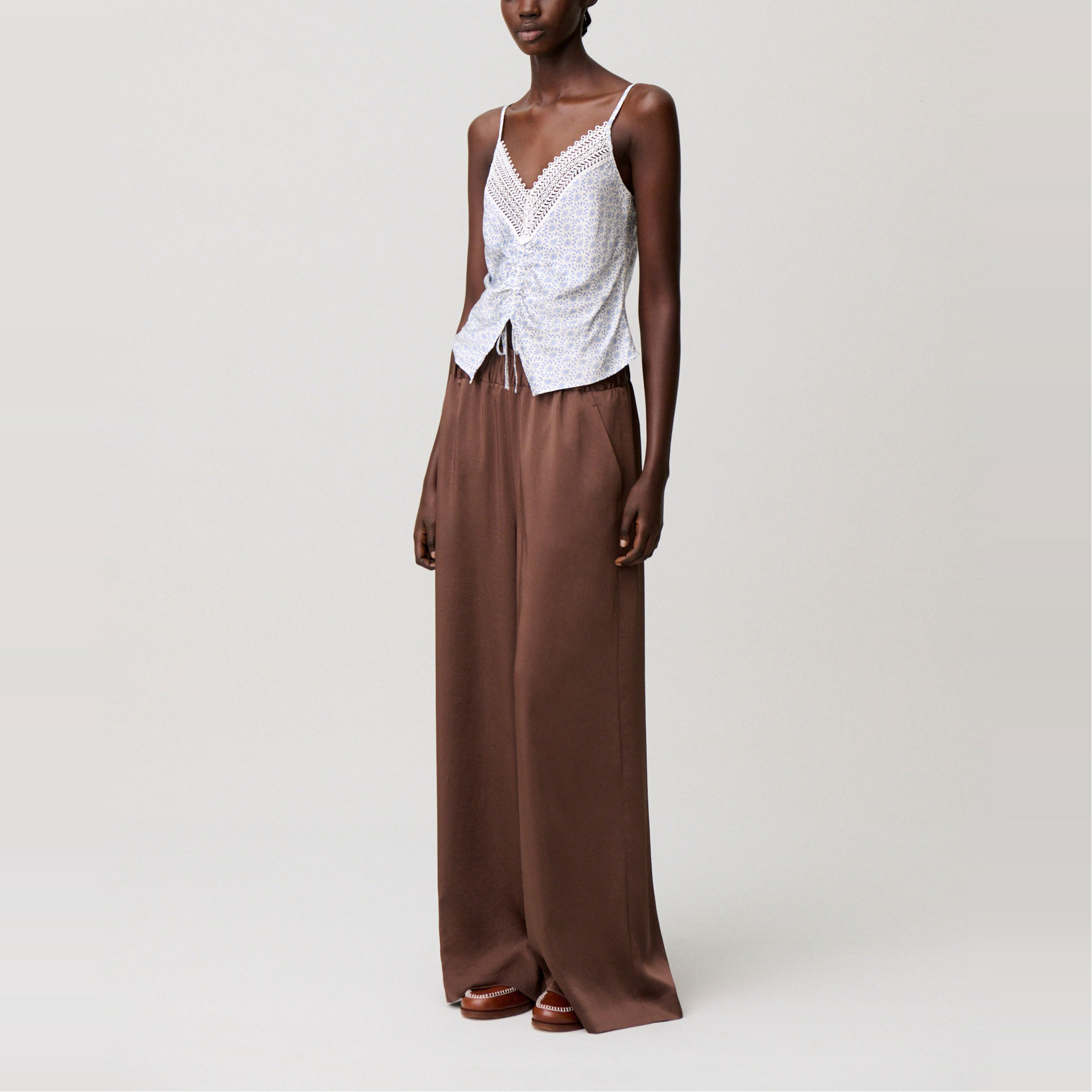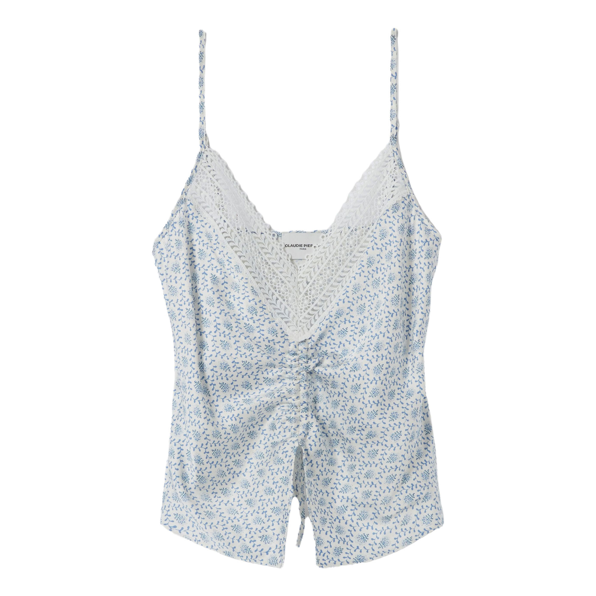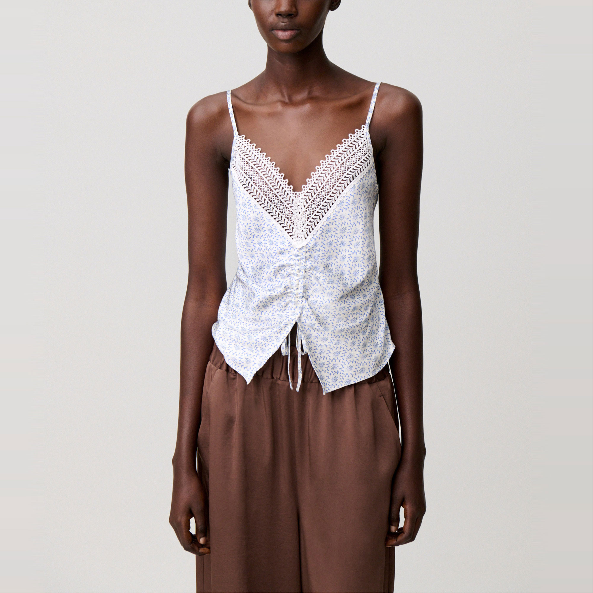 • Printed, satin fabric, fine adjustable straps, lace trim, V-neckline, drawstring tie, ruching