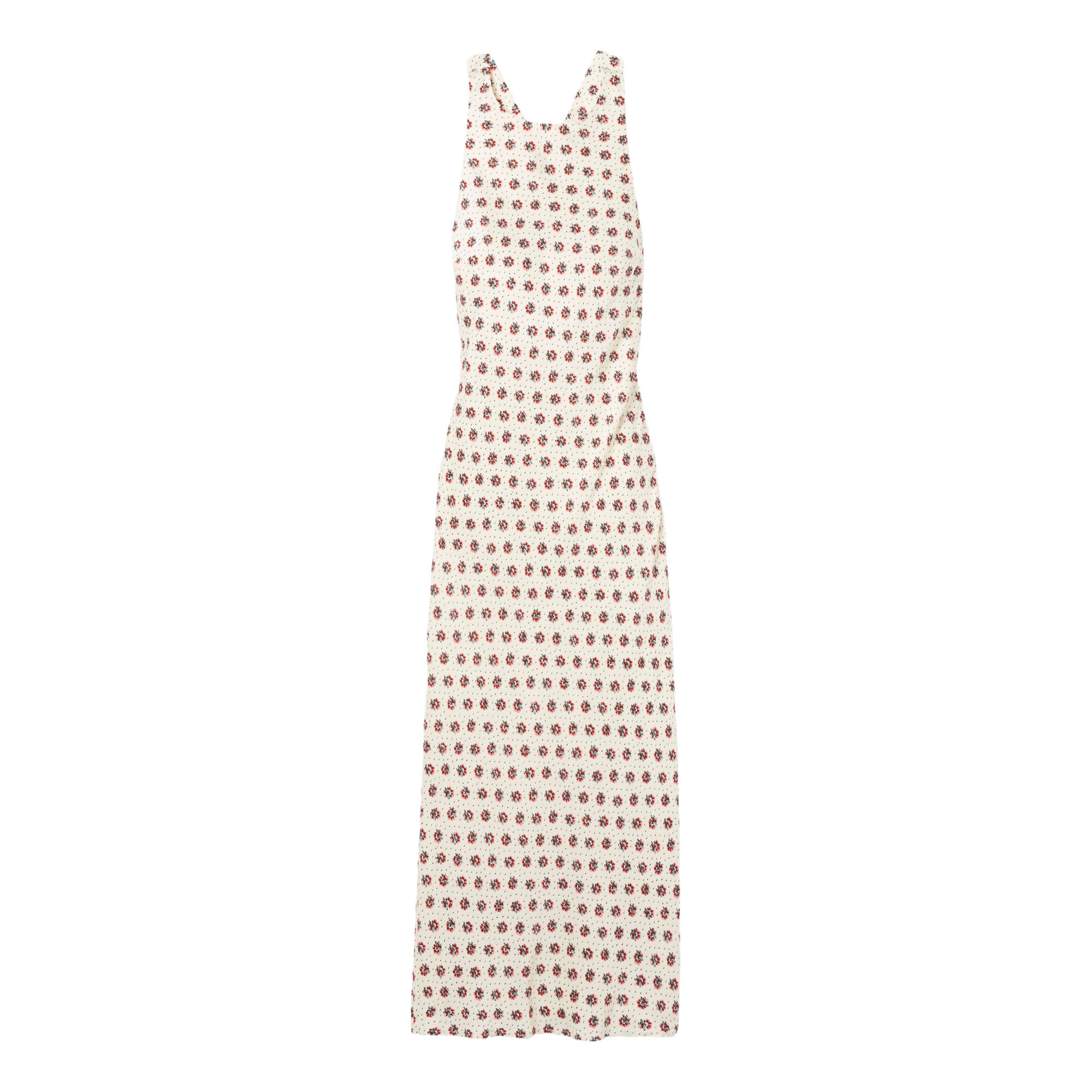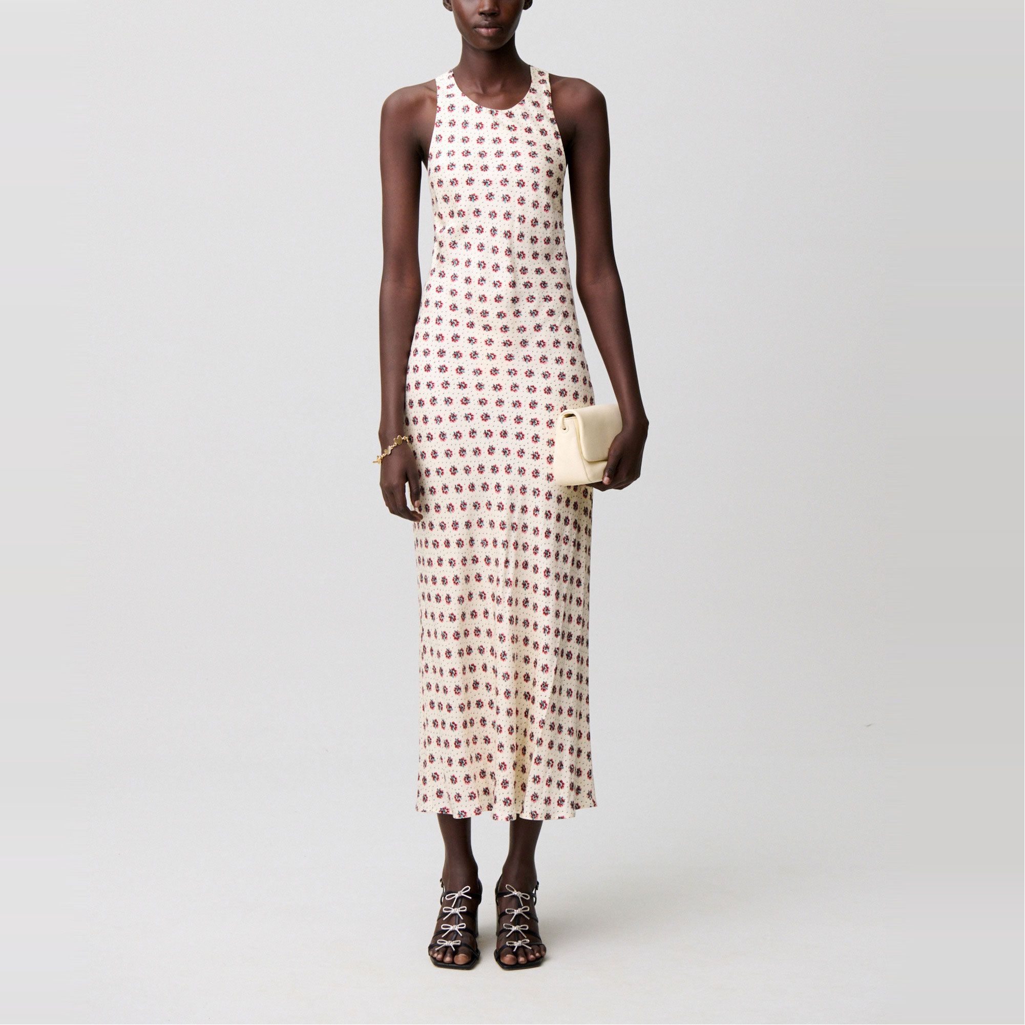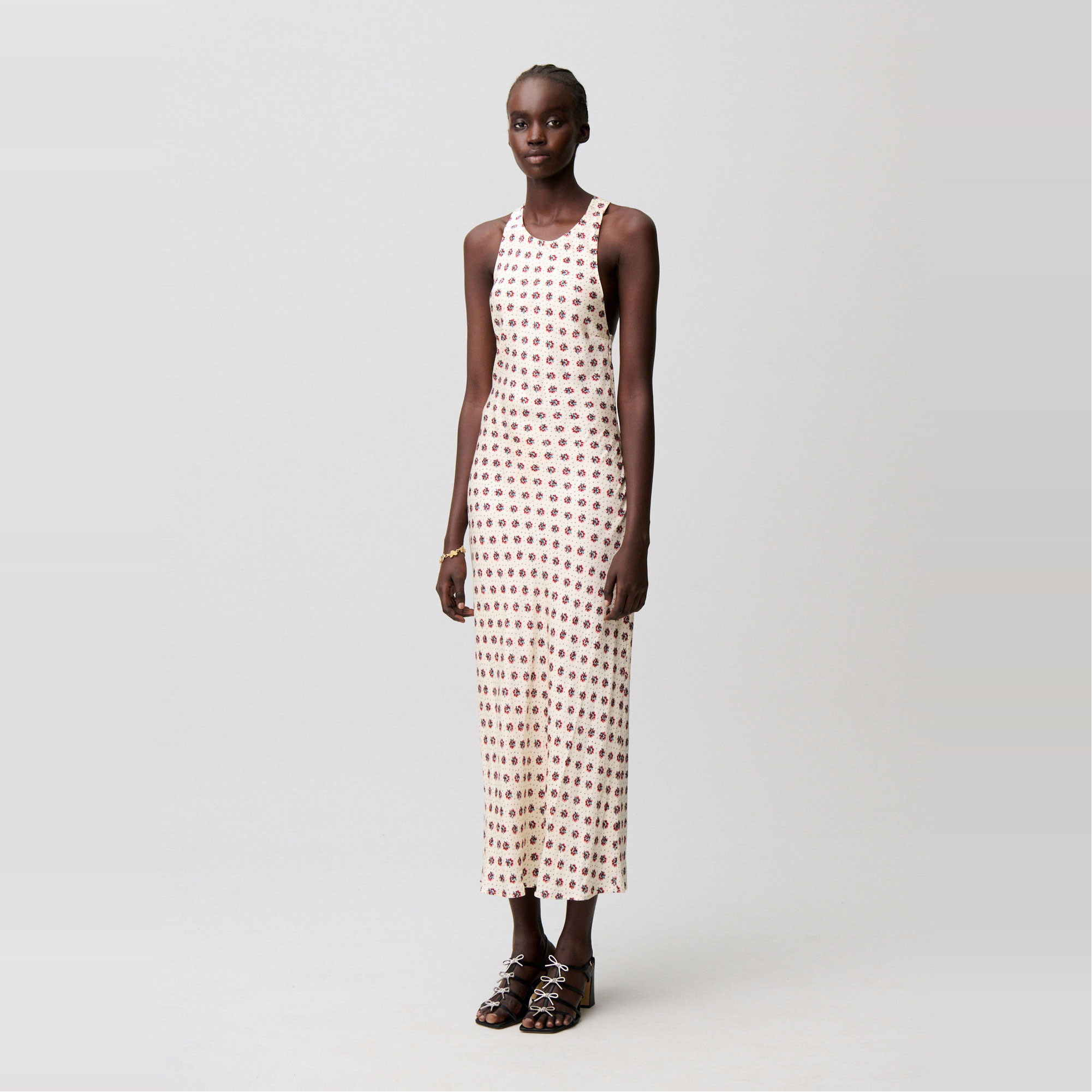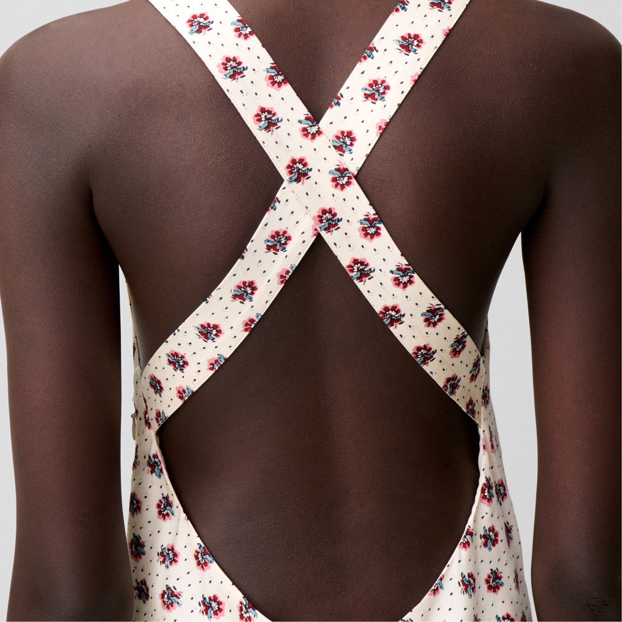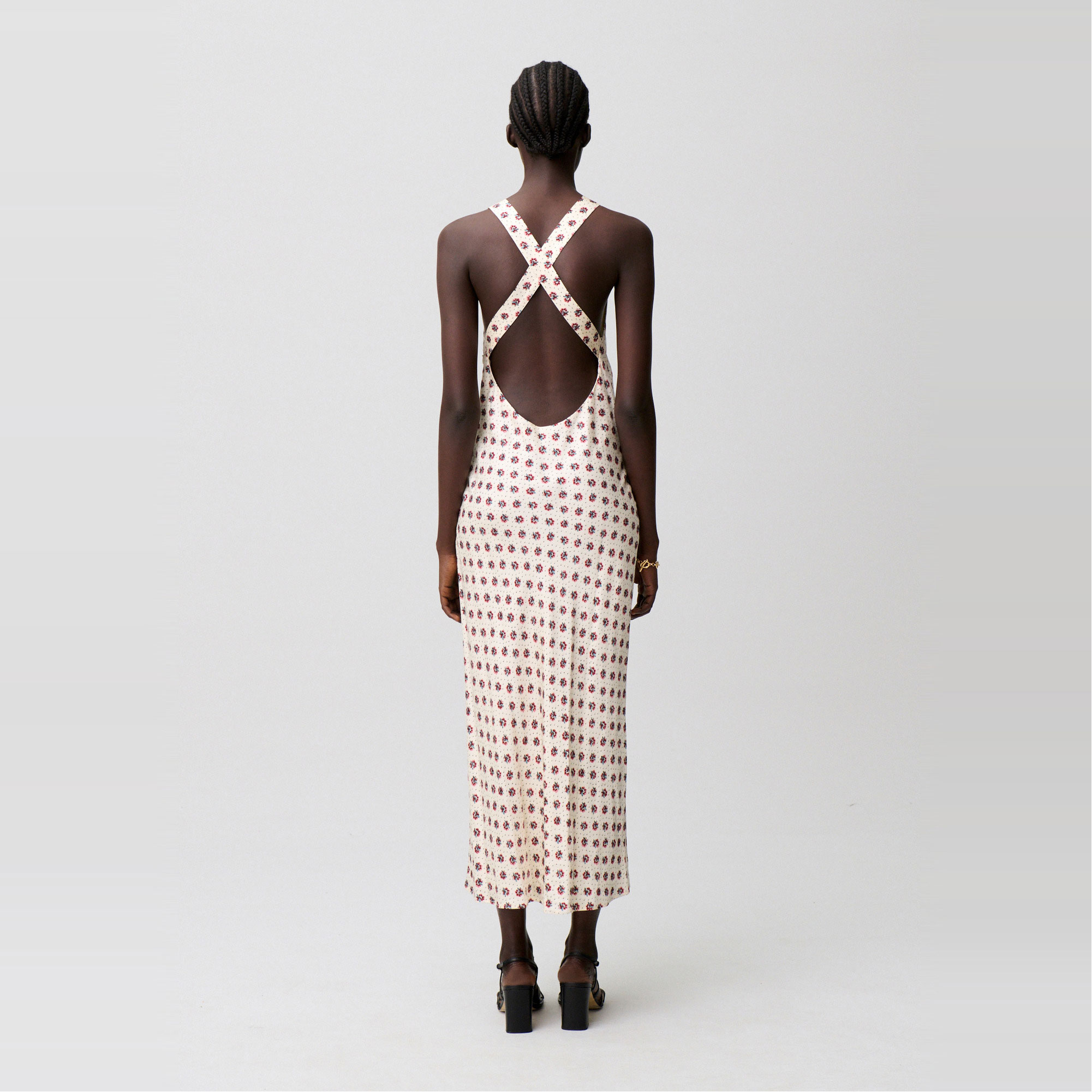 - Printed, satin fabric, maxi length, round neckline, crossover straps, open back, straight silhouette, sleeveless, invisible side zip fastening