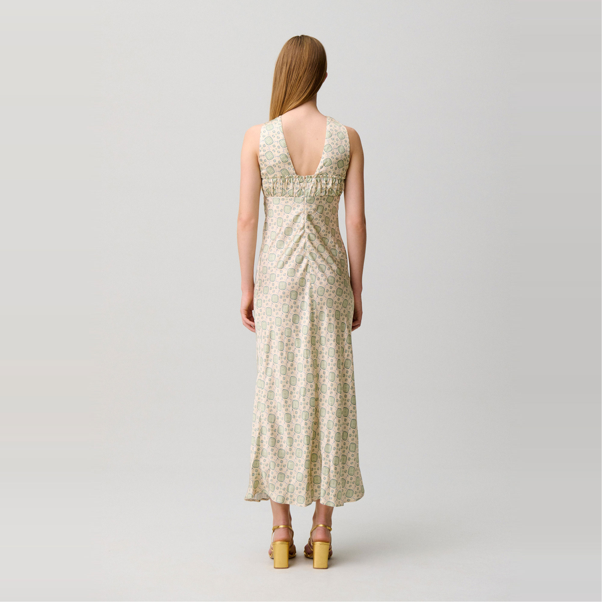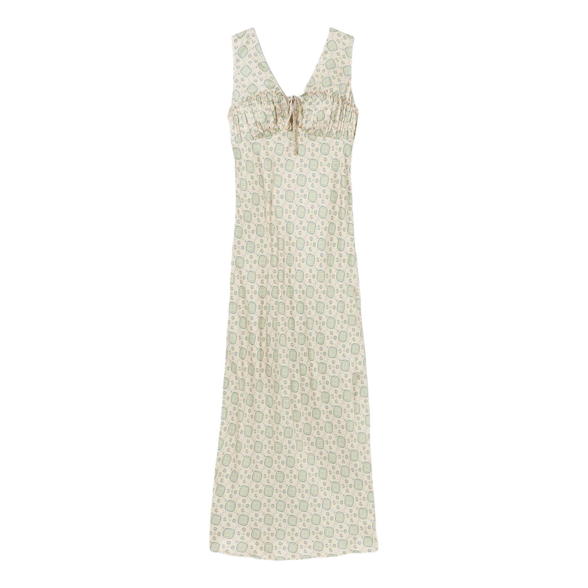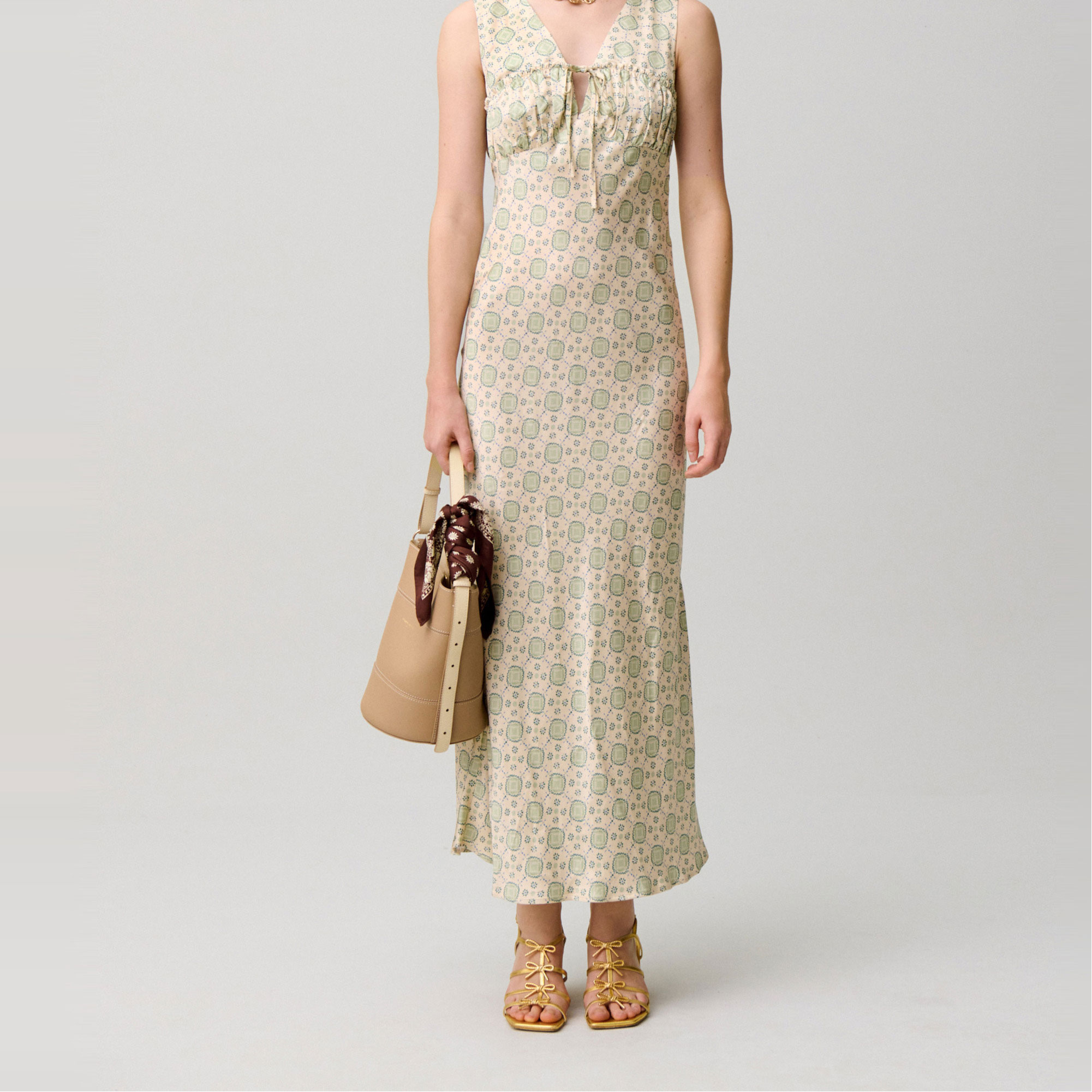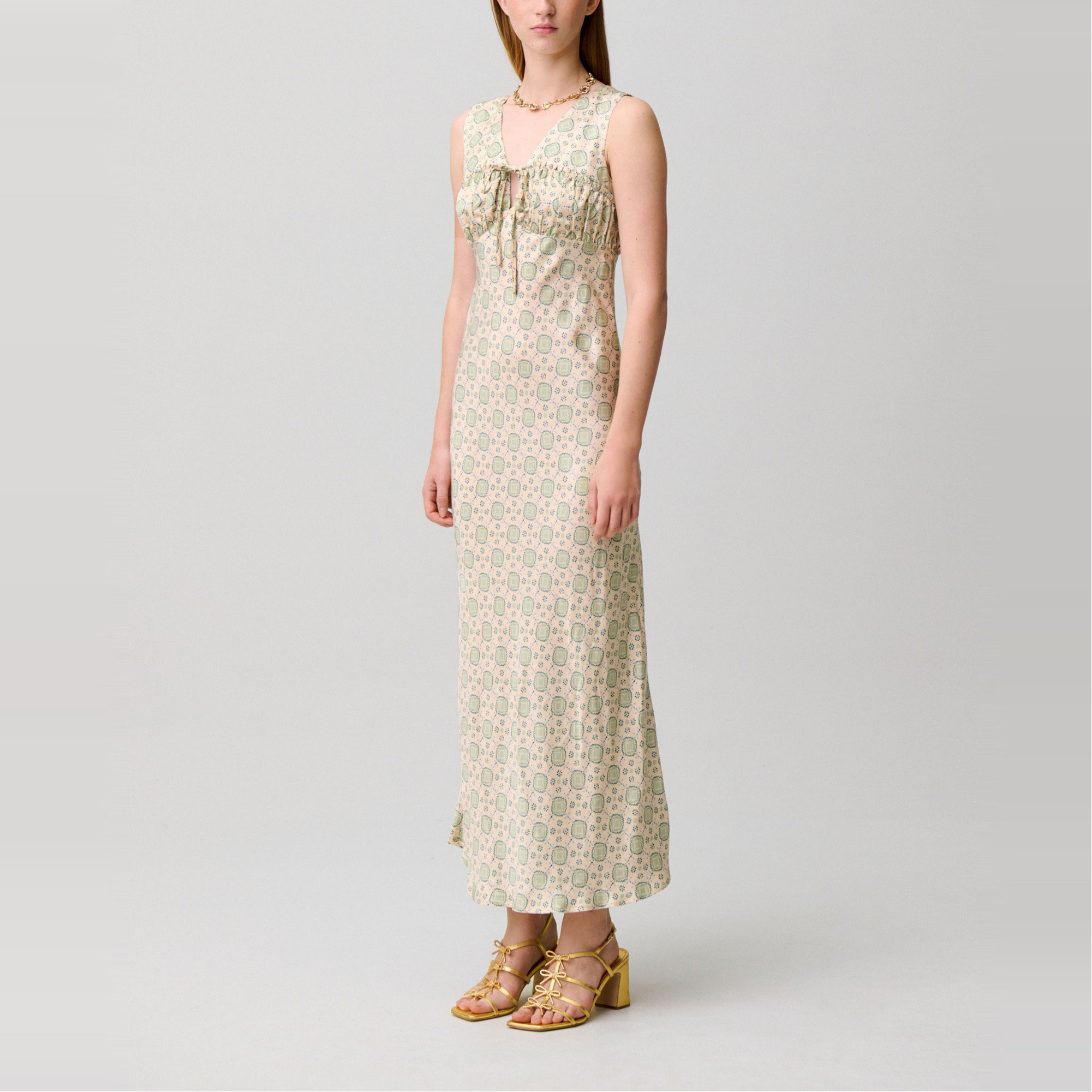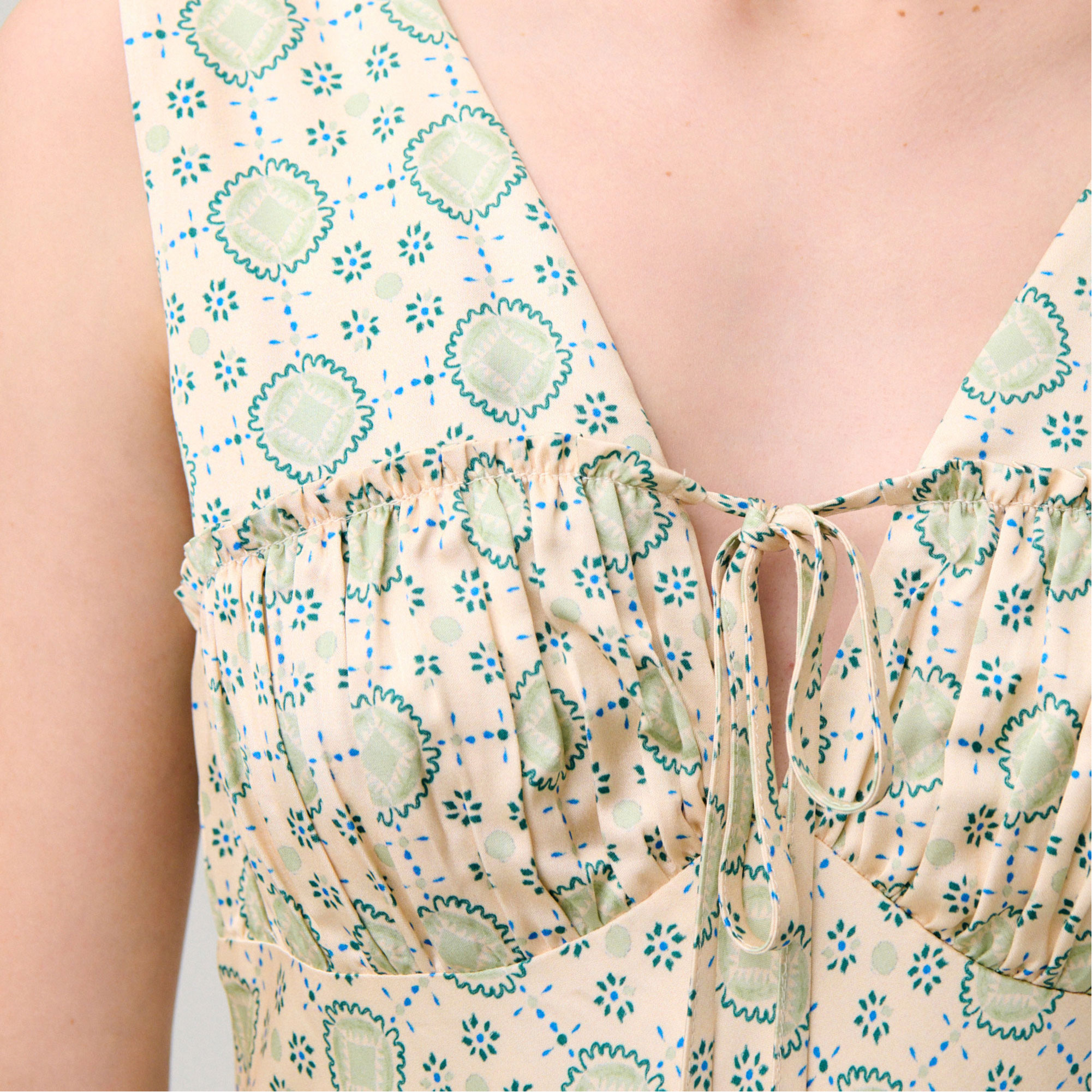 - Sleeveless, printed, satin fabric, maxi length, deep V-neckline, back zip and hook fastening, ruched detail, decorative frill, front tie detail