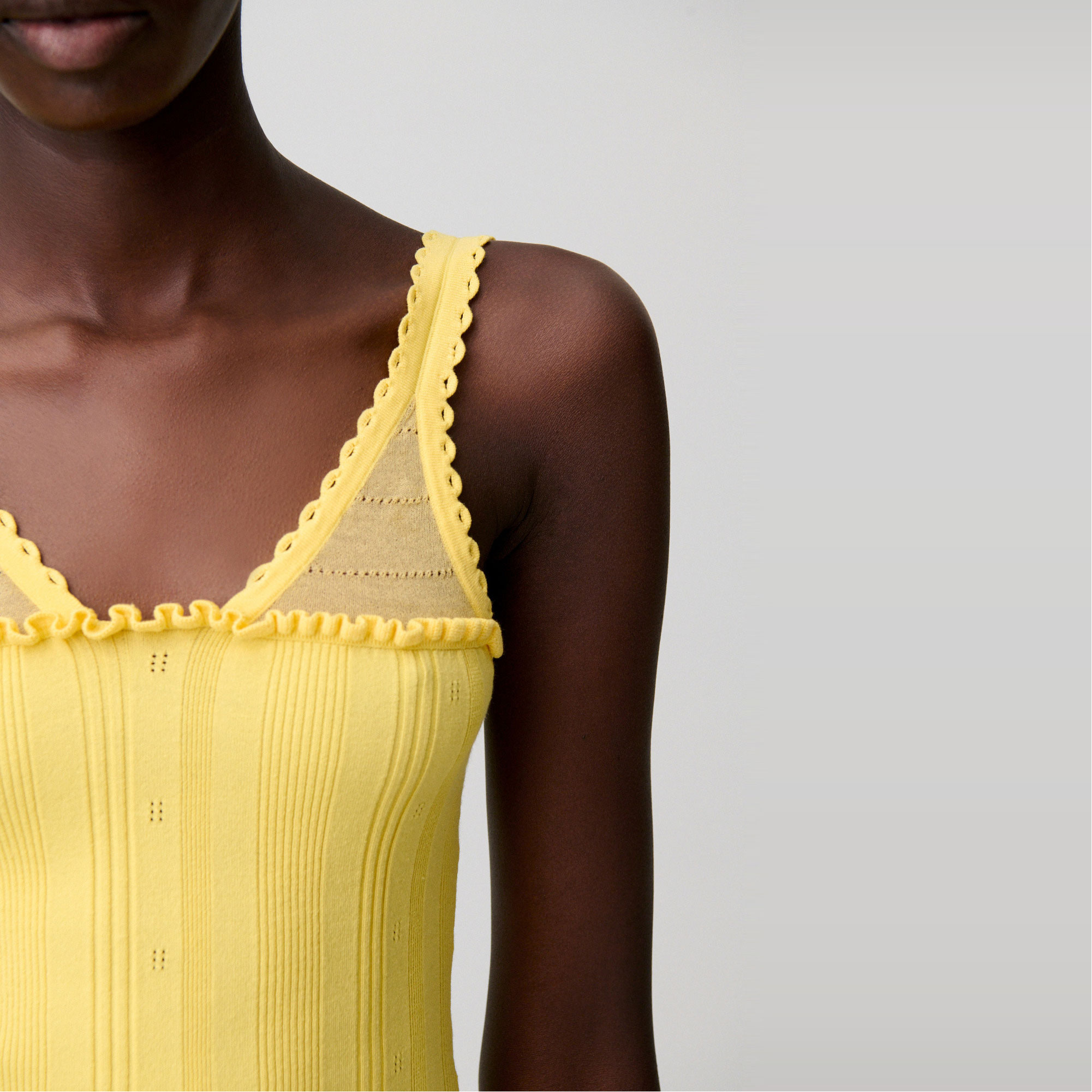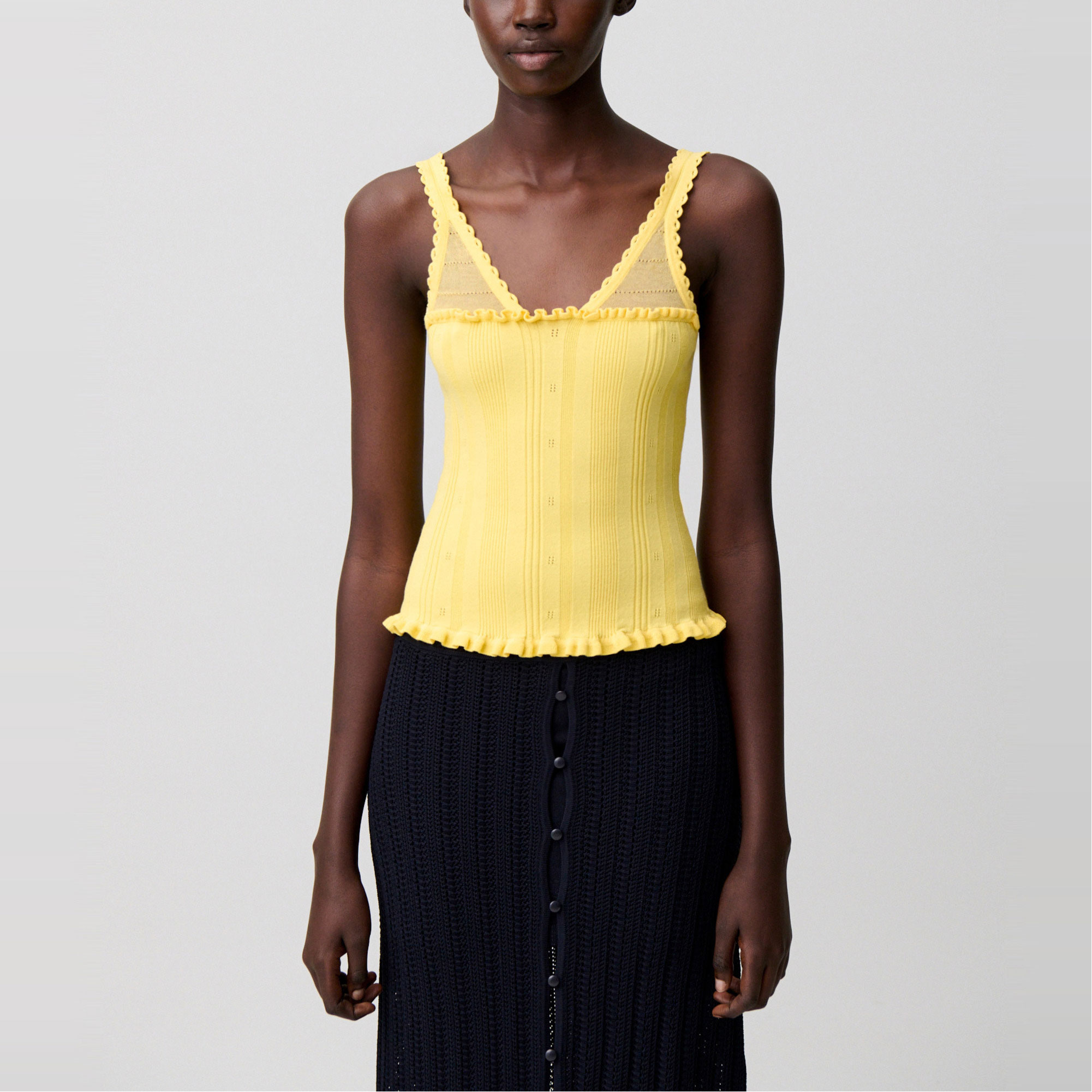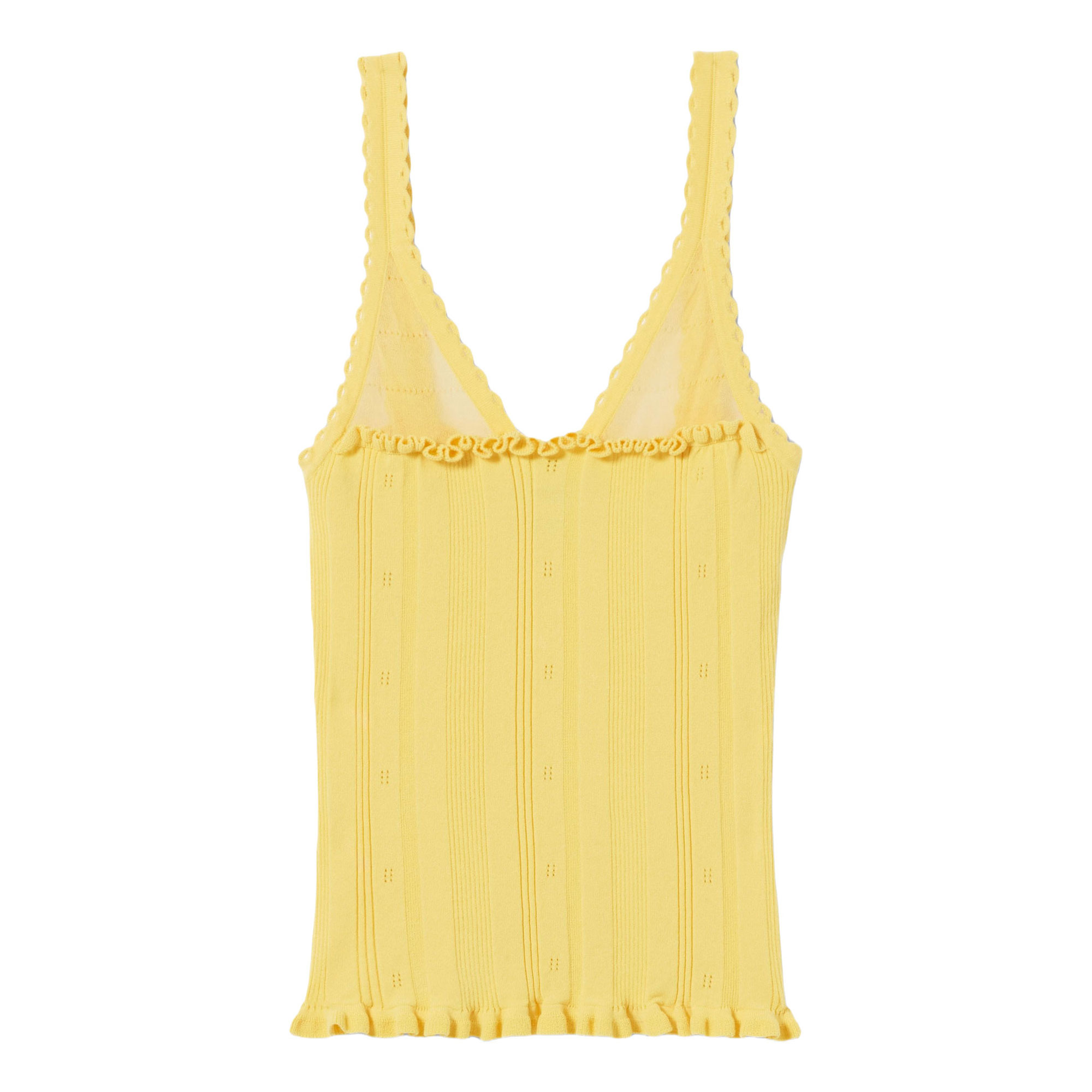 - Knitted, openwork details, front ruffles, fine straps, scoop V-neckline, sheer openwork panel, scalloped finish