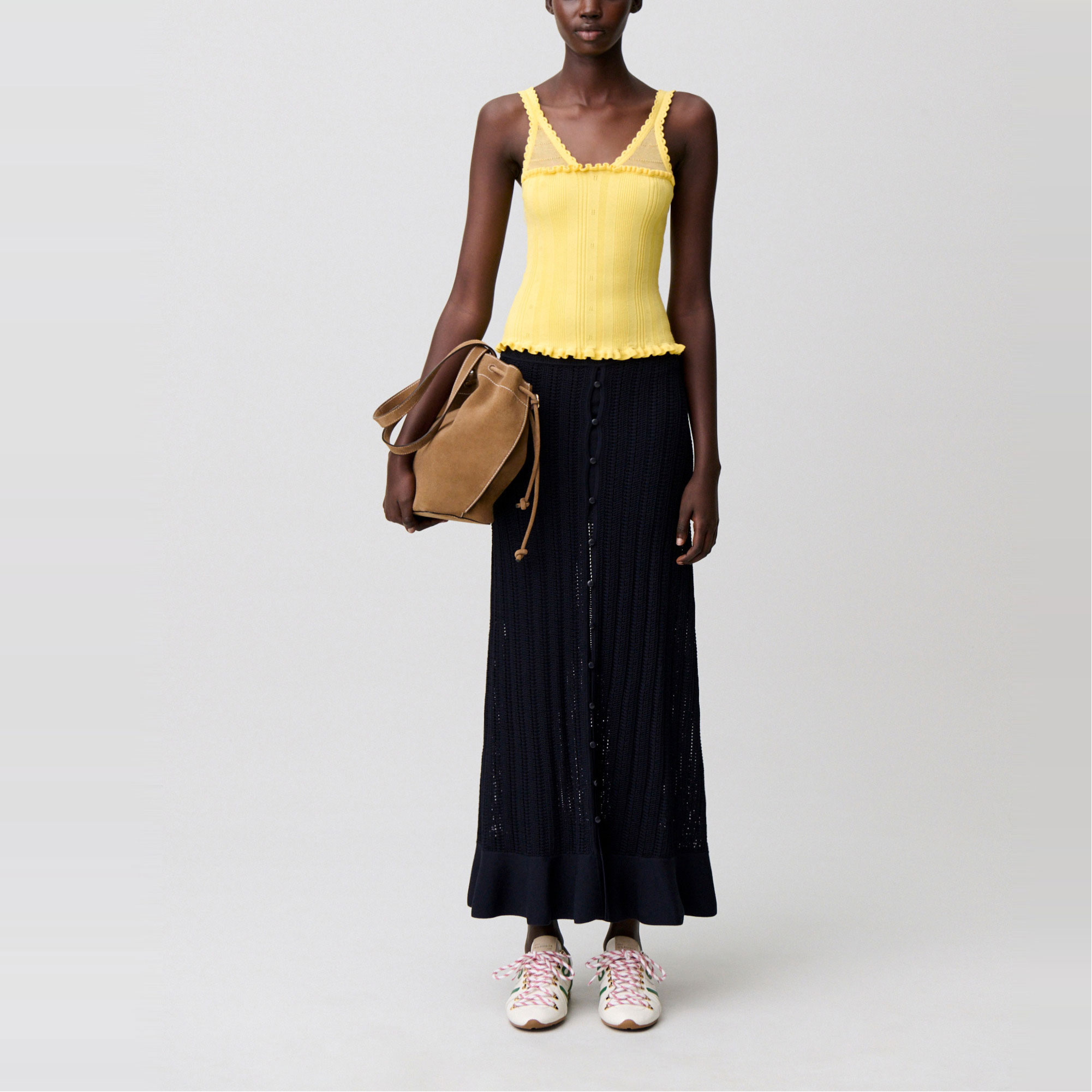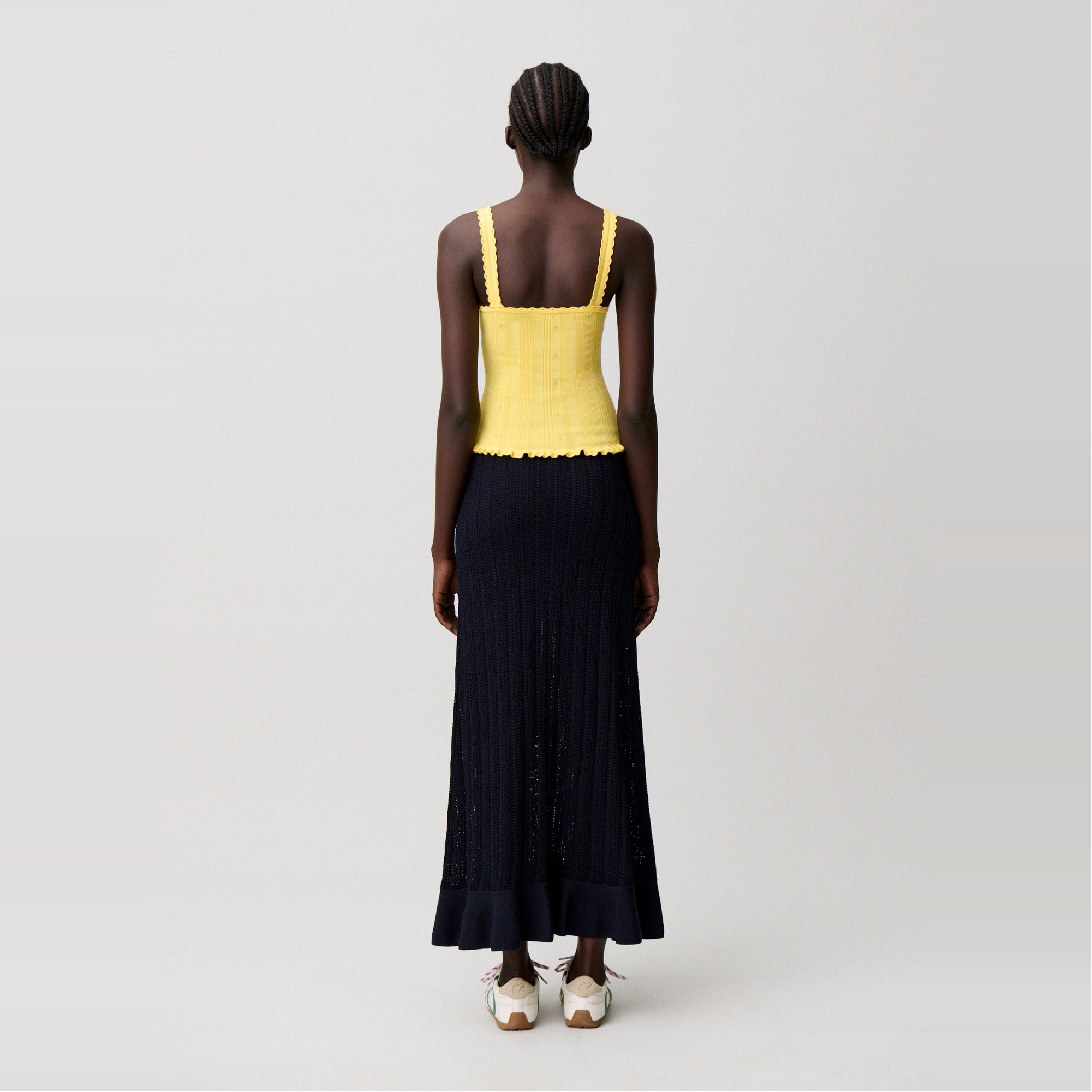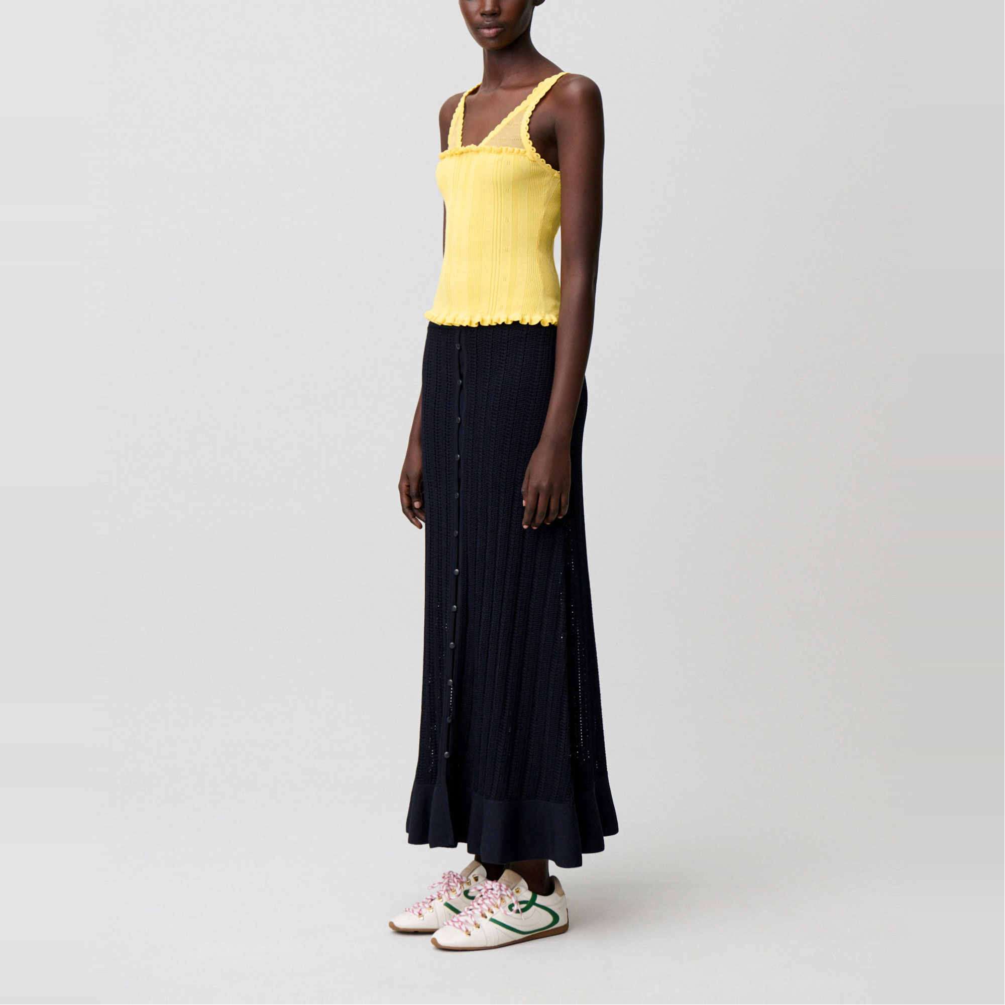 - Knitted, openwork details, front ruffles, fine straps, scoop V-neckline, sheer openwork panel, scalloped finish