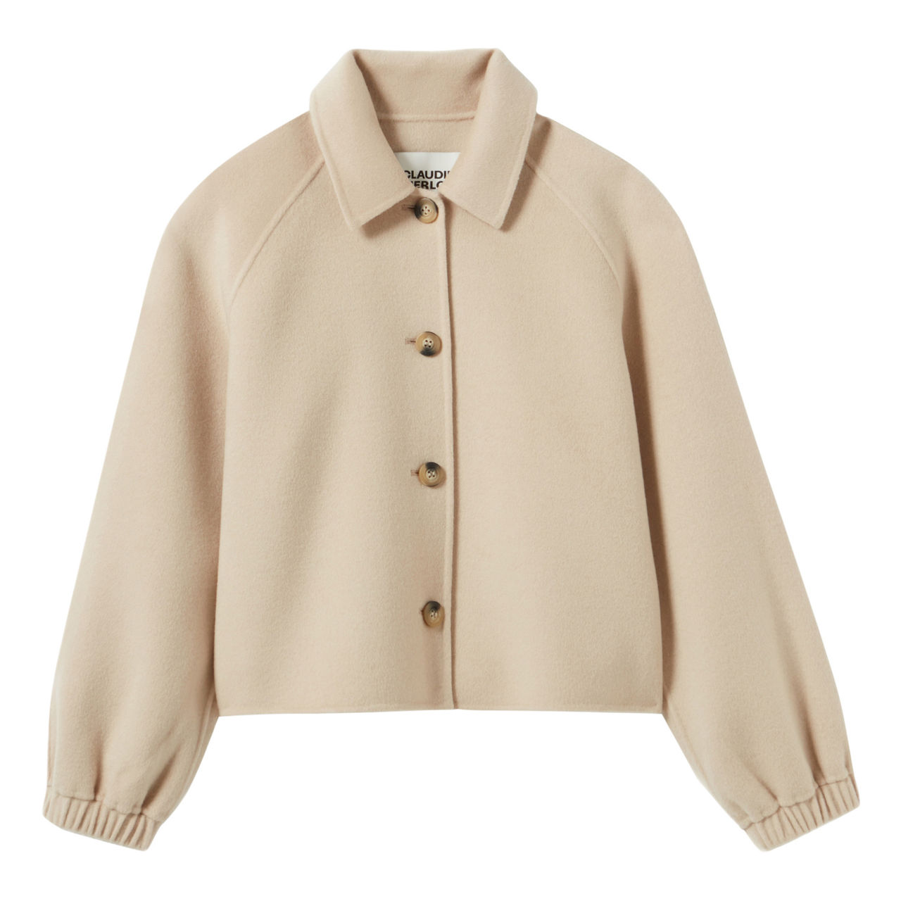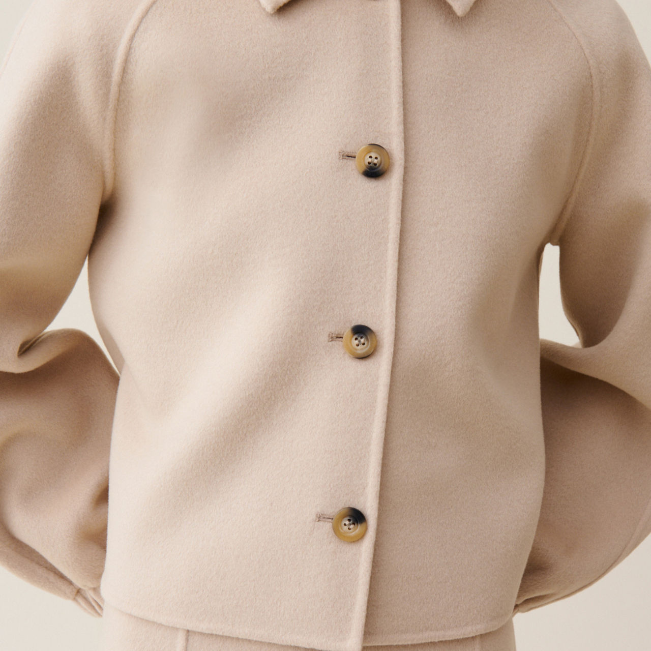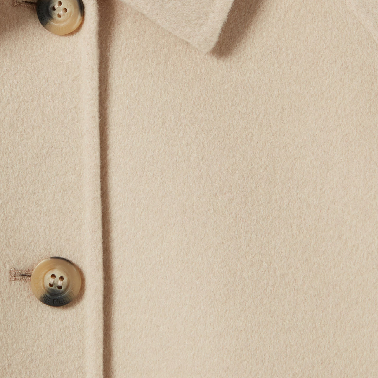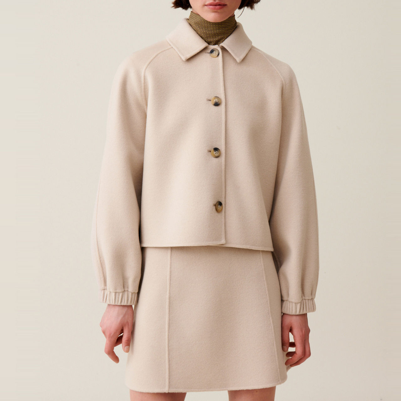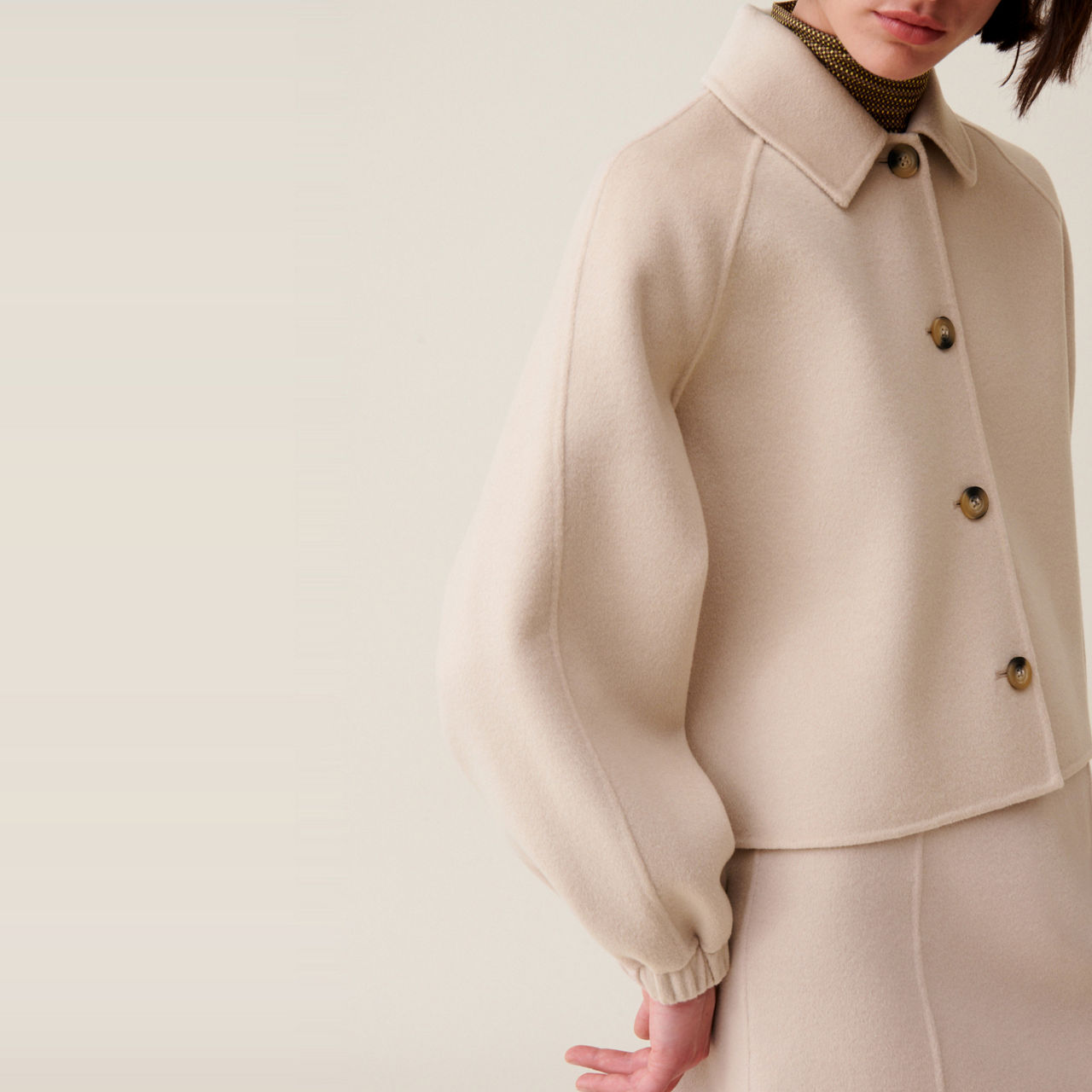 - Pointed collar, long sleeves, button fastening, inverted seams, elasticated cuffs, straight hemline