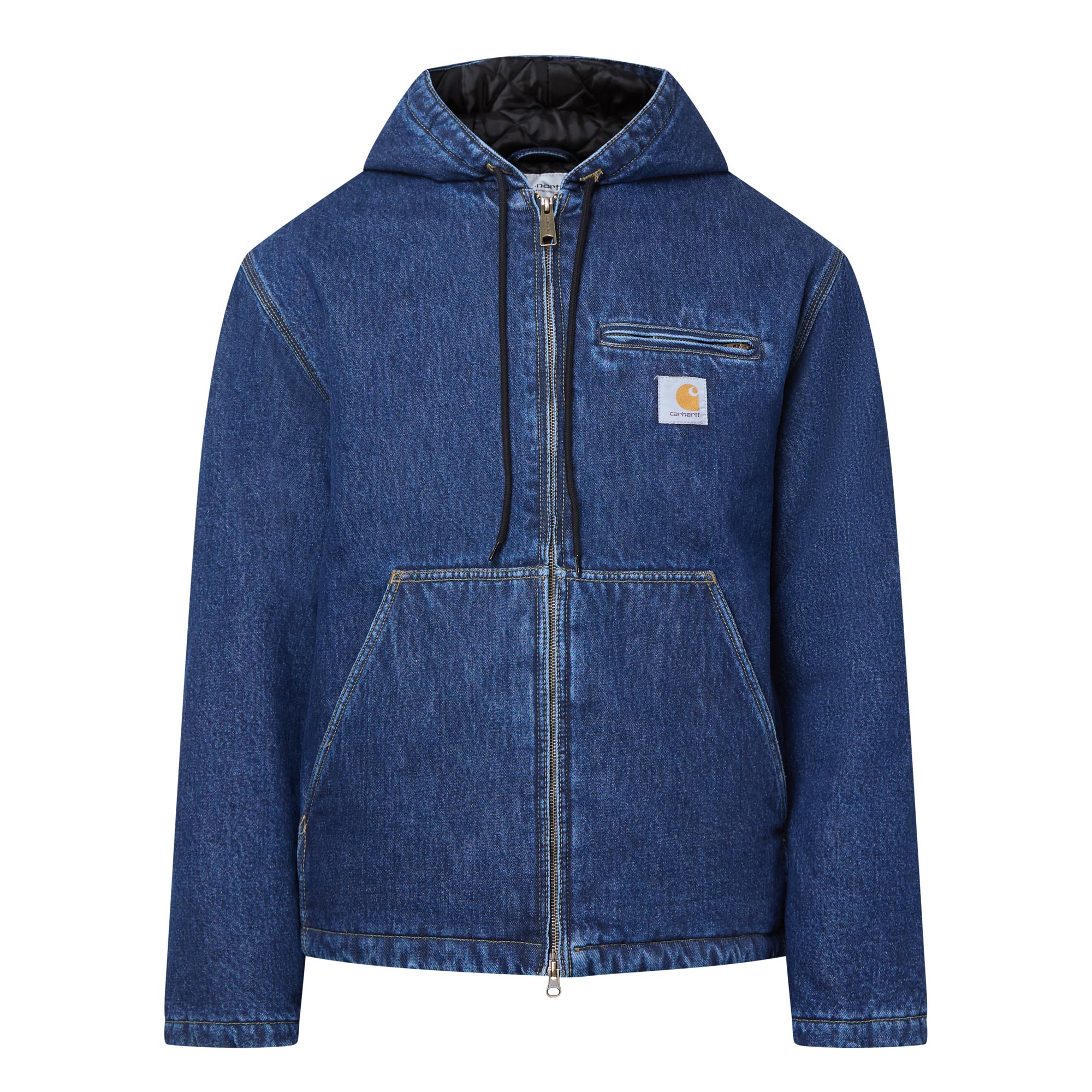 - Hood with drawstring adjustable fit, side entry pockets, two-way zip fastening, square woven logo badge, diamond quilted lining, heavyweight denim fabric, interior chest pocket