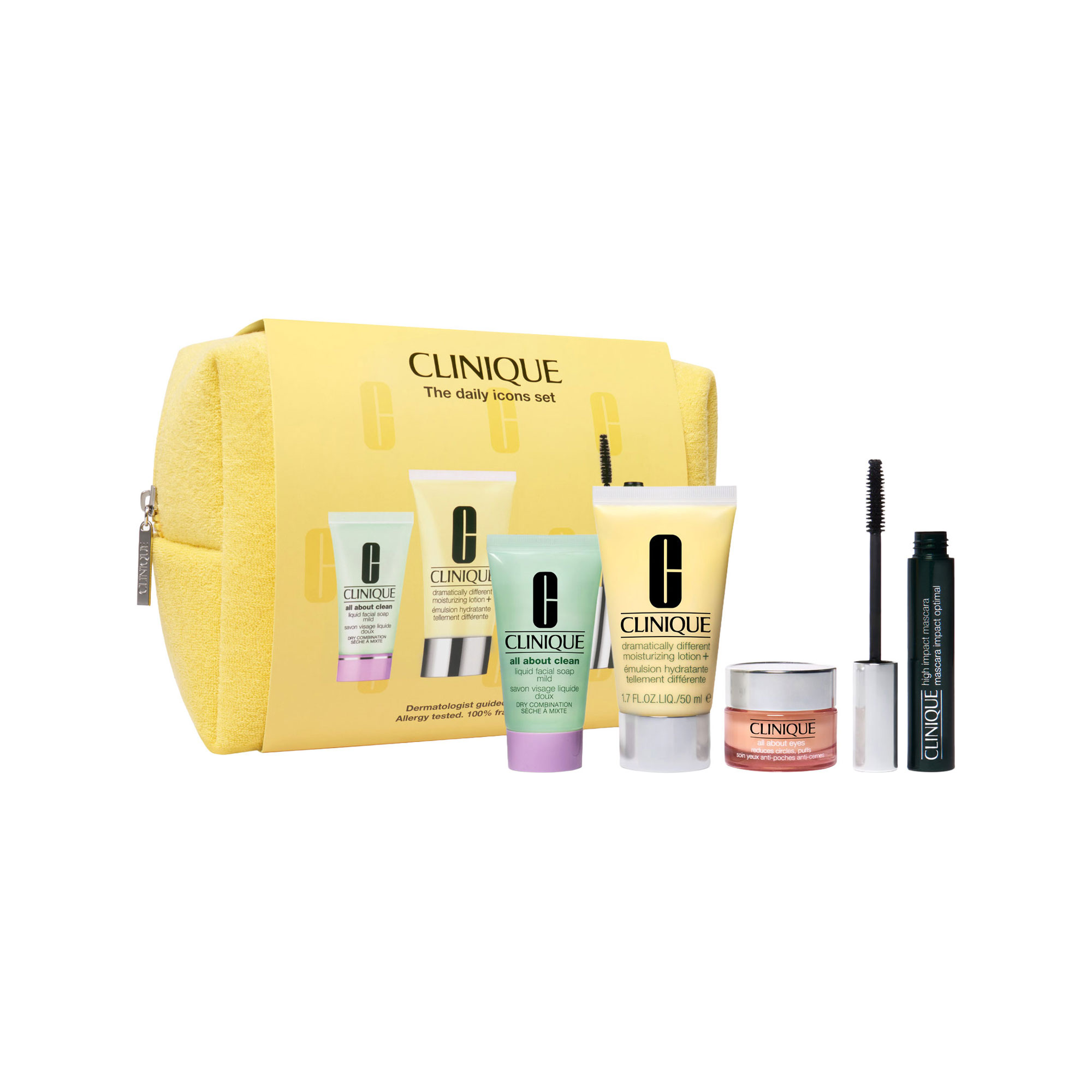 Description: A collection of Clinique skincare and makeup iconic products, including three full-size products and a mini cleanser.