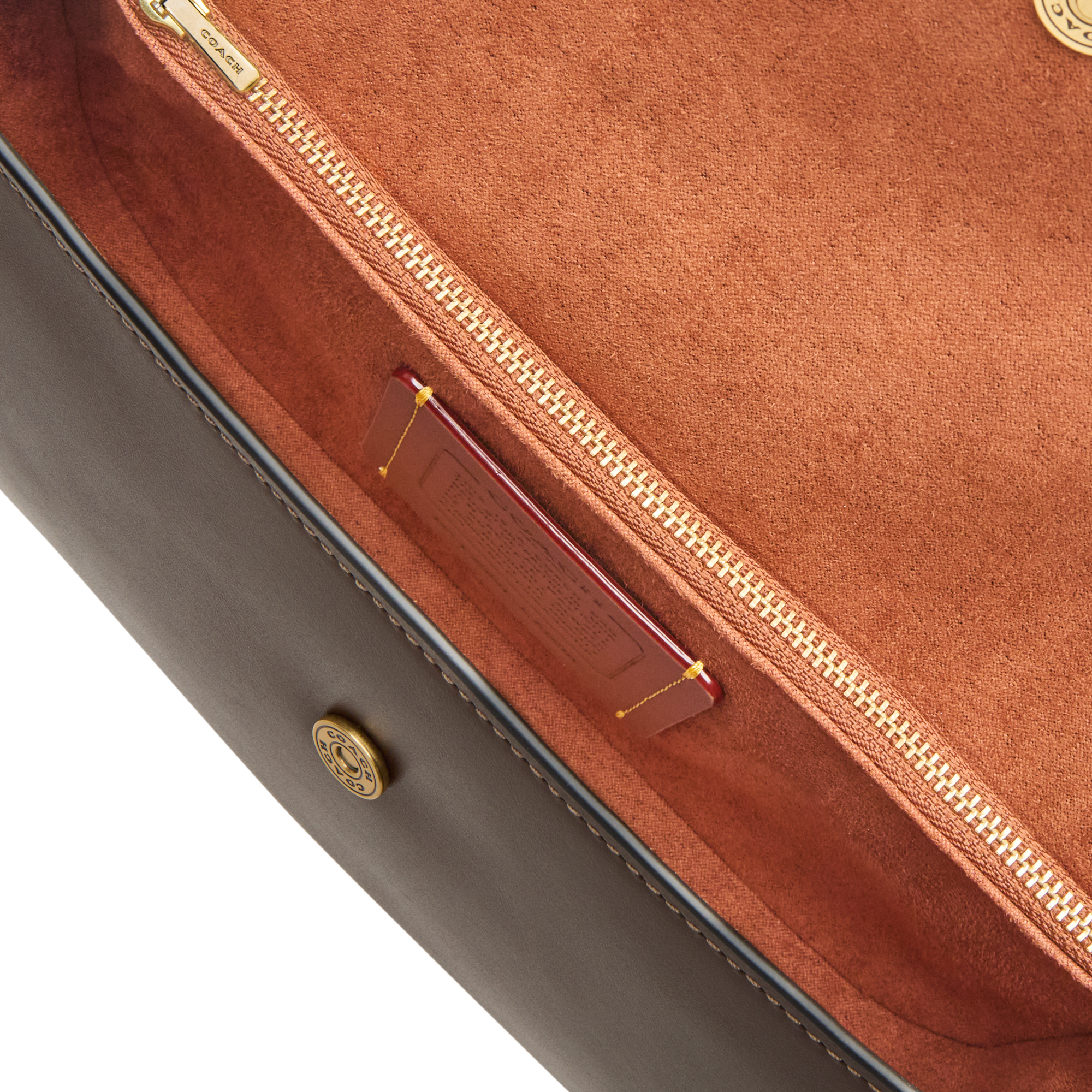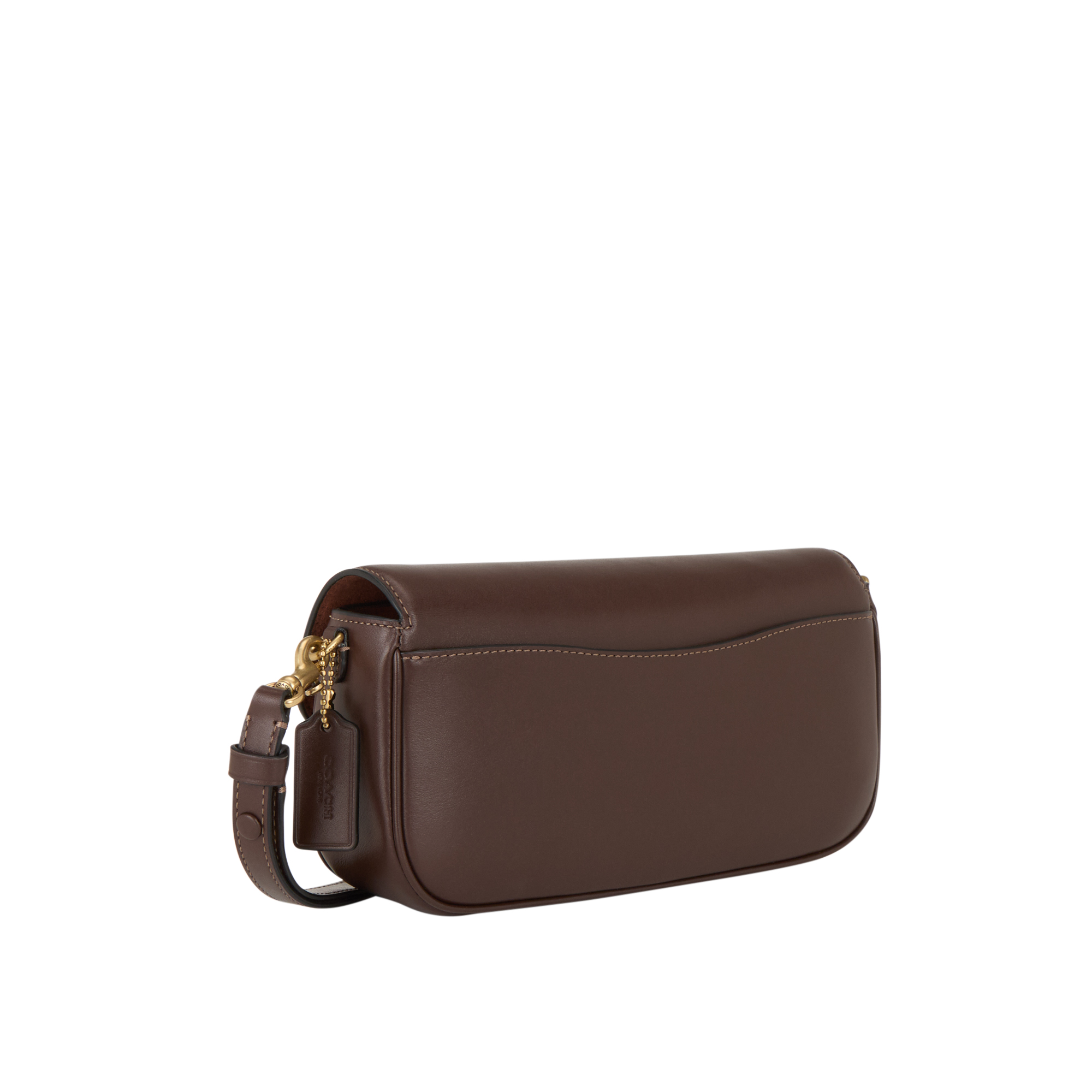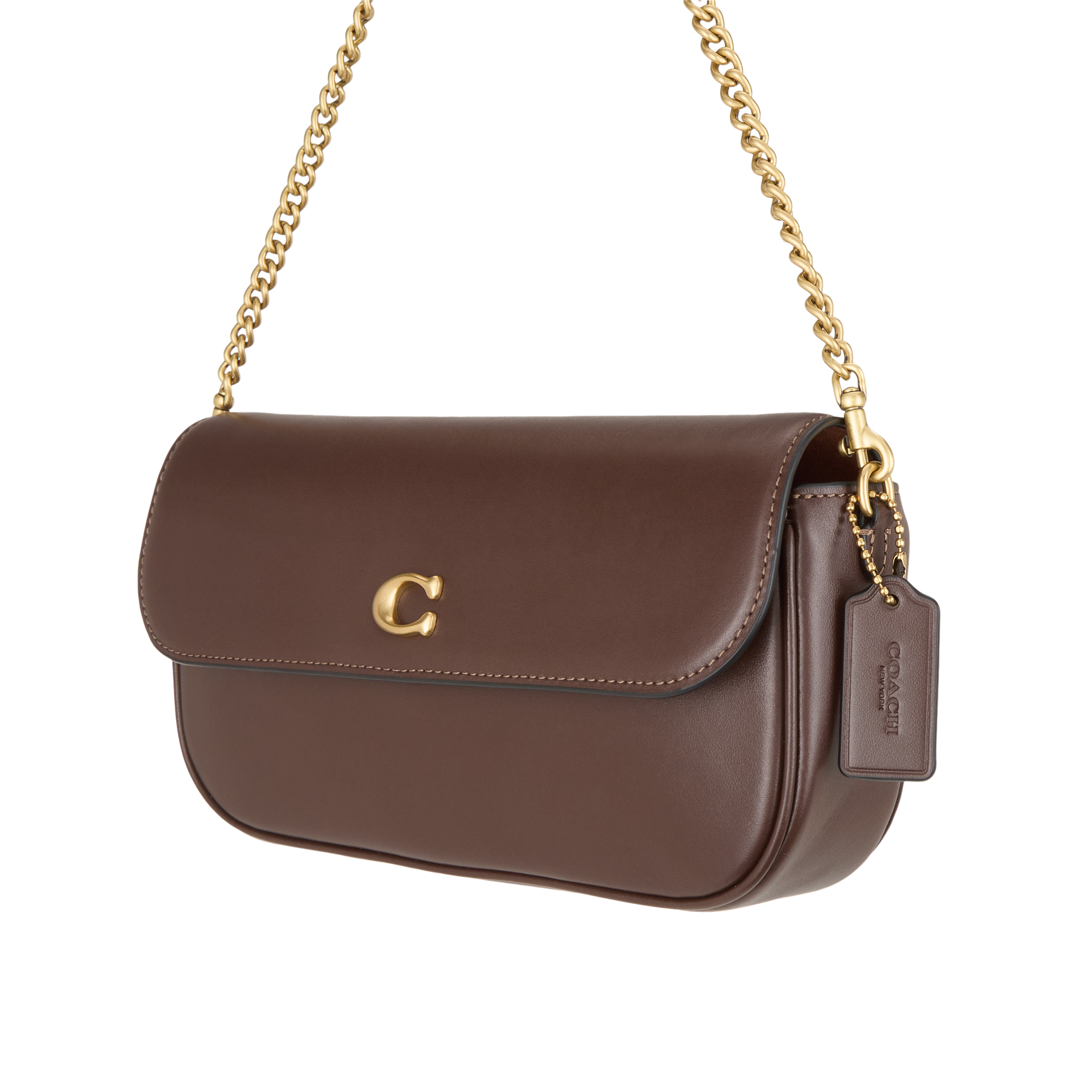 • Foldover flap closure, snap-button fastening, detachable gold-tone chain strap, detachable adjustable leather strap, contrast stitching, front C logo hardware, back slip pocket, attached logo luggage tag, smooth leather finish