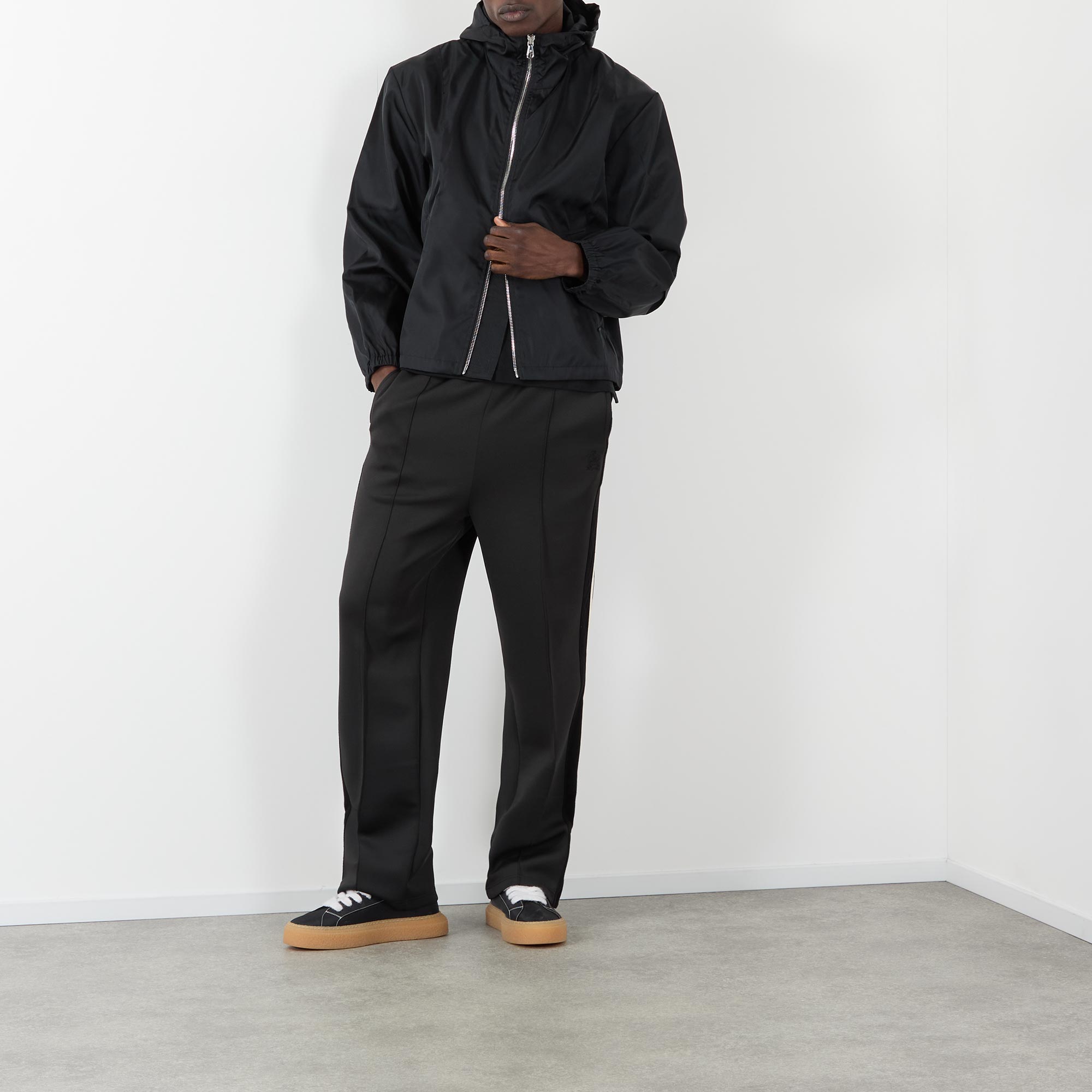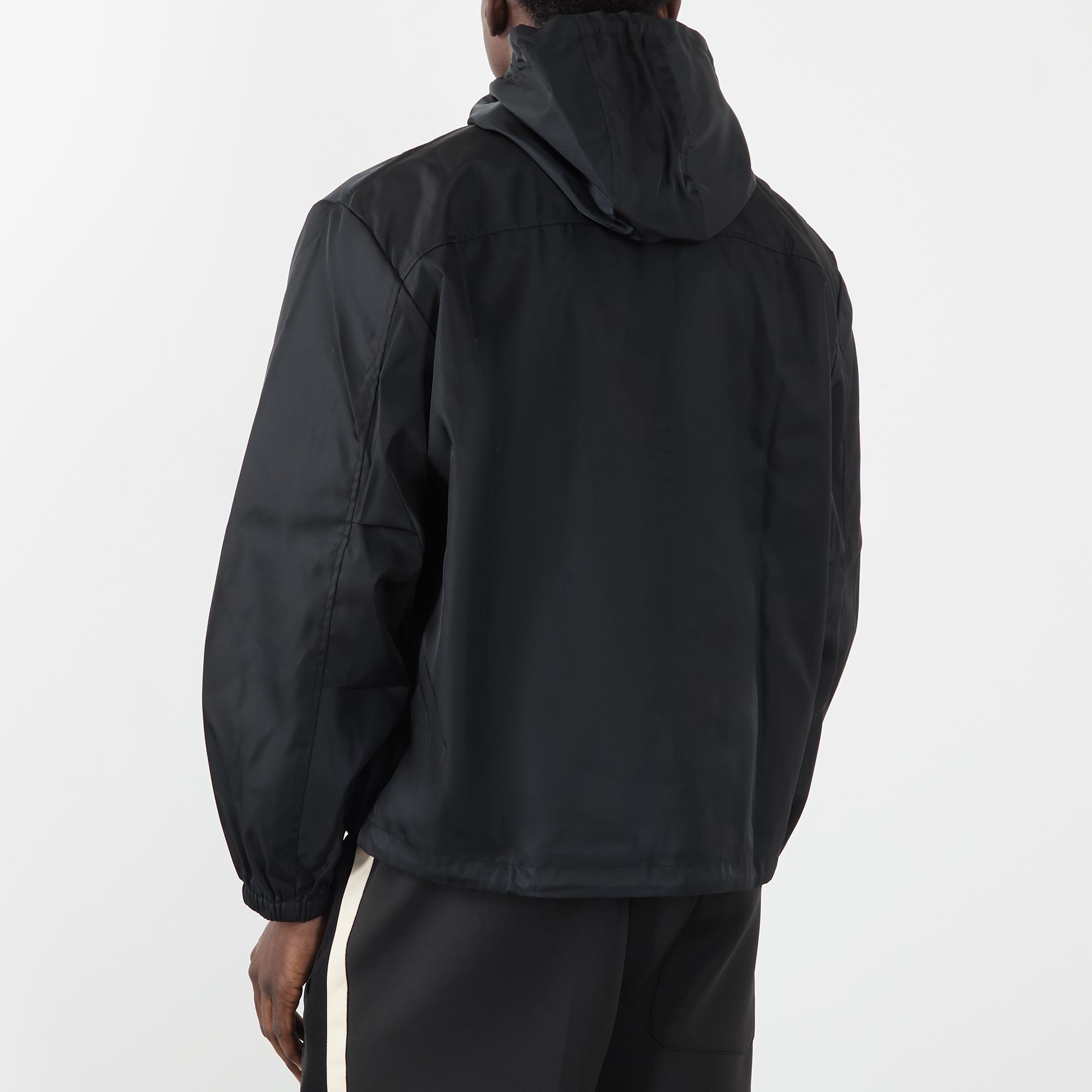 • High neckline, dropped shoulders, long sleeves, elasticated cuffs, branded two-way front zip fastening, two angled welt pockets, straight adjustable hem, lightweight, subtle sheen finish