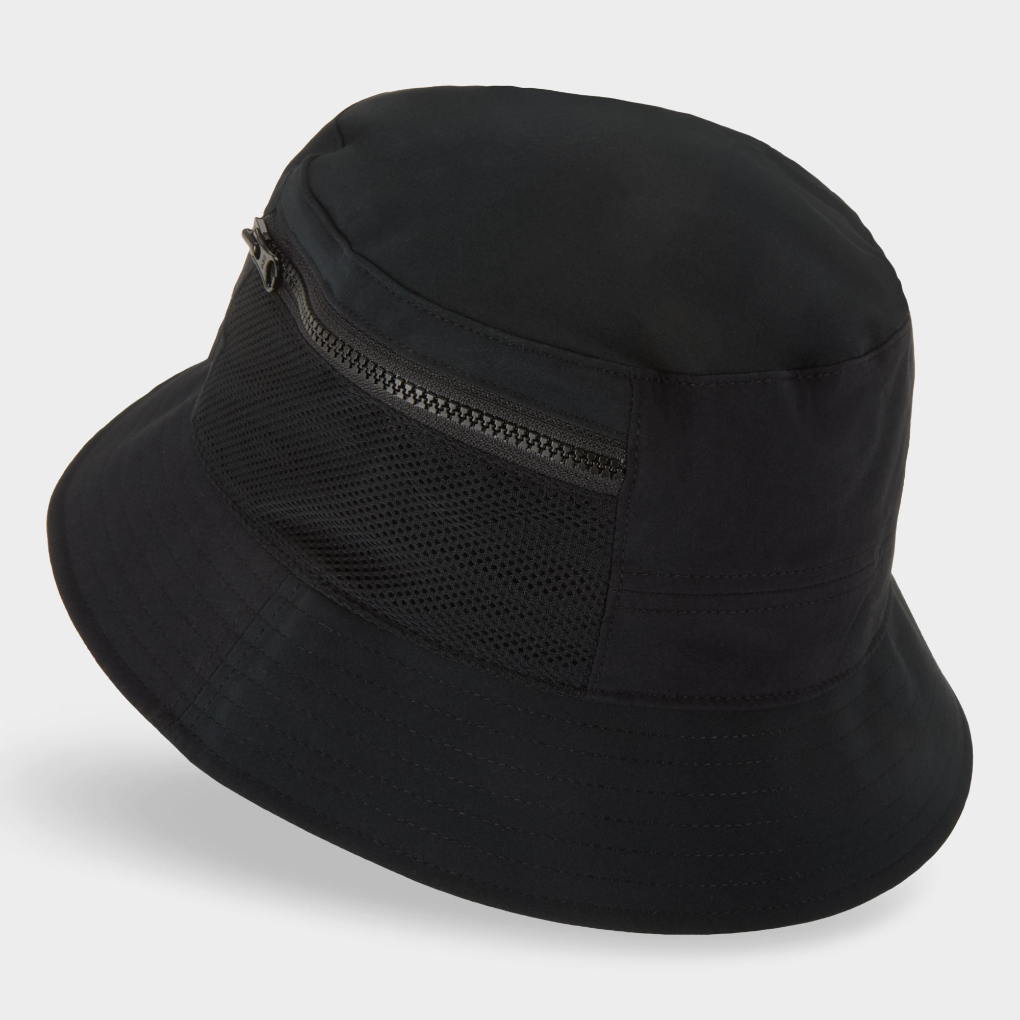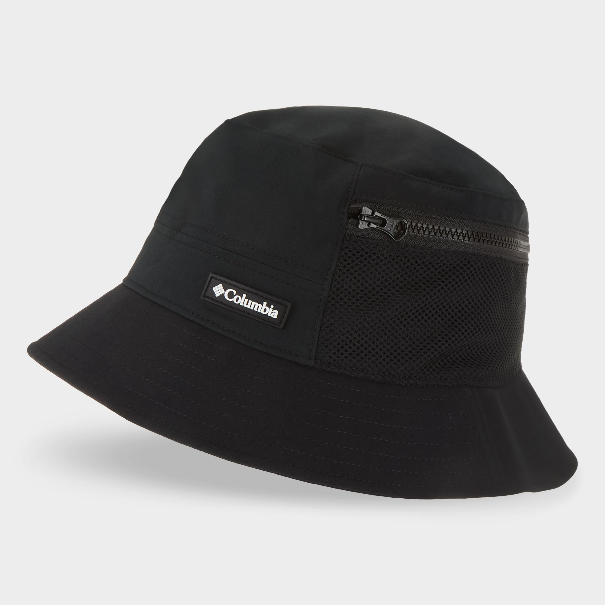 - Bucket style, wide brim, topstitch details, zipped pocket detail, logo badge
