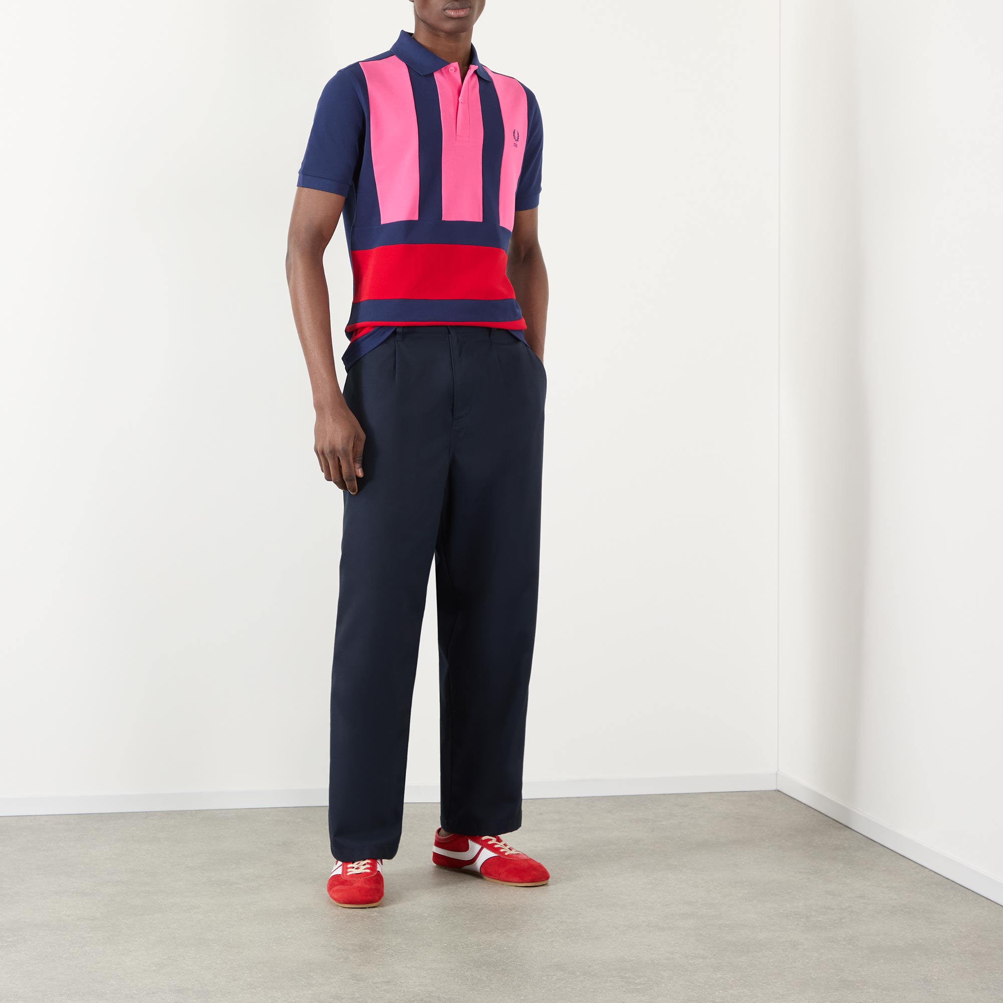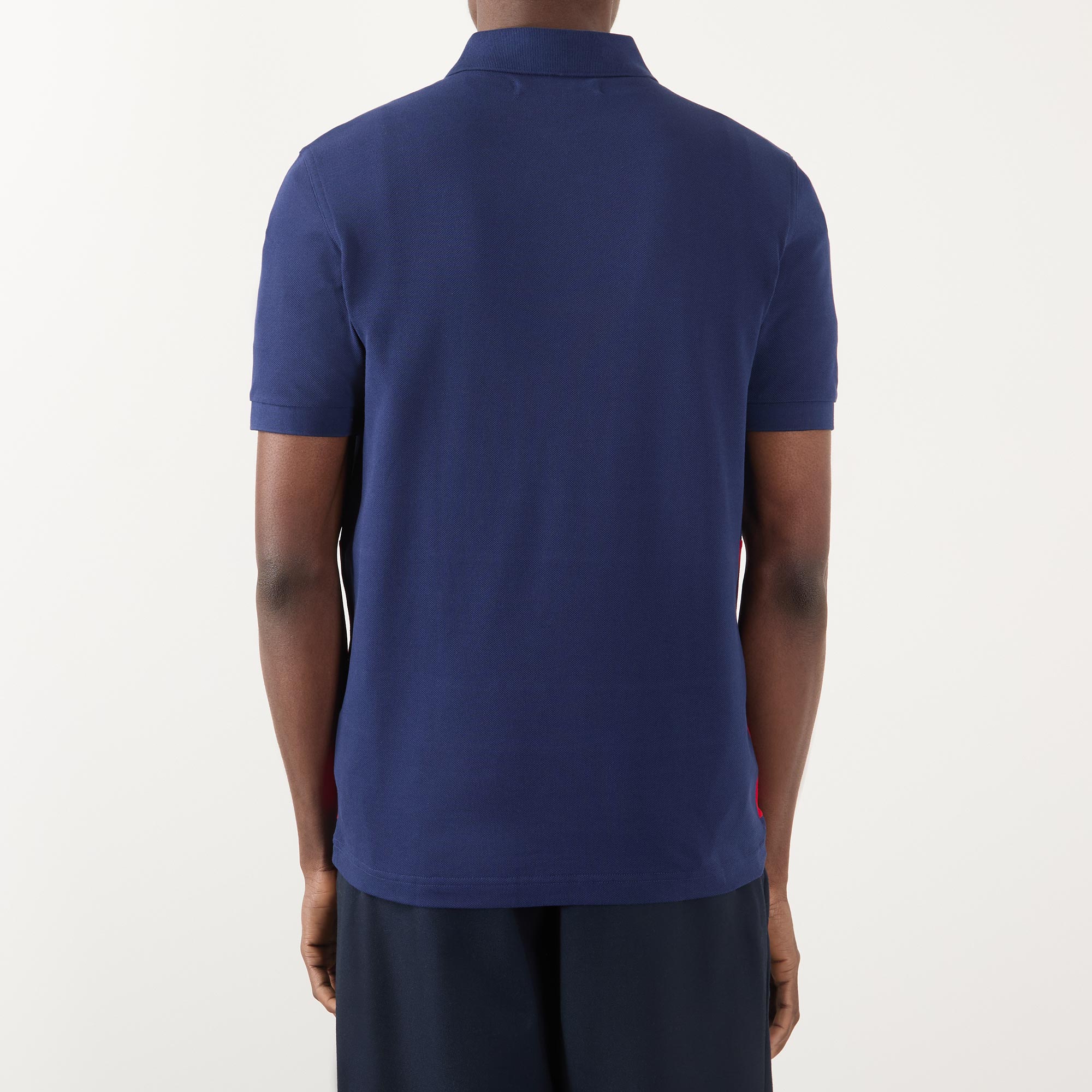 - Polo collar, two-button placket, short sleeves, ribbed cuffs, straight hem, colour-blocked design, logo detail on the chest